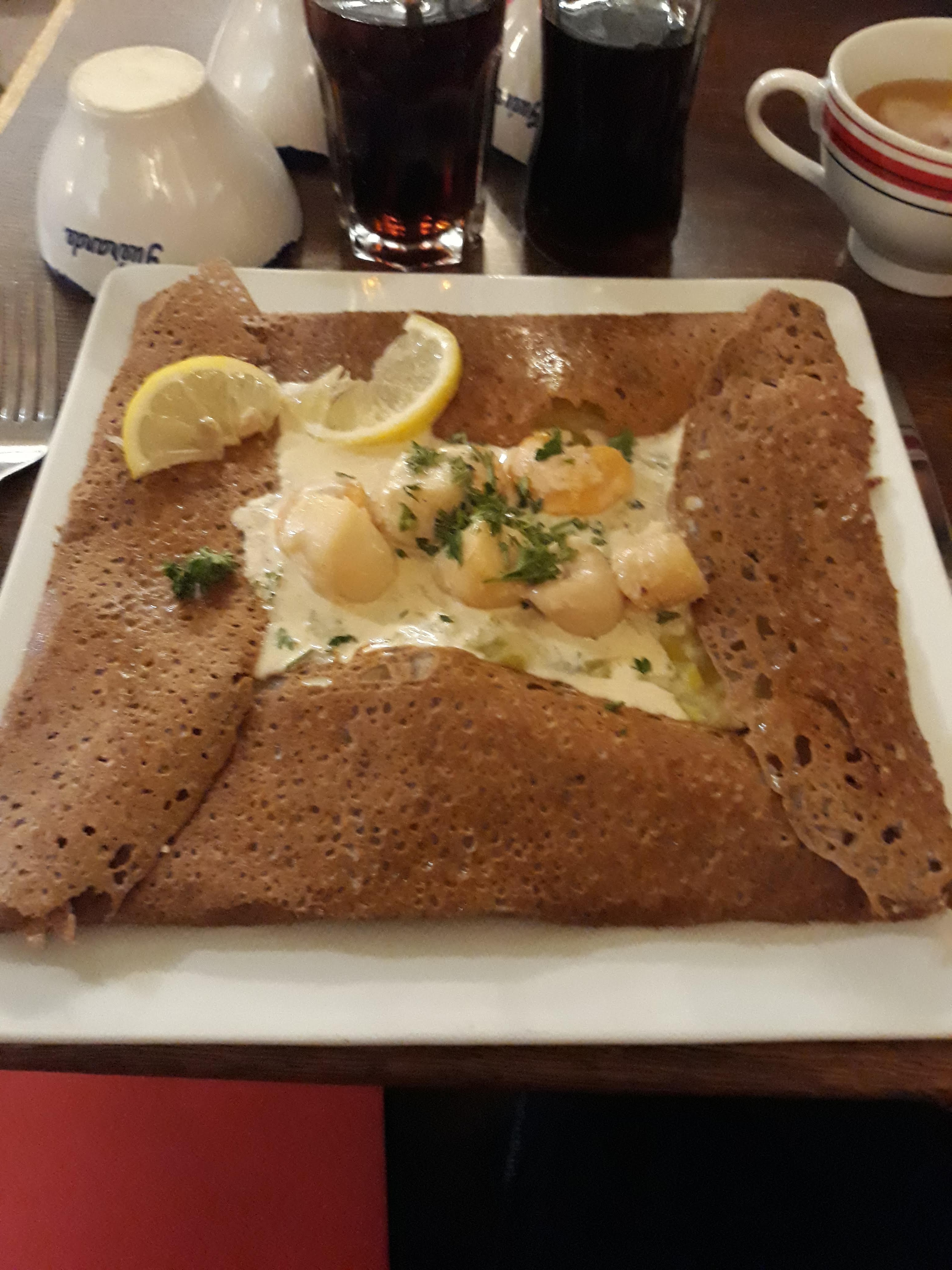 Restaurant bien situé au coeur de guerande. Personnel ok. Nous avons apprécié d avoir eu le temps entra chaque plat. Les galettes étaient pas trop garnies : deux st-Jacques coupées en trois sur une galette,les jambon-emmental sèches. Bref sans plus.
