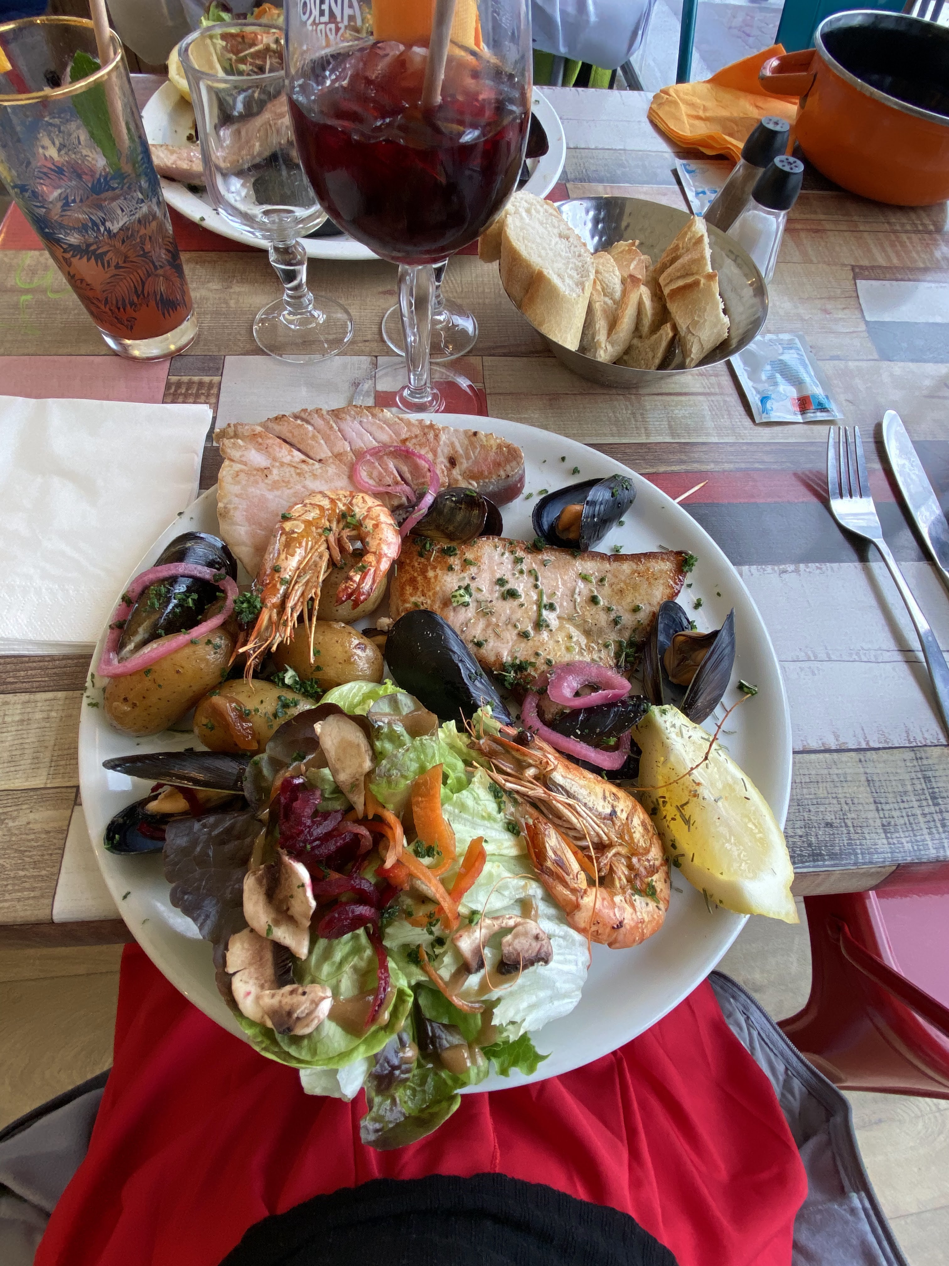 Super restaurant, un saumon mariné delicieux, des sardines a la plancha très bonnes également. Il y avait quelques moules fermées, mais les serveurs ont été très amables et nous ont offert un rhum arrangé. Nous recomandons fortement!