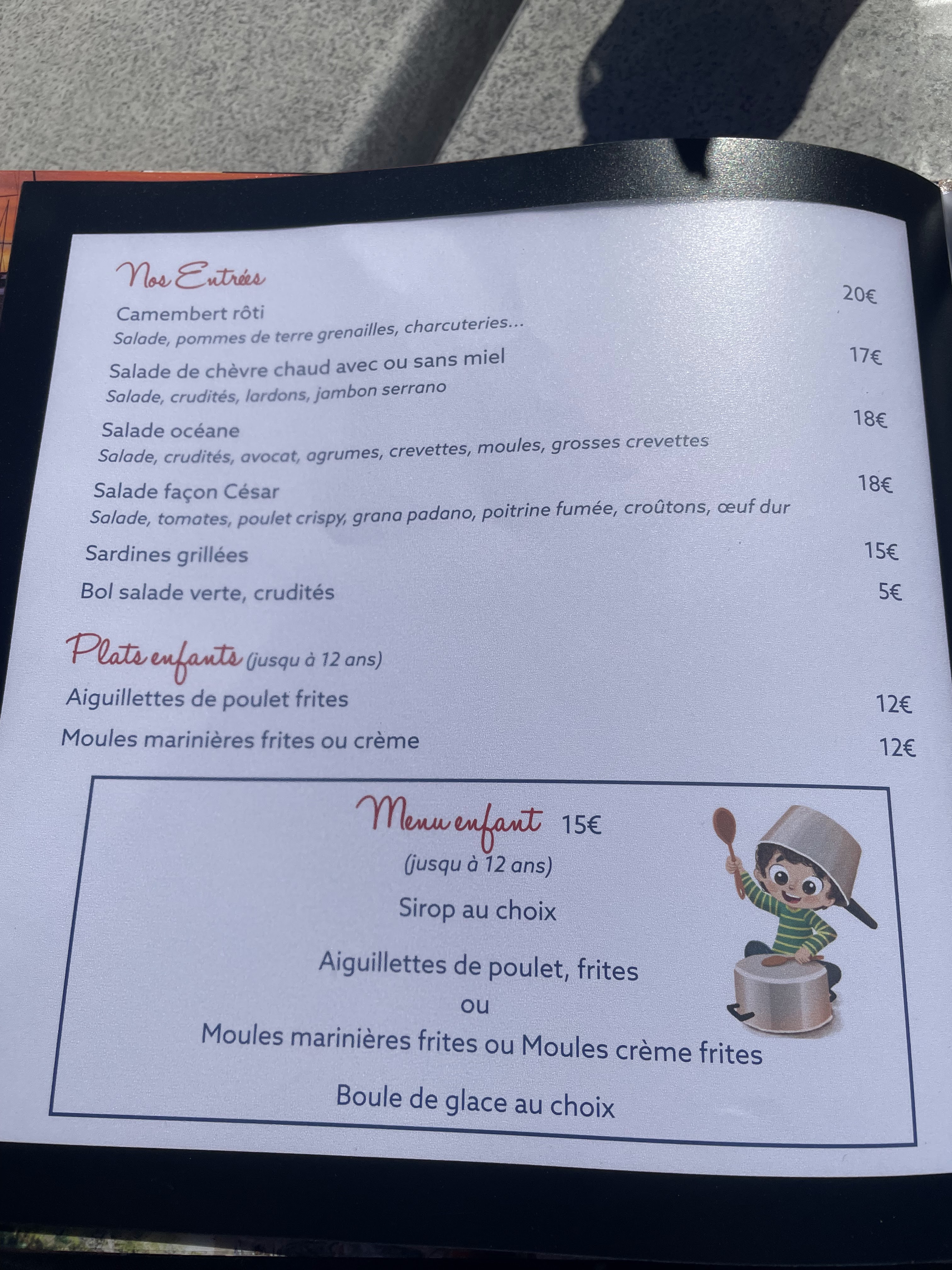 Avis plutôt mitigé sur ce restaurant. Je me baladais afin de trouver un endroit où manger avec ma famille. Je m’arrête à ce restaurant à 11h30 en voulant manger. Nous étions les seuls dans le restaurant. Dès 12h00 passé, le monde attire le monde et le restaurant ce rempli. Nous avons ressenti un personnel peu sympathique, un peu brusque et à la tendance à oublier les choses. Cela est dommage car le cadre est top. Le menu enfant a 15€ pour des frites surgelées et deux bouts de poulet…. ça passe pas trop ça. Sinon la demande de salade et de ne pas mettre de viande à laisser le serveur perplexe et nous regardant comme si nous demandions quelque chose d’extraordinaire. En globalité pas trop séduit, j’essayerais d’autres restaurants du port.