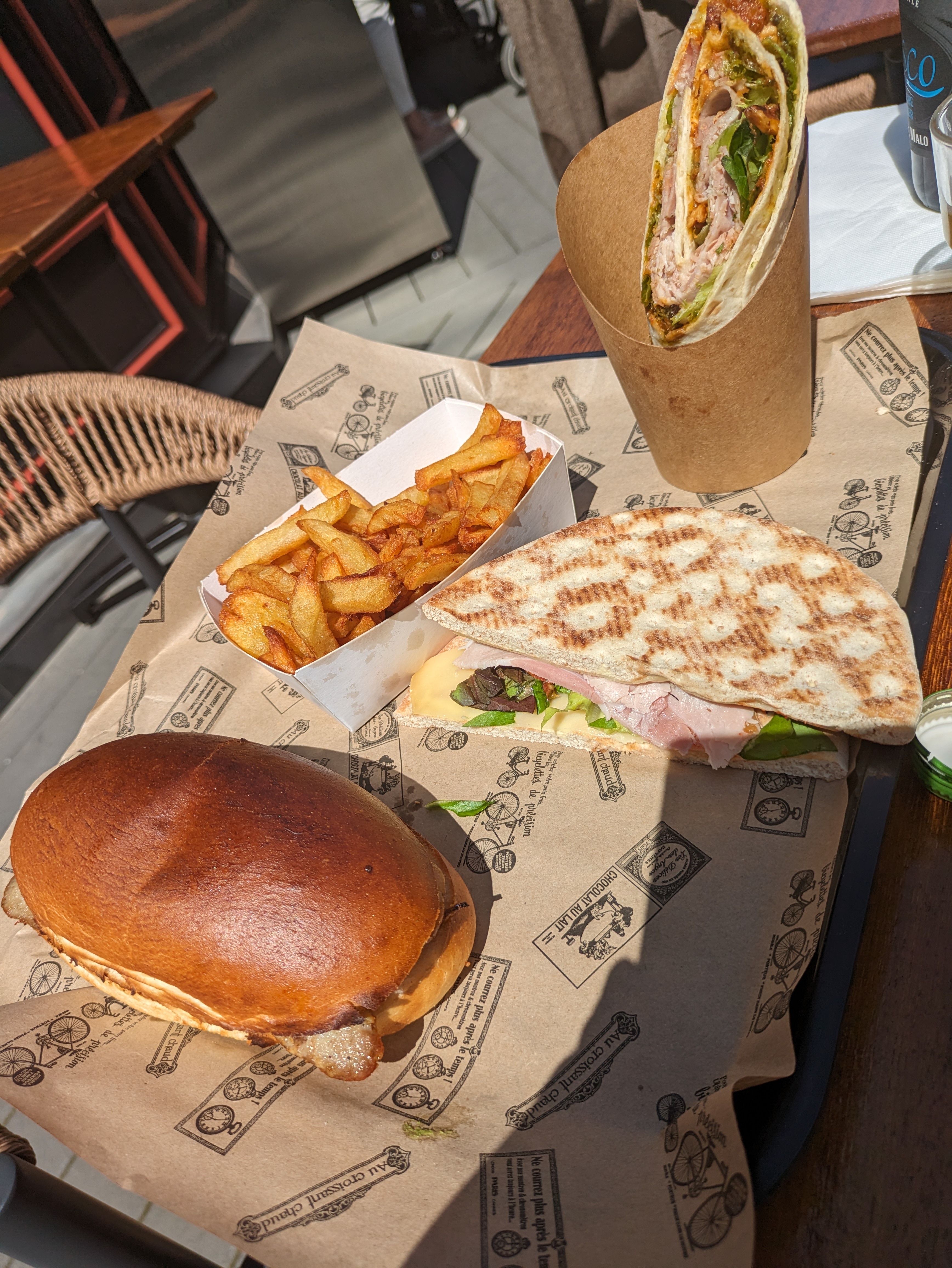 Nous avons dégusté le hot dog saucisses (EXCELLENT !) le pain suédois jambon et le wraps jambon avec barquette de frites. Tout était très bon. Manque peut-être des parasols et des toilettes