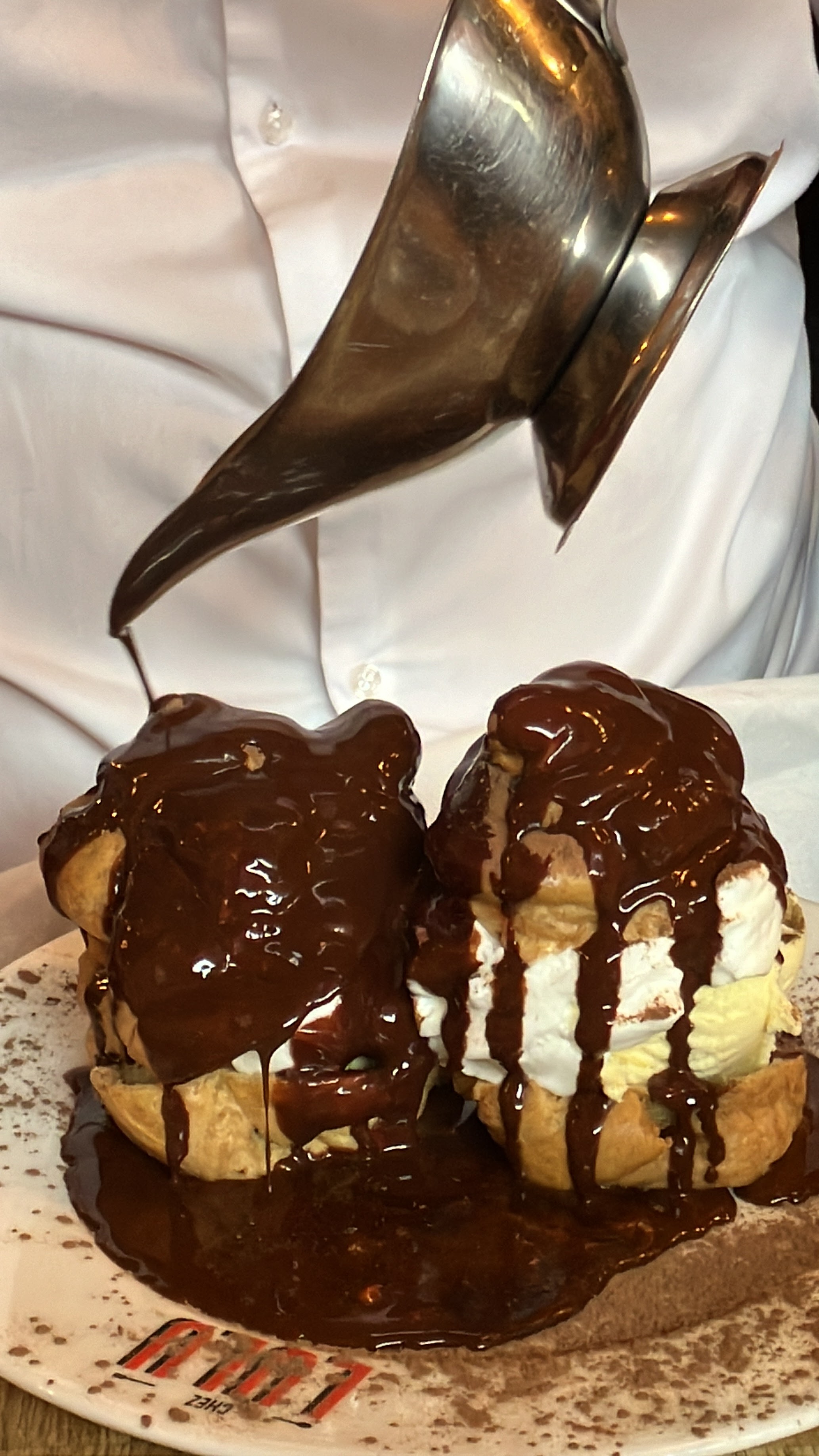 Restaurant agréable, vite servi, produits frais et profiteroles impressionnantes et faites maison. Sur la photo je n'avais mis du chocolat que sur un seul choux mais vous avez une saucière pleine de chocolat. Excellent