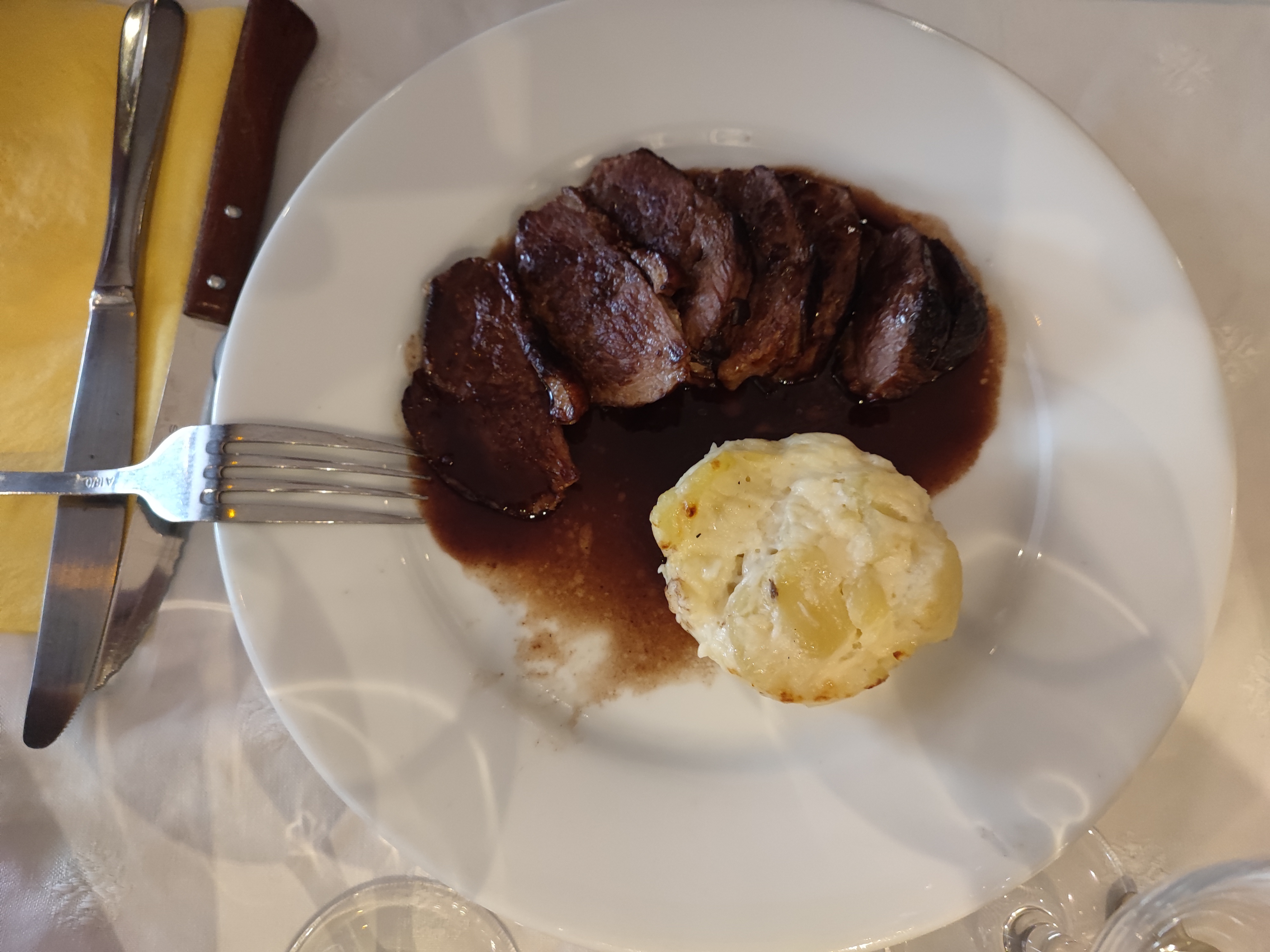 Cuisine correct mais rien d'exceptionnel. Terrine de campagne basic et industriel, choux des profiteroles industriels également, pas de Chantilly, après avoir réclamé nous en avons eu par le patron directement à table en bombe industrielle. Bref, 24 euros le menu, bavette et sauce très bonne