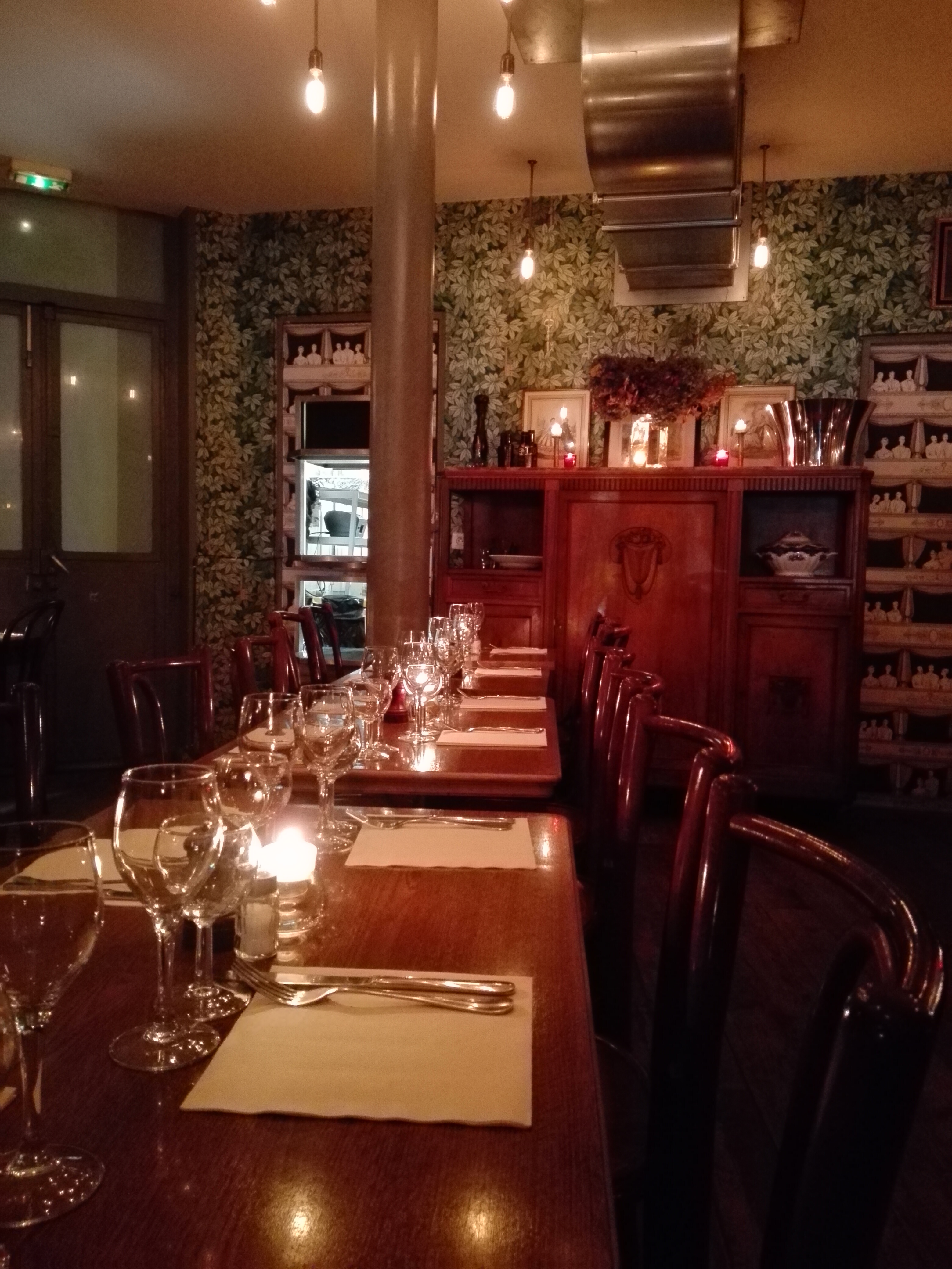 J'adore dîner chez mademoiselle. Atmosphère intime à la lueur des bougies, décorations et ambiance soignées et très bien pensées. Et le petit secret de charme à l'ancienne: l'ascenseur pour descendre à la cave à vin, 100% manuel avec un système de poulies! Et les plats dans tout ça? Ils sont succulents. J'y ai mangé plusieurs fois et j'ai gouté au steak, à la sole meunière, à la canette, à la côte de veau... Et beaucoup d'autres plats délicieux dont je ne me souviens même pas, mais je n'ai jamais été déçu! Comme vin je recommande fortement leur Graves, il est assez léger et équilibré. Pas grand chose à dire de négatif, si ce n'est que c'est un peu cher (comptez 60-70 euros par personne, vin inclus), et qu'il n'y a aucune option végétarienne. Je rajoute quelques photos de notre dernier dîner là-bas. J'espère que ce petit trésor vous plaira!