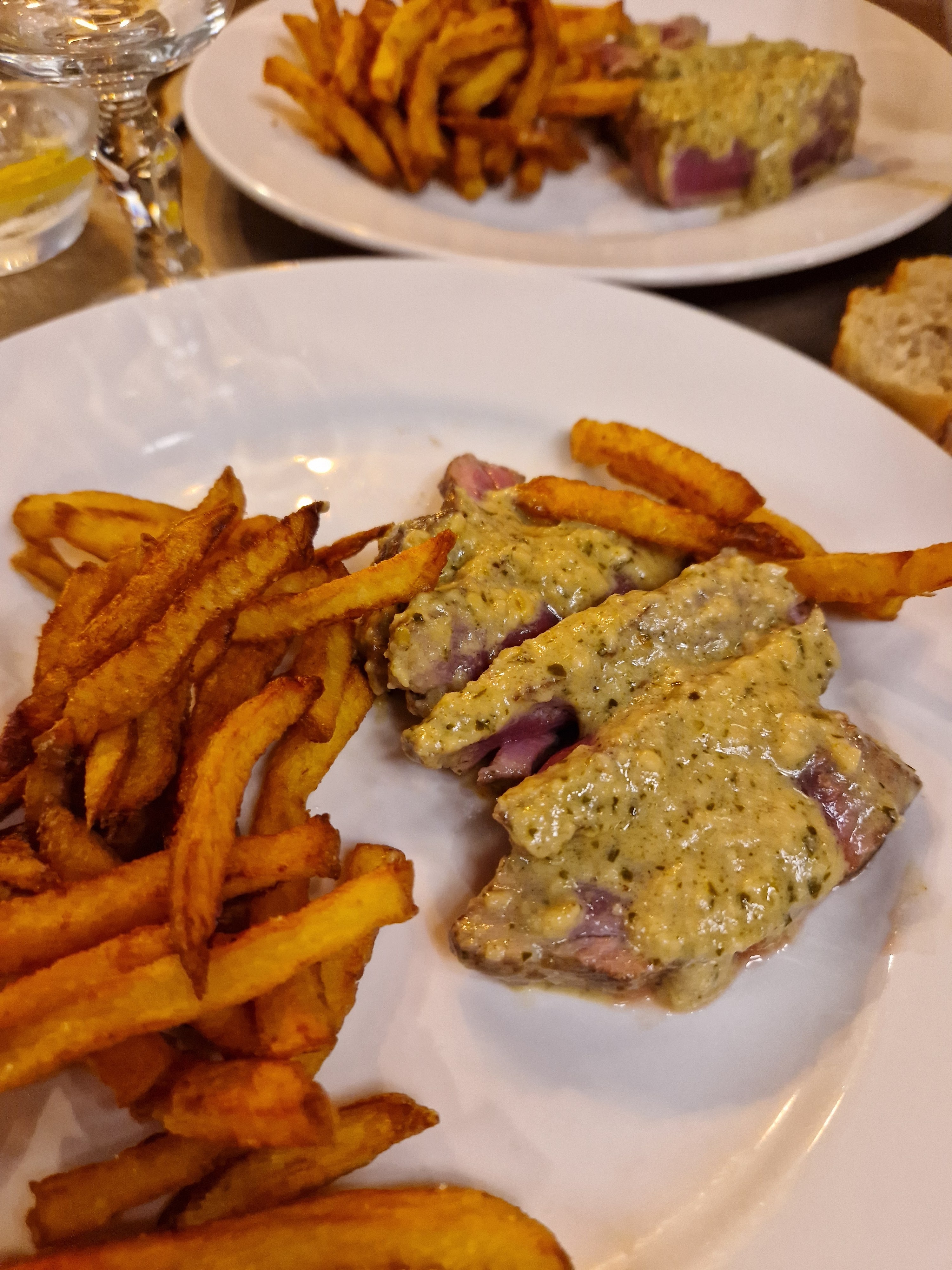 Décevant. Après plusieurs passages dans ce restaurant, la viande est définitivement dure. Dommage de prendre du faux-filet (entrecôte parisienne) qui pourrait être remplacé par une viande de meilleure qualité, puisque raison de plus, c'est l'unique plat du restaurant. Un vendredi midi où les serveurs semblaient débordés malgré de peu de monde. Capsules Nesspresso pour les cafés. Carafe d'eau au goût chloré, à éviter. En revanche, la sauce et les frites relèvent le niveau. Je conseille également le vin de la maison. Enfin voilà c'est bien dommage, mais il y a du potentiel.