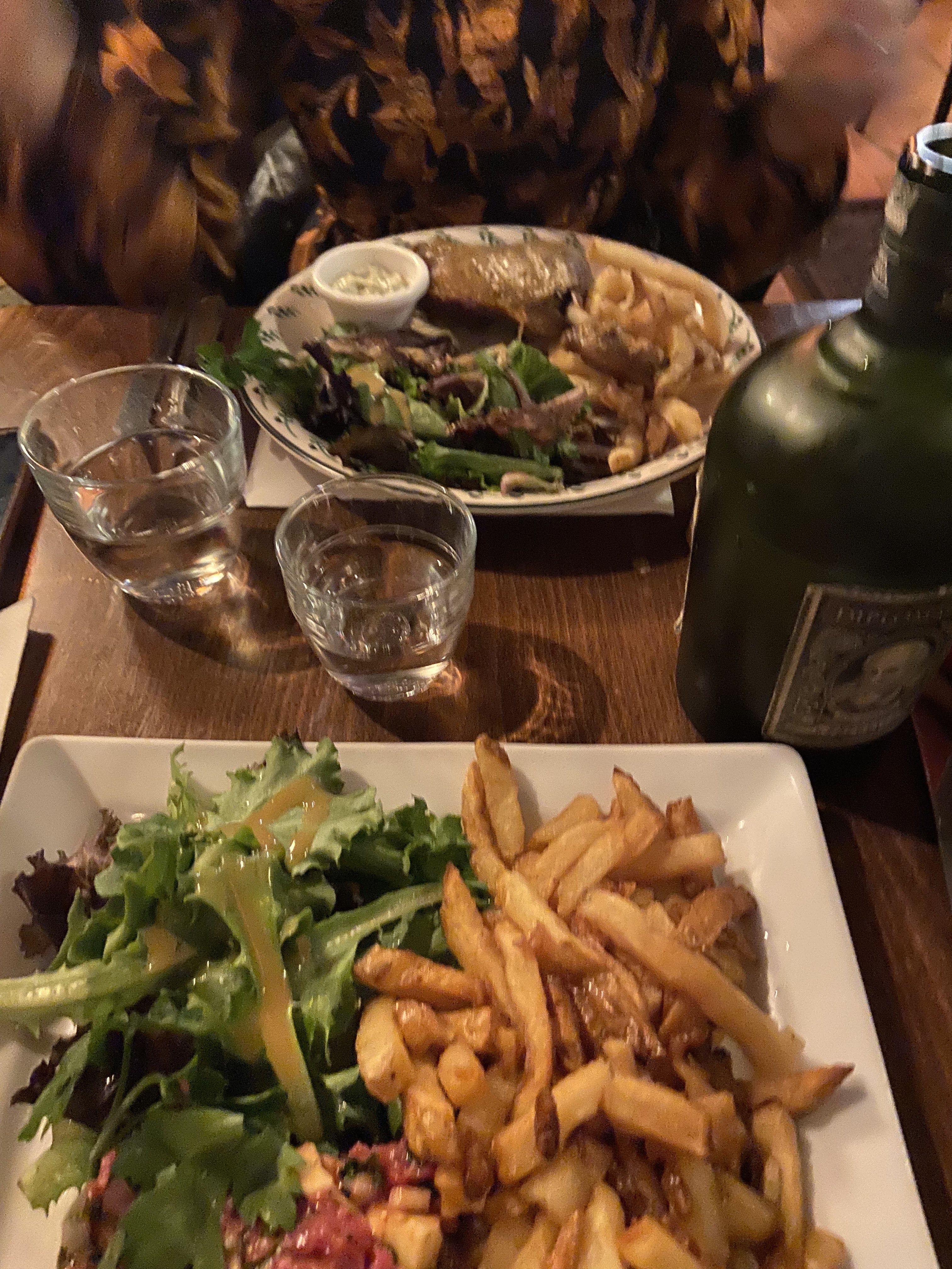 tl;dr ambiance sympa, nourriture modérée/mauvaise ! Endroit confortable et chaleureux avec des trucs polis :) Des portions satisfaisantes, même si la nourriture était modérée ! Plus précisément, le porc était mauvais à cause de la suprématie de la moutarde de Dijon (sérieusement pas d'équilibre du tout), le poulet était correct (rien de spécial), je ne peux rien dire sur les tartares (je ne l'ai pas essayé) et le plat qui a sauvé la mise. c'était le canard... Enfin, j'étais le seul à aimer la salade !