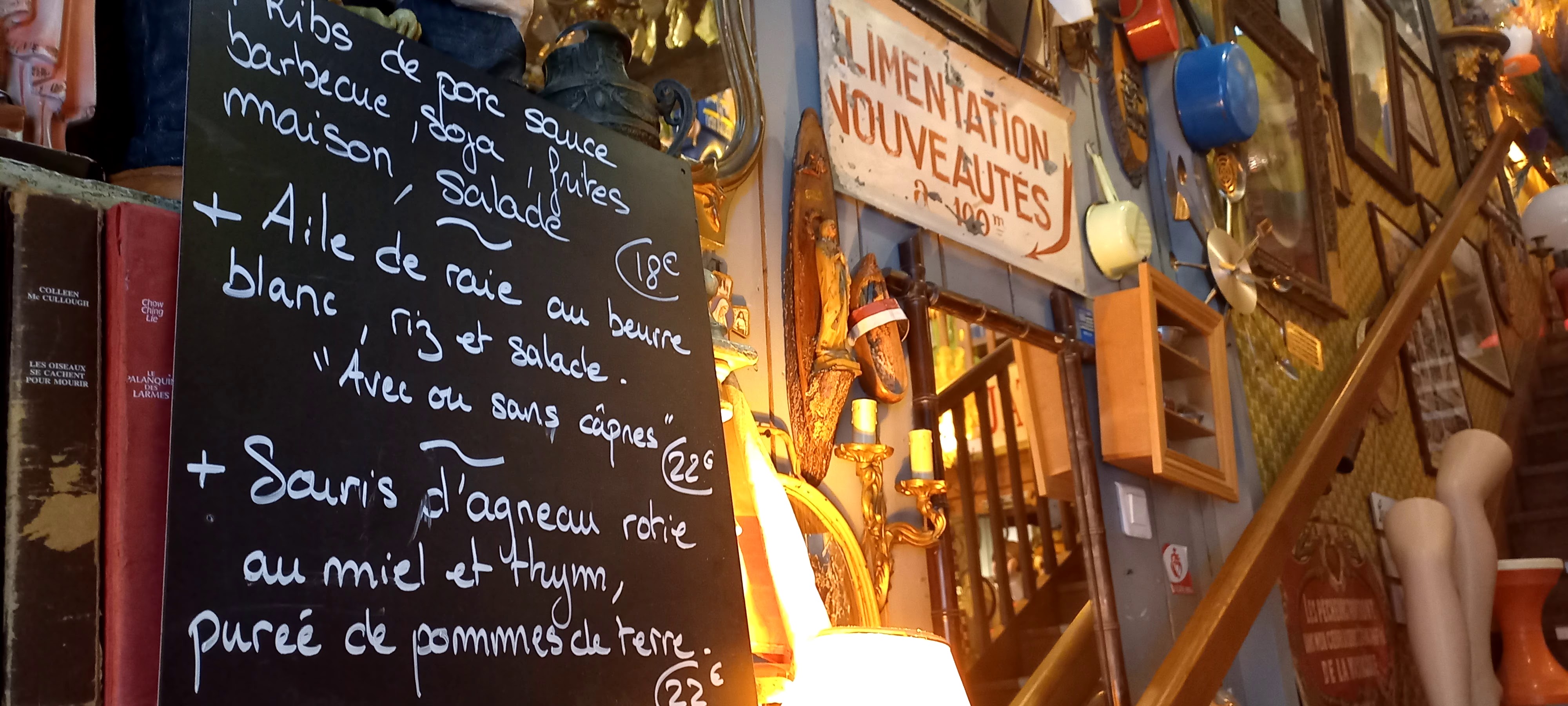 Nous y sommes allées aussi attirées par l'odeur des plats. On est immédiatement scotché par la déco très atypique. C'est un restaurant brocante. On a mangé une souris d'agneau, une brochette de bœuf.