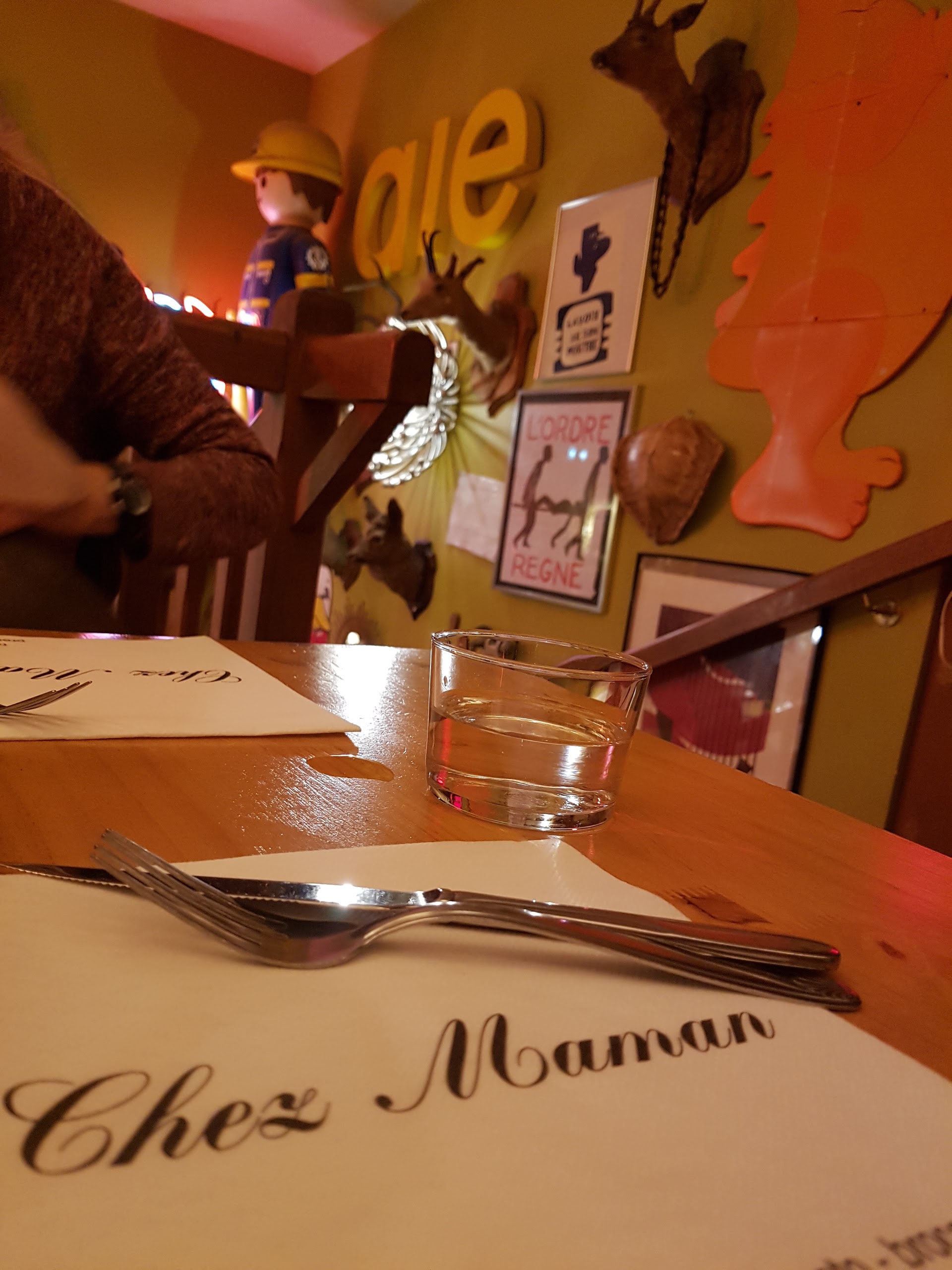 Chez Maman est un restaurant totalement atypique. La lumière intérieur est plutôt tamisée, et l'ambiance... que dire ? Nous sommes installés sur une table de quatre, un brin serrés, mais dans un cadre un peu hors du temps : des 45 tours sont suspendus aux murs, des playmobils d'un autre âge sont posés ici ou là, ainsi que pléthore d'objets un peu kitsch, mais charmants. Pour l'ambiance, c'est un sans faute. La carte est suffisamment variée pour convenir au plus grand nombre, et les plats sont servis avec le sourire. Bref, l'endroit est très sympathique et bienveillant. Le tarif des plats est raisonnable, et nous y avons très bien mangé : mention pour les desserts. Ah ! Il parait qu'il faut vérifier les toilettes d'un restaurant pour se faire une bonne idée. Allez y ! Forcez vous s'il le faut. Les amateurs d'Harry Potter et de passage secret vont adorer !