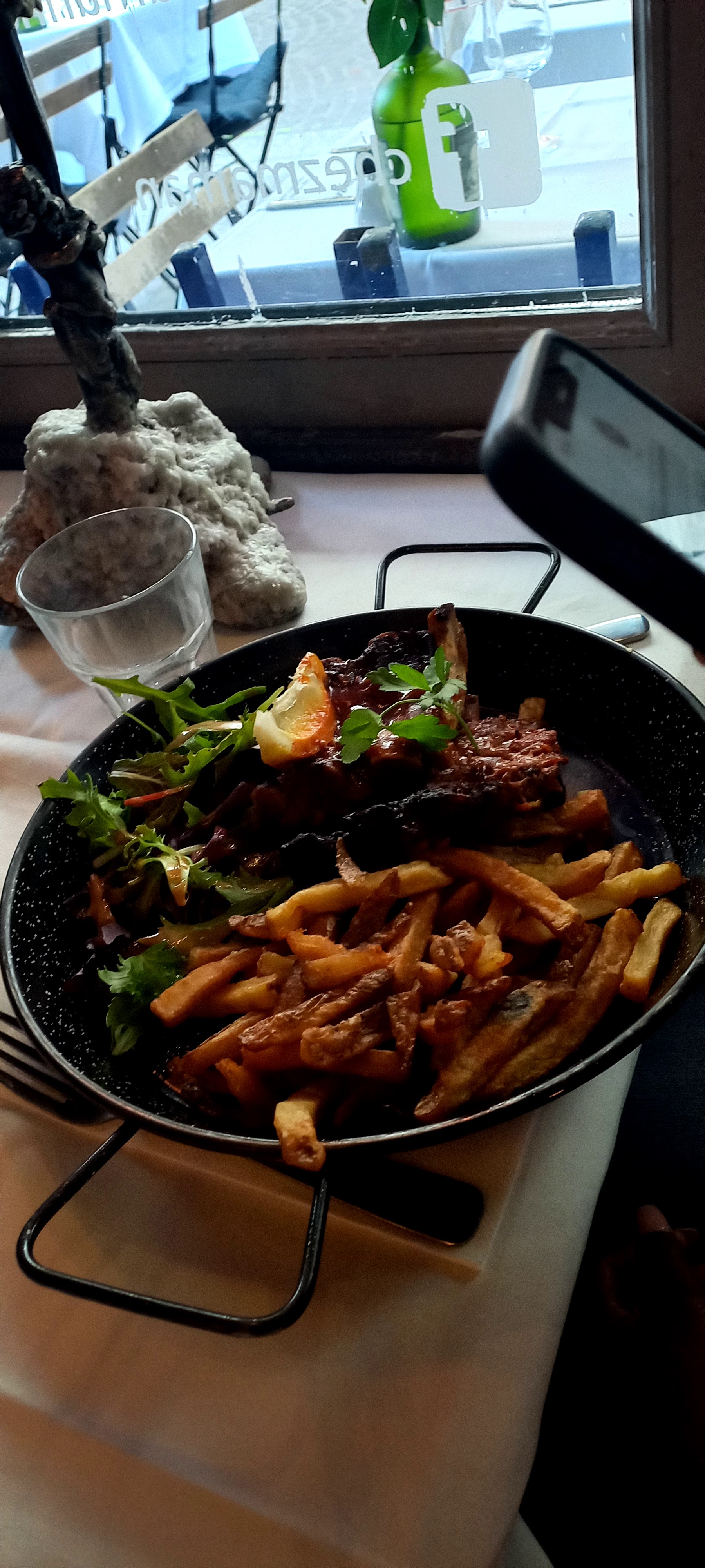 Un boeuf bourguignon avec une viande moelleuse, des frites très bonnes, une salade bien assaisonnée, tellement copieux que je n'ai pu finir mais ils donnent des tuperoir pour finir chez nous !