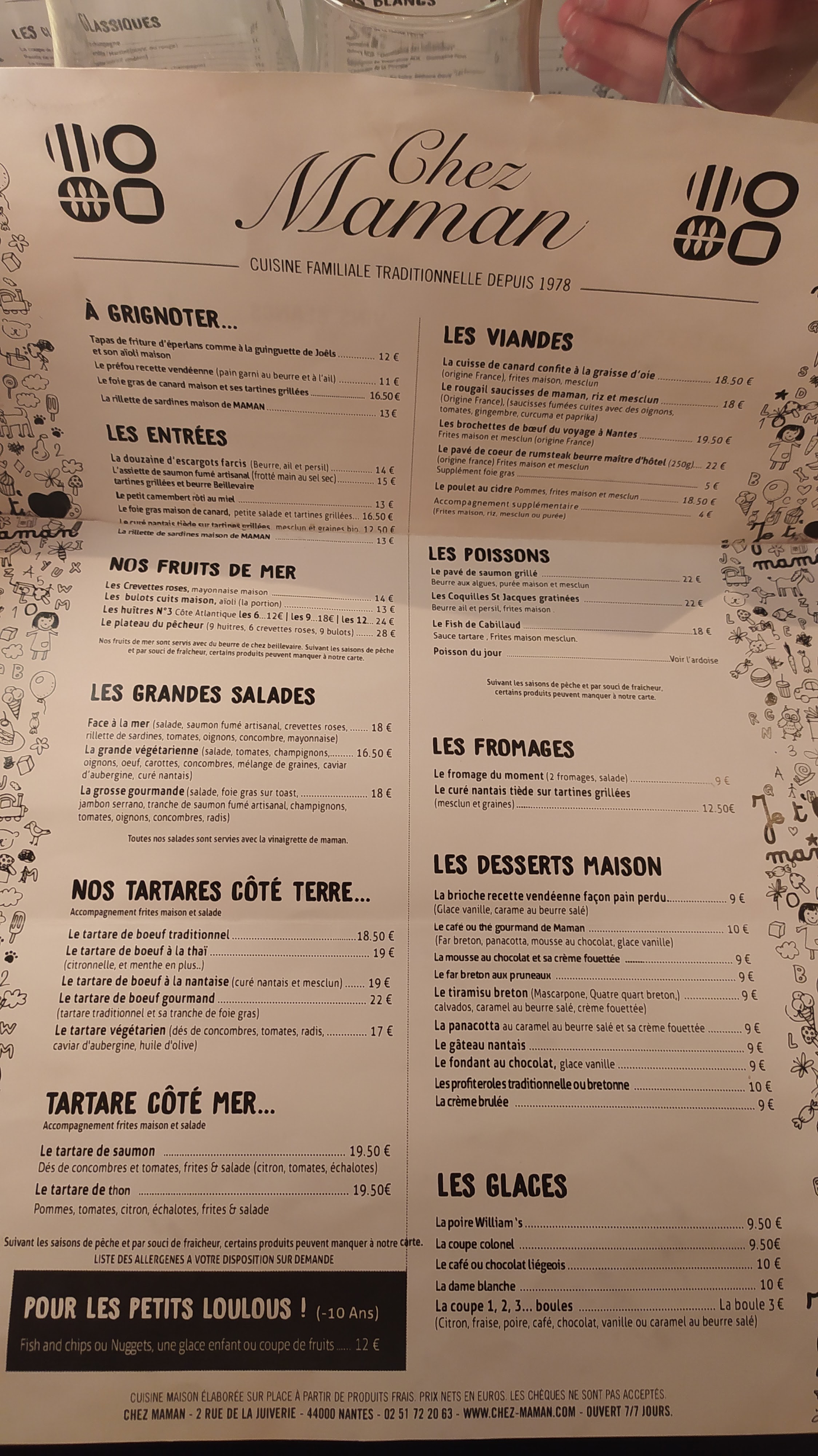Nous nous sommes régalés pendant notre dîner Chez Maman. Serveur très sympathique malgré l’affluence. Les desserts sont un peu chers (8€)