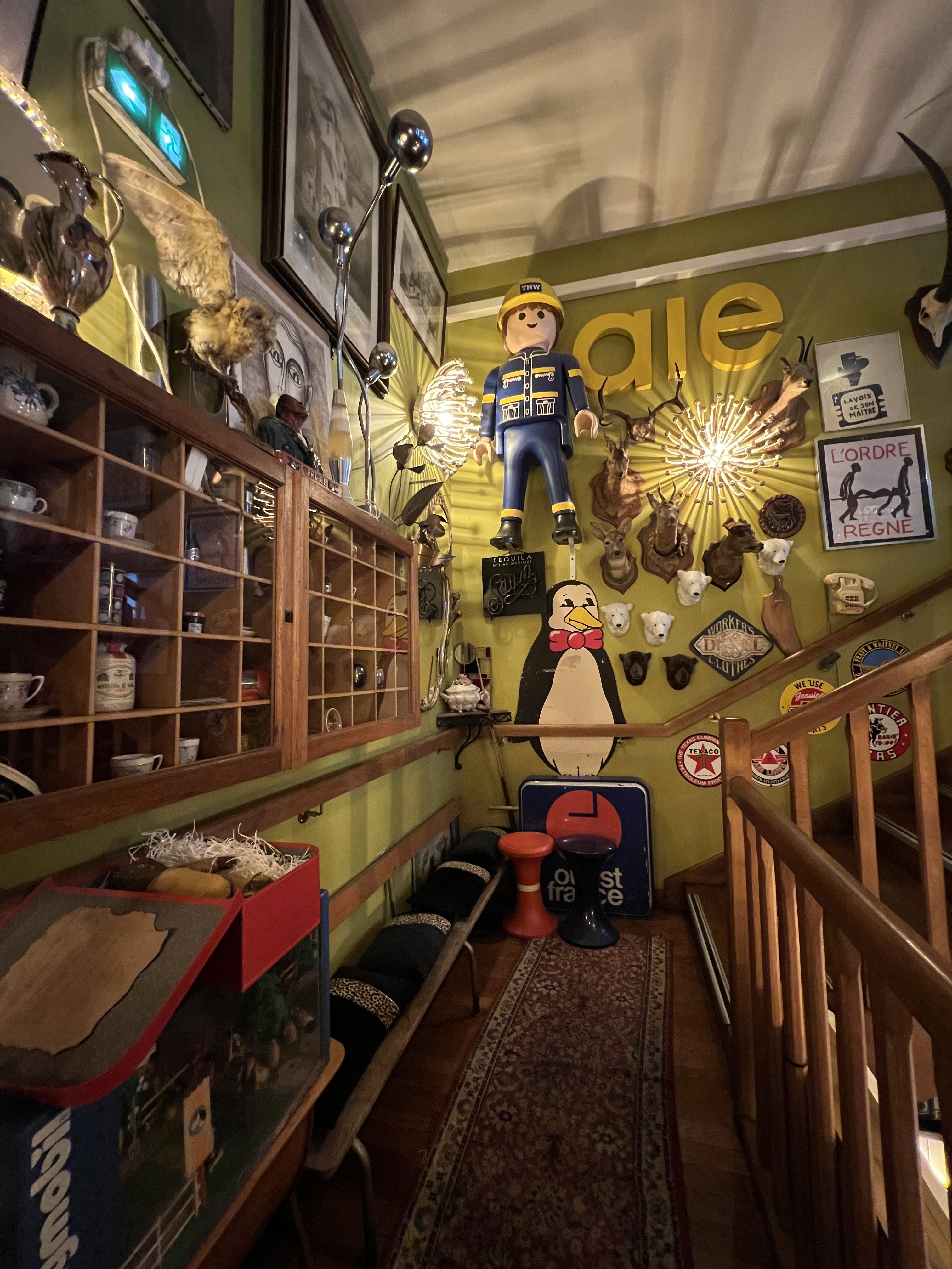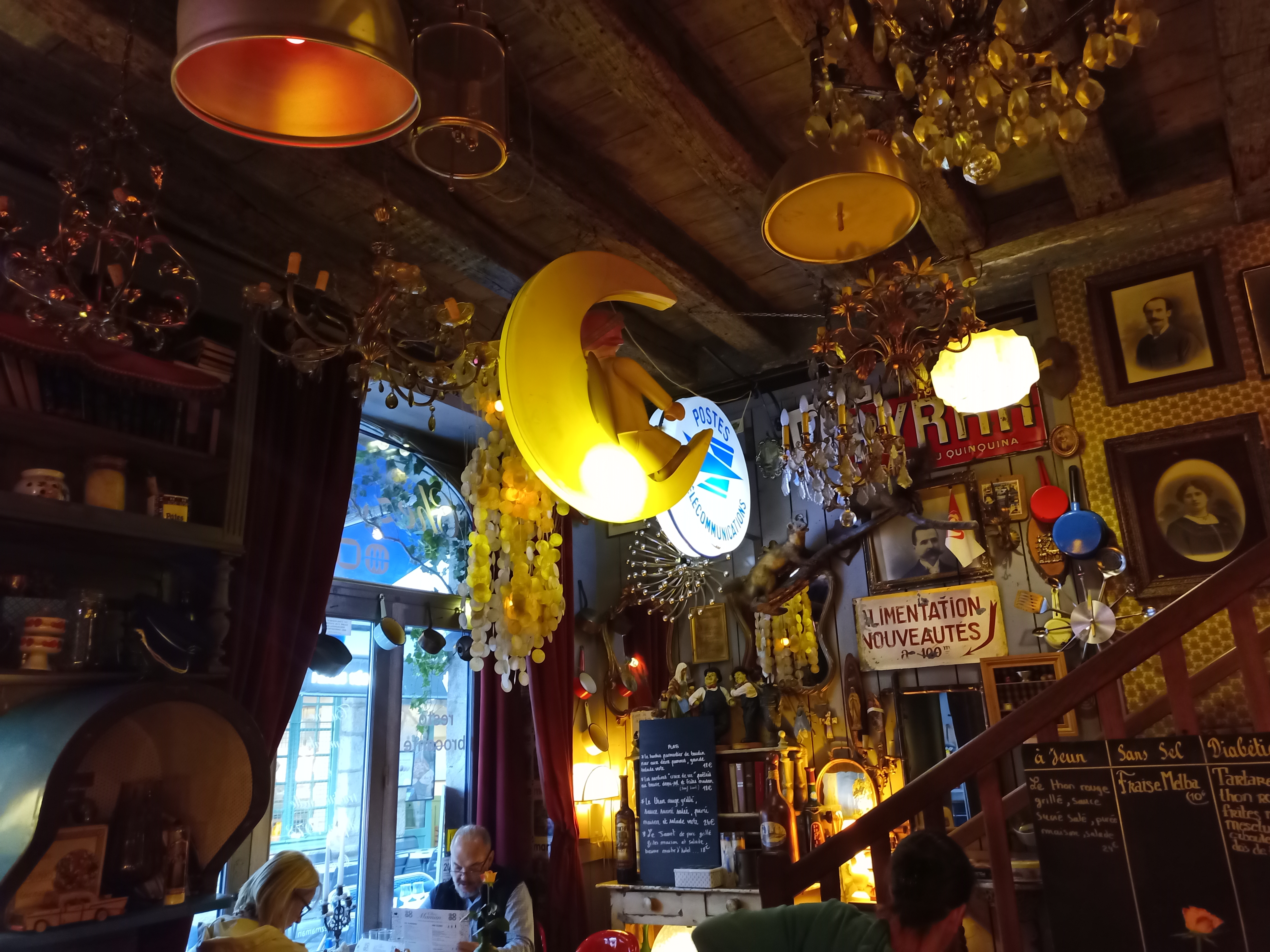 Ce restaurant est totalement atypique car c'est un resto brocante. Toutes sortes d'objets hétéroclites ornent le moindre espace sur les murs. Des chaises disparates accompagnent les tables. Les toilettes sont uniques ! Les plats manquent, malheureusement, de finesse et de goût. Il faudrait que la déco soit à la hauteur du contenu de l'assiette 😉
