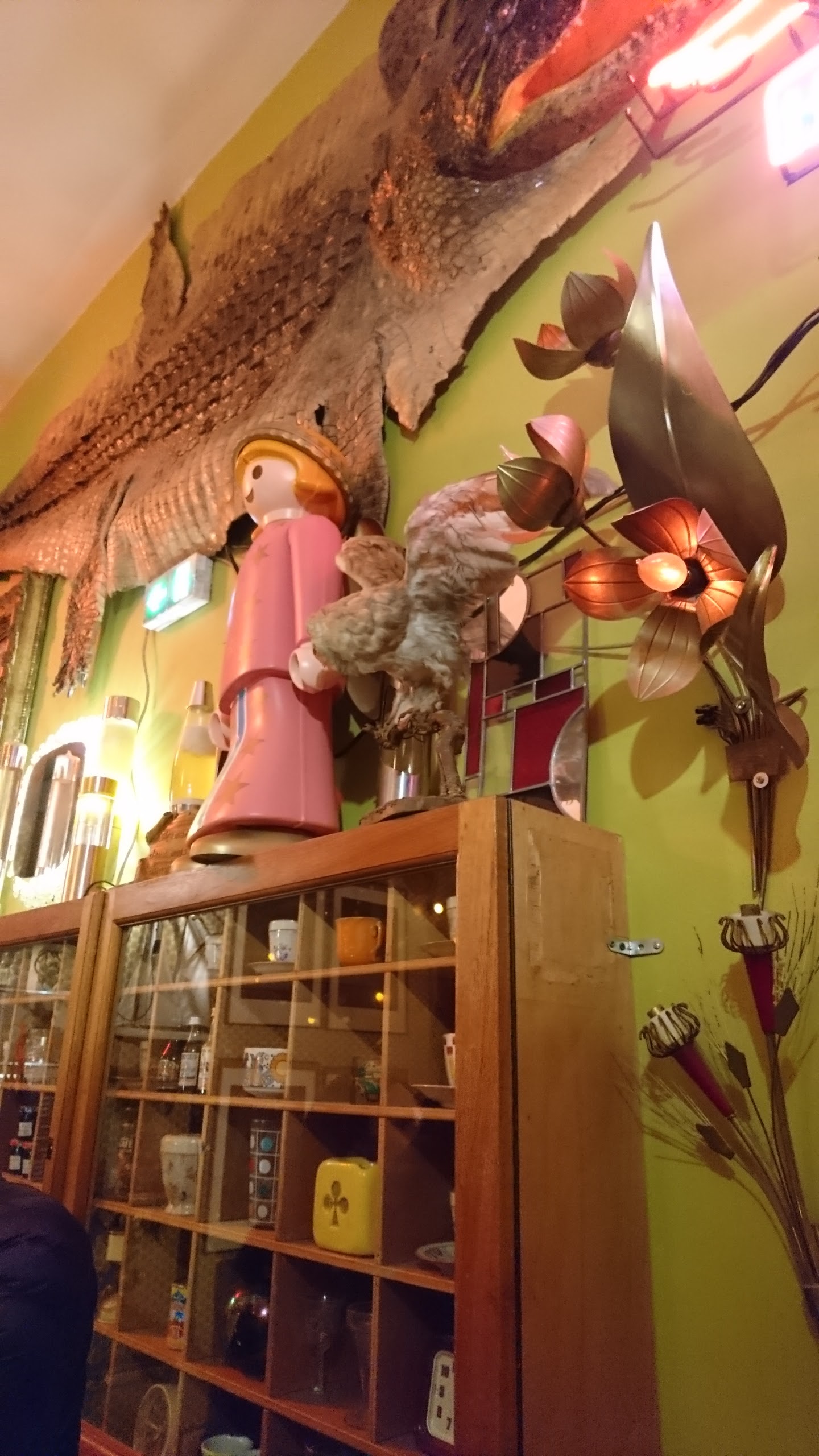 On se plonge dans un univers de brocante, ça fourmille de détails et choses délirantes. On est bien accueillis, le temps de scruter la déco les commandes sont envoyées et nous sommes servis rapidement. Les plats, des spécialités locales sont goûteux, nous nous sommes régalés. Une chouette ambiance bon enfant demeure dans ces lieux, que je recommande bien évidemment.