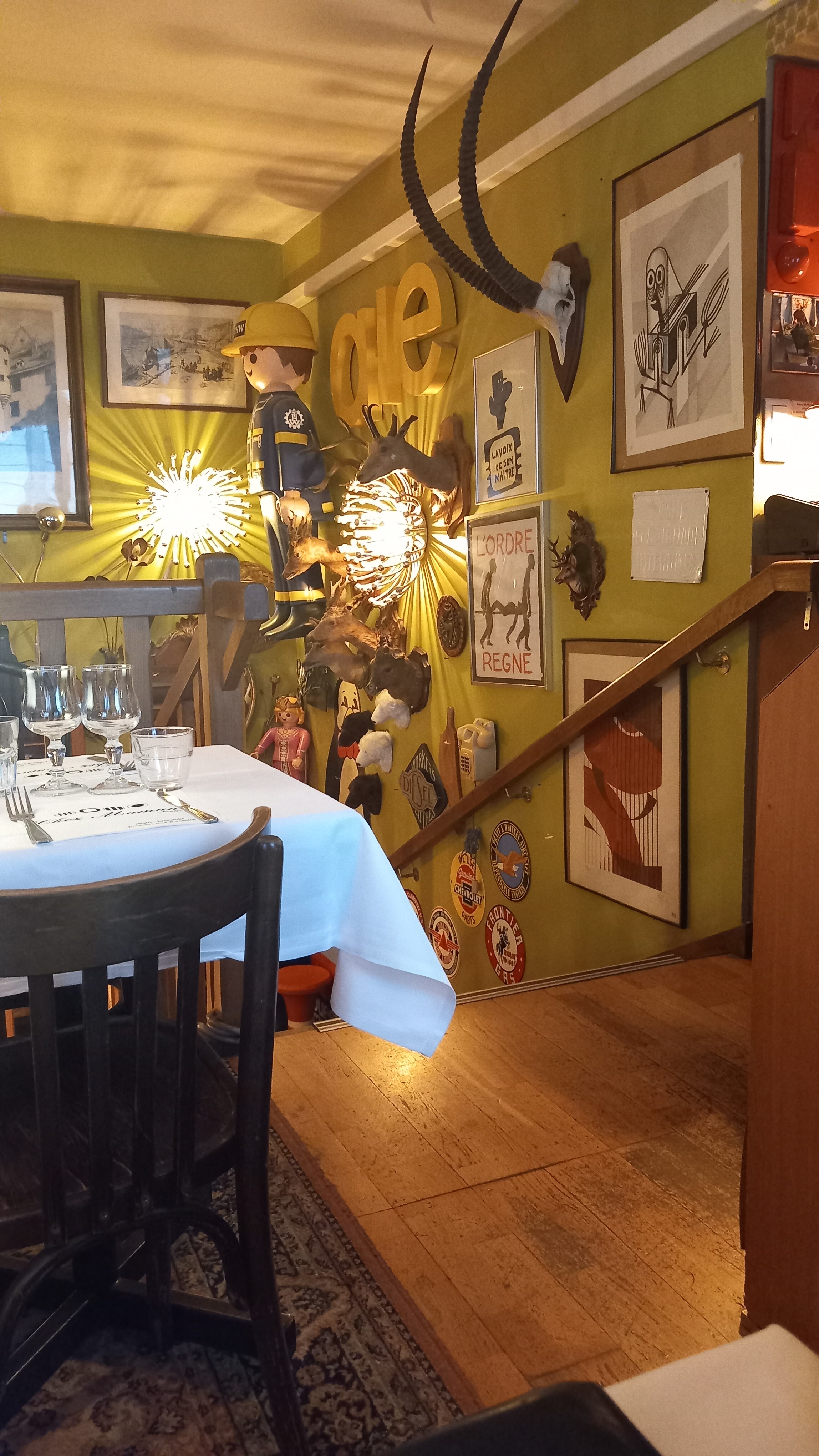 Un restaurant entouré de restaurants. Qu'est-ce qui pourrait vous donner envie d'y entrer ? Nous ça a été le nom, tout d'abord, puis les plats proposés. Une toute petite salle en rdc, un peu plus grand à l'étage, mais les tables sont touche à touche. Une décoration délirante qui rappelera des souvenirs aux plus anciens et fera sourire les plus jeunes. Le placement est rapide, les plats arrivent très vite, toujours avec le sourire. Les plats de l'entrée au dessert sont très copieux et très goûteux. Il faut avoir un très bon appétit pour tout manger. Un restaurant à faire en couple ou entre amis. Le rapport qualité est très correct pour ce niveau de prestation. Félicitations à l'équipe du service à la cuisine. A faire sans hésitation.