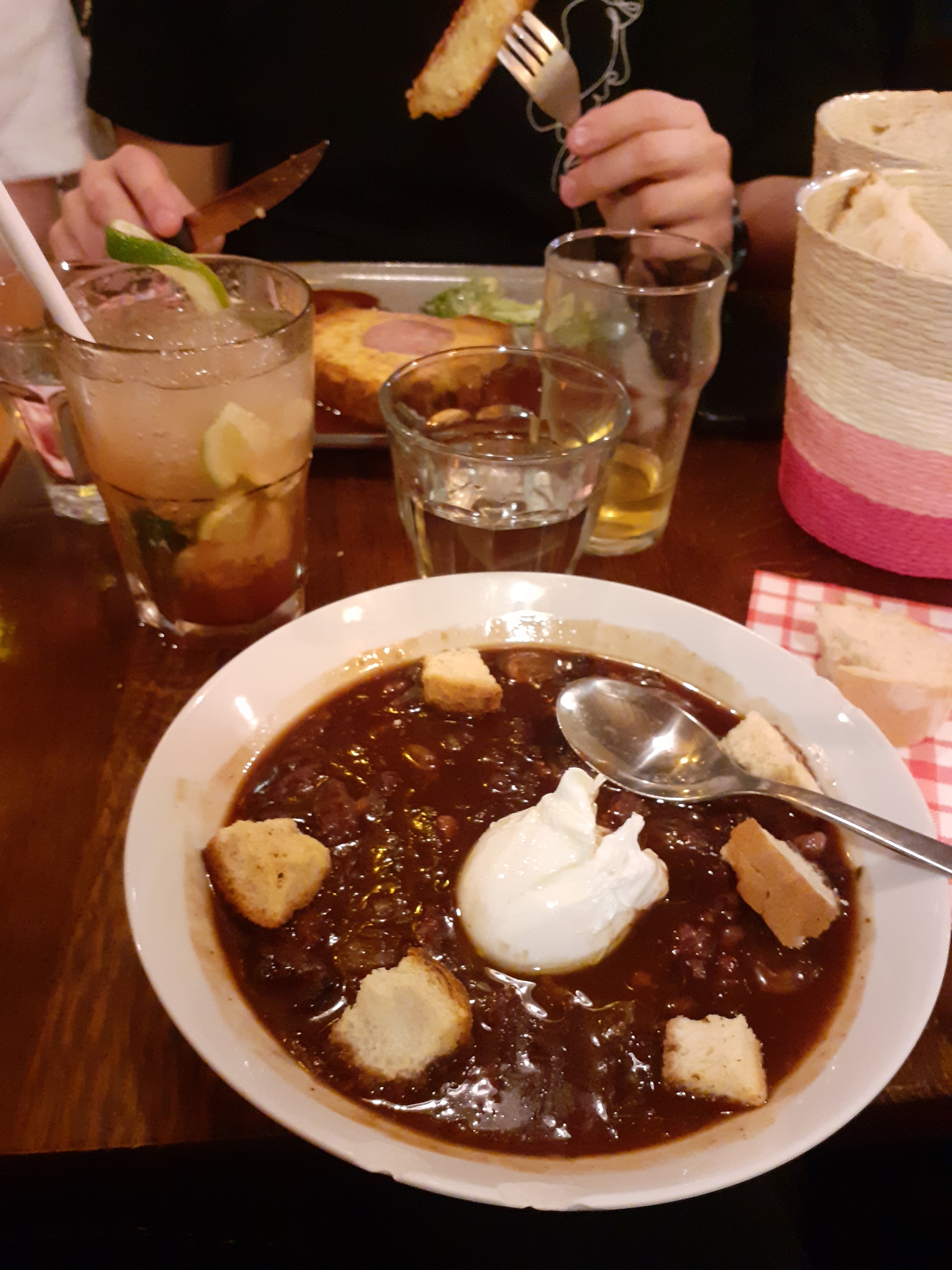 Très bonne ambiance avec de la musique agréable. Nous avons pris 2 menus (entrées, plats, desserts). Un menu lyonnais avec soupe à l'oignon, raviolis, fondant chocolat et un menu mamie avec salade césar, bavette et fondant au chocolat. Pour le prix les quantités sont plus que correctes, nous sommes répartis le ventre bien plein et ravis de l'accueil du personnel et du service. Nous recommandons vivement et nous reviendrons avec joie merci à vous 😊