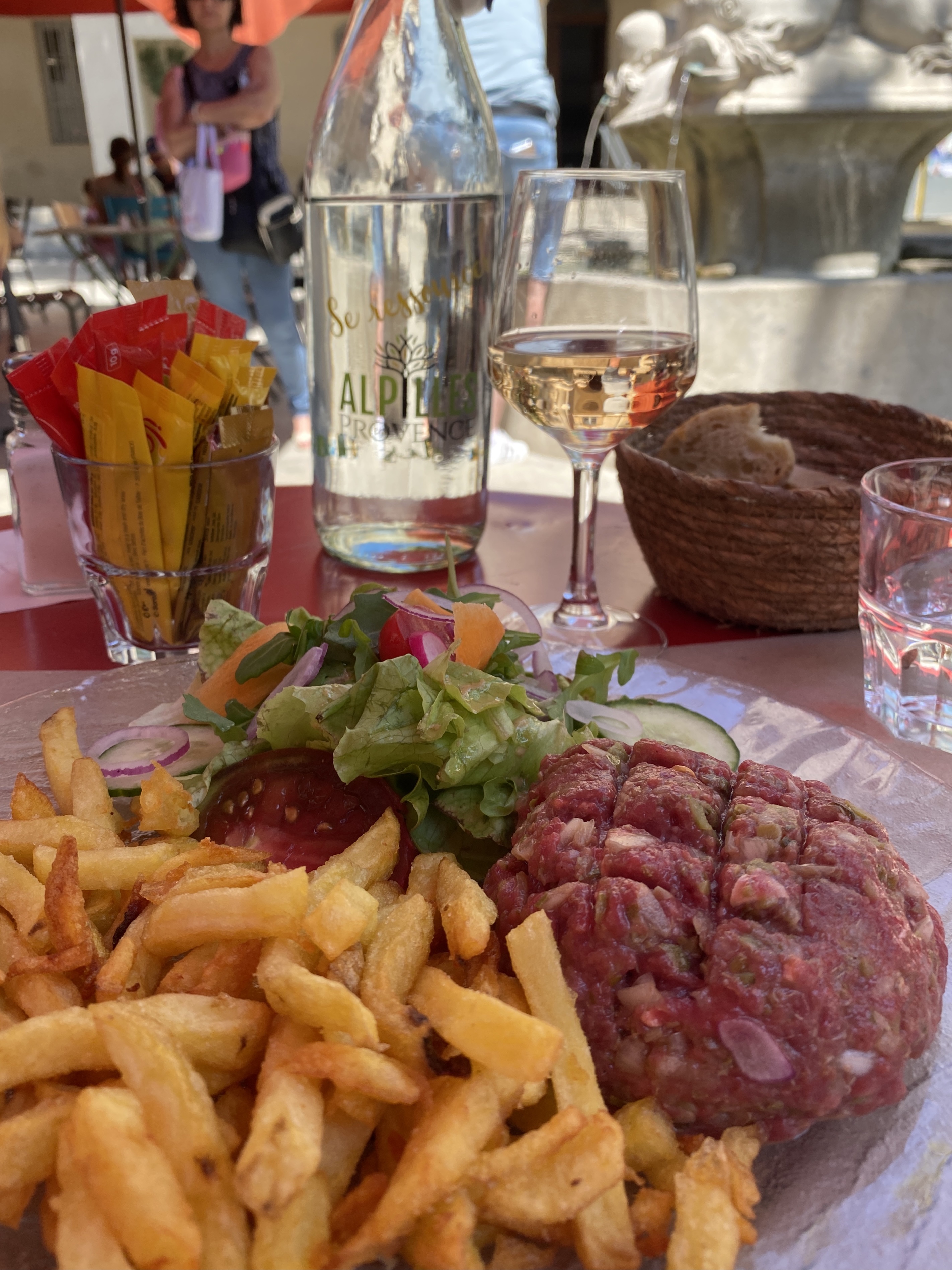 Petit bar bien sympathique, au centre de Saint Rémy, avec une fontaine bien agréable. Un grillon nous a accueilli et accompagné dans ce moment de détente.