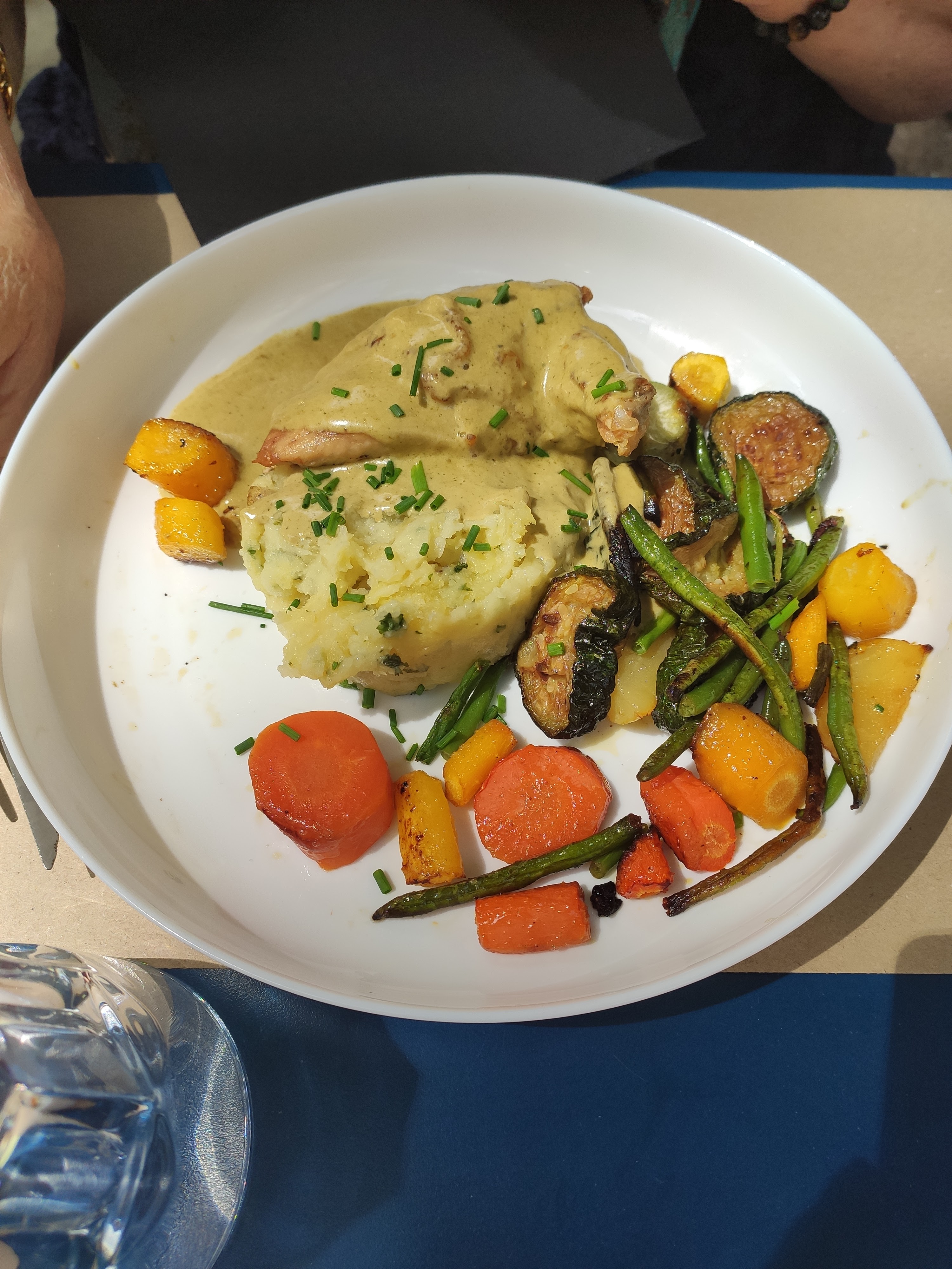 Nous avons passé un bon moment. La place ombragée est très agréable. Malgrès le coup de feu du midi et toute les tables occupées Le service a été rapide et les serveurs très agréables. Ayant des restrictions alimentaires j'ai pu faire des modifications de mon plat sans problèmes. Les plats commandés copieux et excellents. Nous reviendrons certainement pour goûter aux autre plats de la carte.