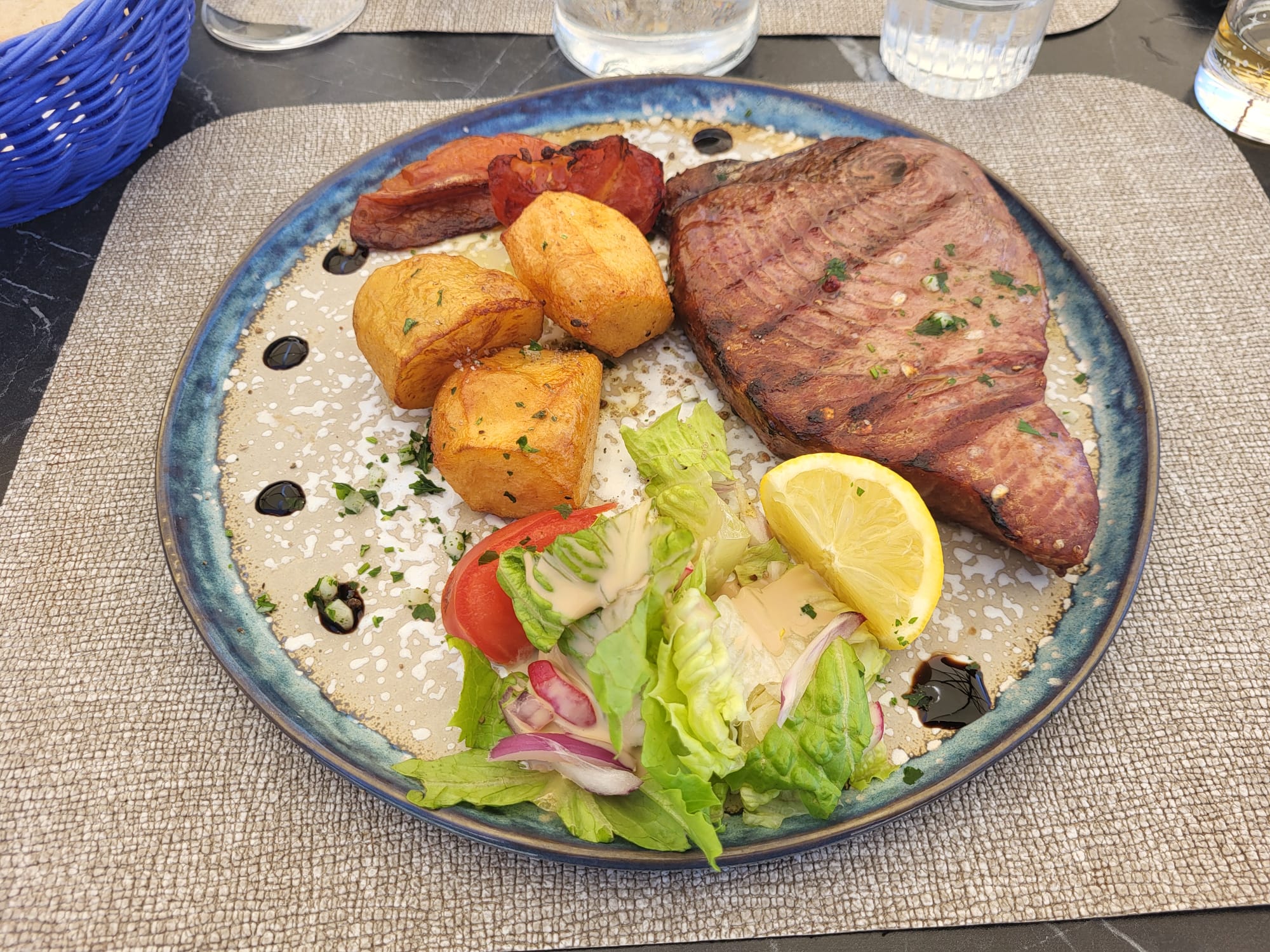 Thon rouge péché localement très bien cuit, dessert ok et digestif offert par la maison ! Je recommande ! Le patron préfère refuser les clients quand il y a trop d'attente ce qui je trouve est une preuve de respect du consommateur.
