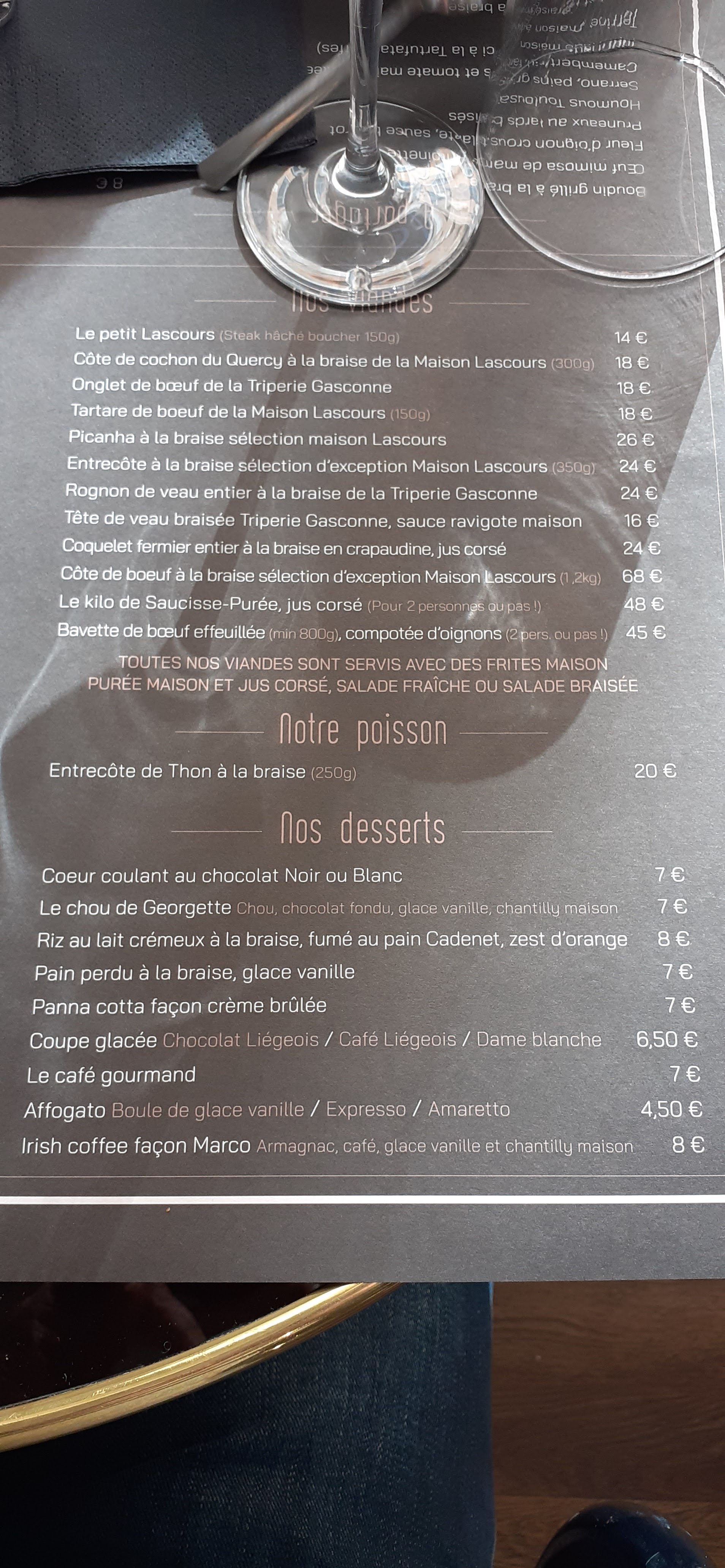 Parfait, nous nous sommes régalés avec la viande, les frites, le verre de vin et le dessert. Le tout pour 70€ pour 2 personnes. Nous avons aussi apprécié l’accueil et le service. Nous reviendrons !