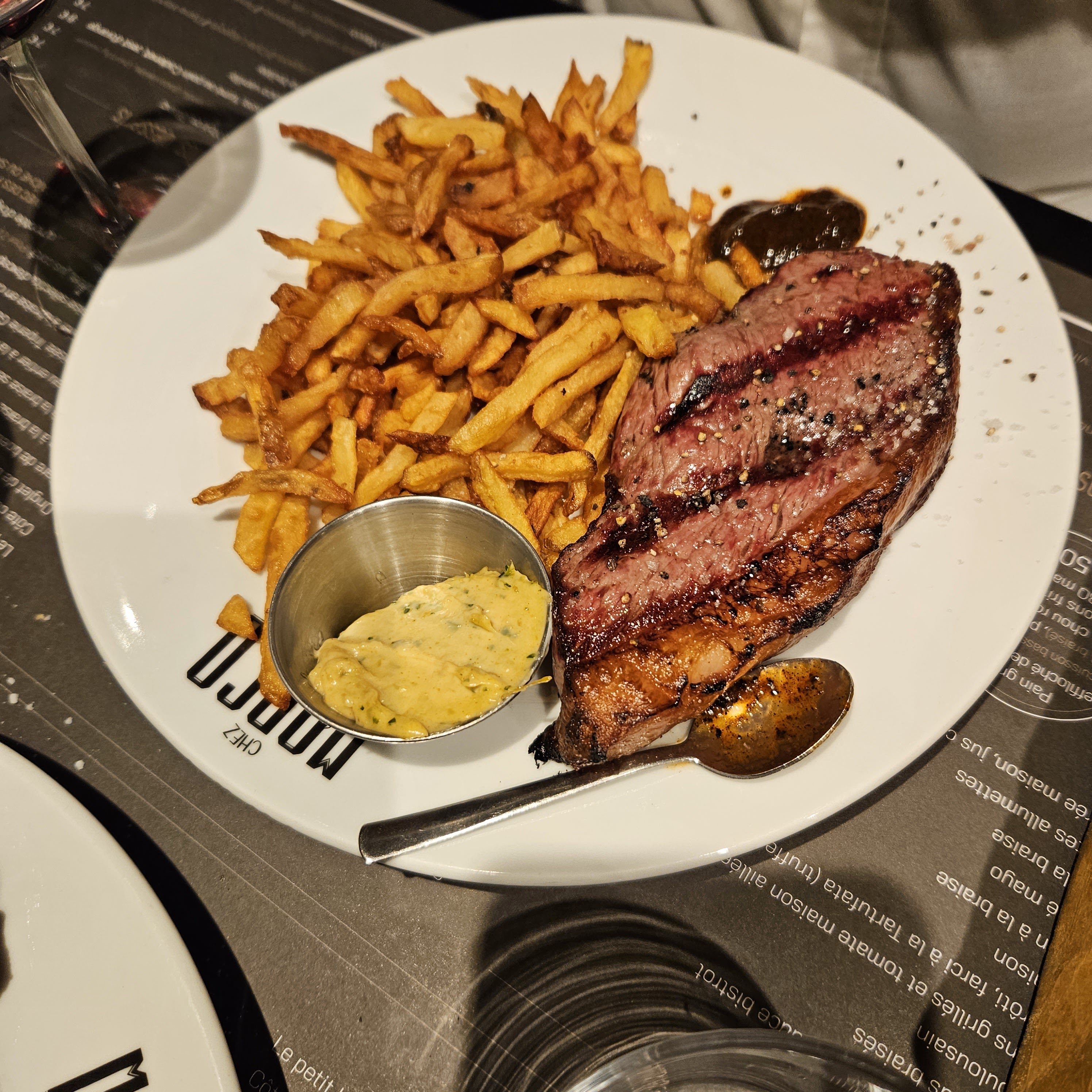 Ravie d'avoir partagé un moment convivial autour d'une belle côte de boeuf, parfaitement assaisonnée, et d'un verre de vin soigneusement conseillé par le serveur. Les entrées à partager étaient également très bonnes, et on allonge le compliment jusqu'au dessert. Très bonne adresse ! 👍