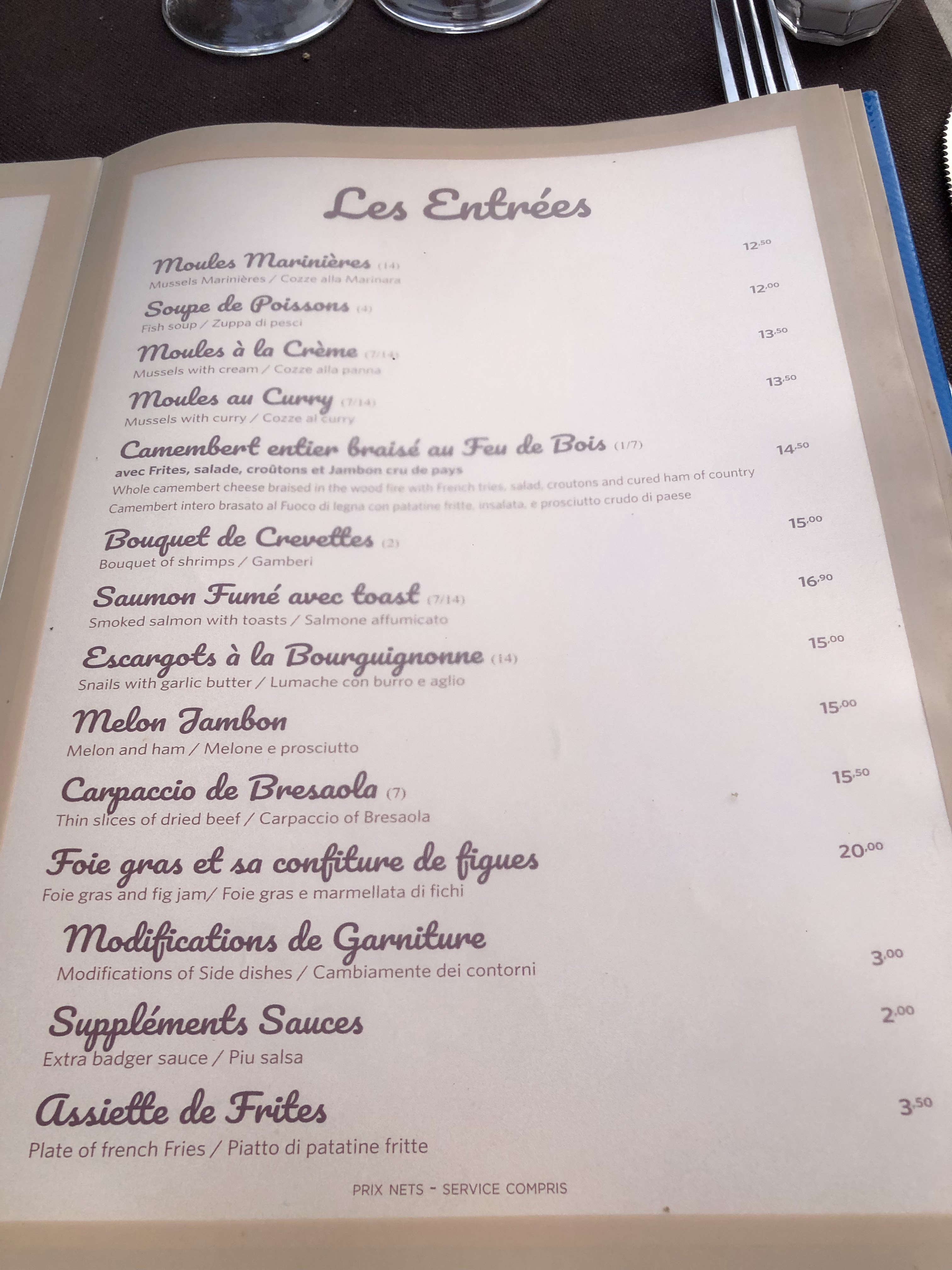 Nous sommes des clients réguliers. Nous n'y mettrons plus les pieds.Salade et moules immondes. Le serveur était gêné. Nous a dit que le patron a acheté ses produits Italie les moins chers. Immangeable. Produits pas frais. Moules ENORMES cuites et recuites . Nos voisins de table Anglais très sympathiques ce sont fait malmenés par le Patron parce qu'ils ne parlait pas Français juste incroyable. Rayé de notre carte