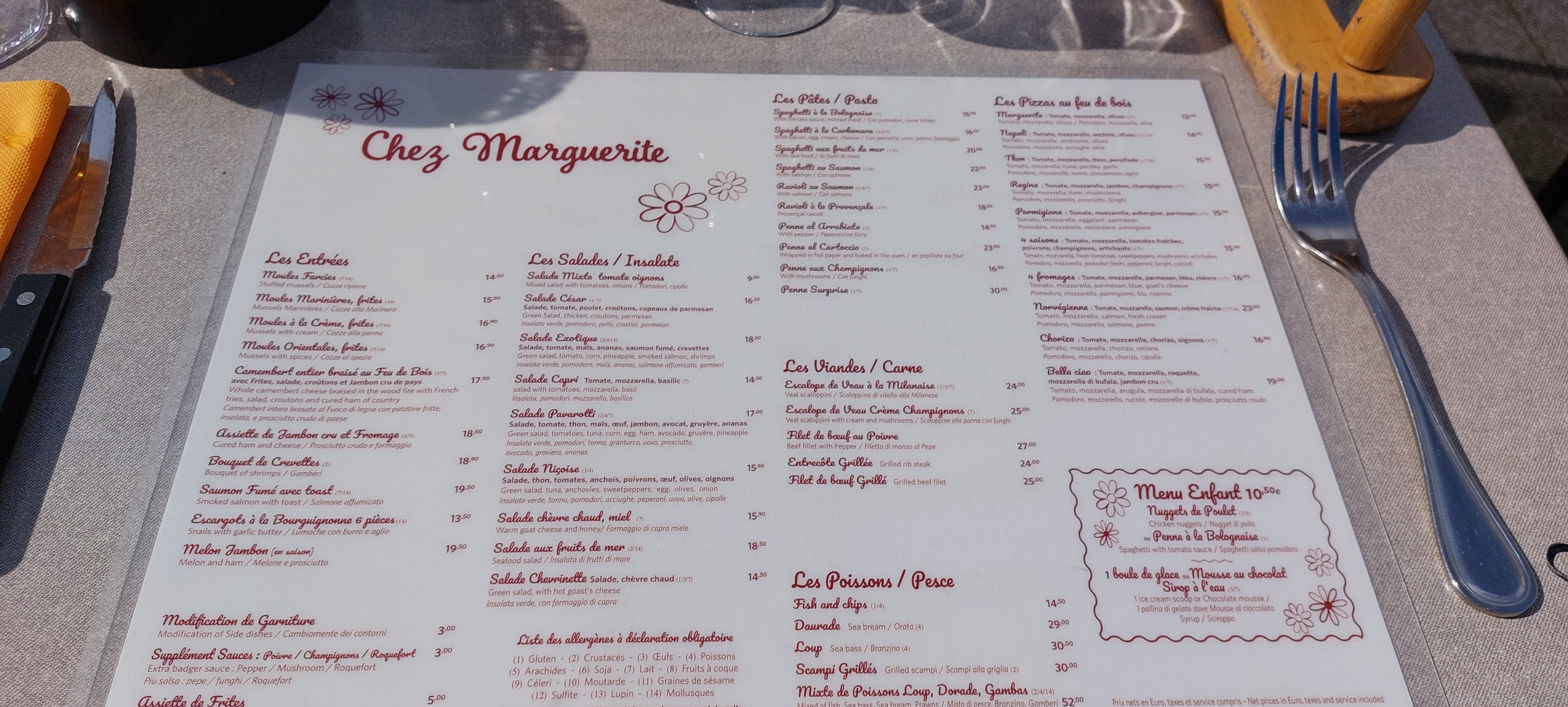 En vacances à Antibes, nous somme allée manger (chez marguerite) l’accueil désagréable, plus 1heure d’attend entre l’entrée et le plat , cuisions nos respecter , pas de goût , portion minimum, et ce trompe de plat et ne s’excuse pas et pour finir tout et surgeler.