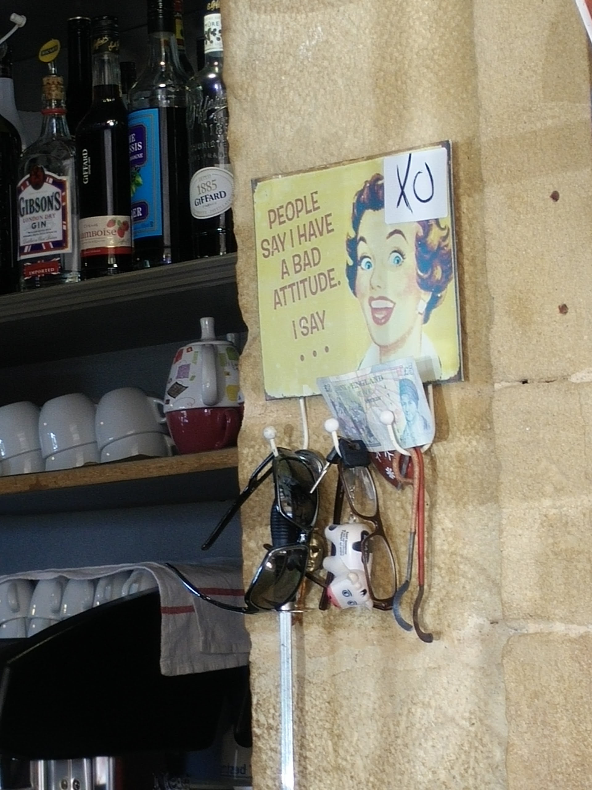 Le serveur n'a pas été d'une grande aide lorsque nous avons demandé où nous pourrions déjeuner après avoir affirmé que la cuisine était fermée à 13h30. Il nous a ensuite escroqué avec des verres de vin qui ont fini par coûter le triple du prix du vin que nous avions demandé. Le vin qu'il nous a apporté n'était apparemment même pas au menu... ? Mais nous avons commandé hors du menu. Nous avons remarqué que le couple à côté de nous continuait à se voir servir son déjeuner même après notre départ. Mais pour nous, la cuisine était fermée. Je soupçonne qu'il a entendu notre accent canadien-français et nous a traités en conséquence. Nous avons été traités avec le plus grand respect partout où nous sommes allés dans le sud de la France. Si vous visitez le beau village d'Oingt, je ne recommanderais certainement pas cet établissement malheureusement. Bien d’autres endroits plus conviviaux et invitants où aller. La photo ci-dessous a été trouvée sur le mur derrière le bar, qui décrit très précisément notre expérience.