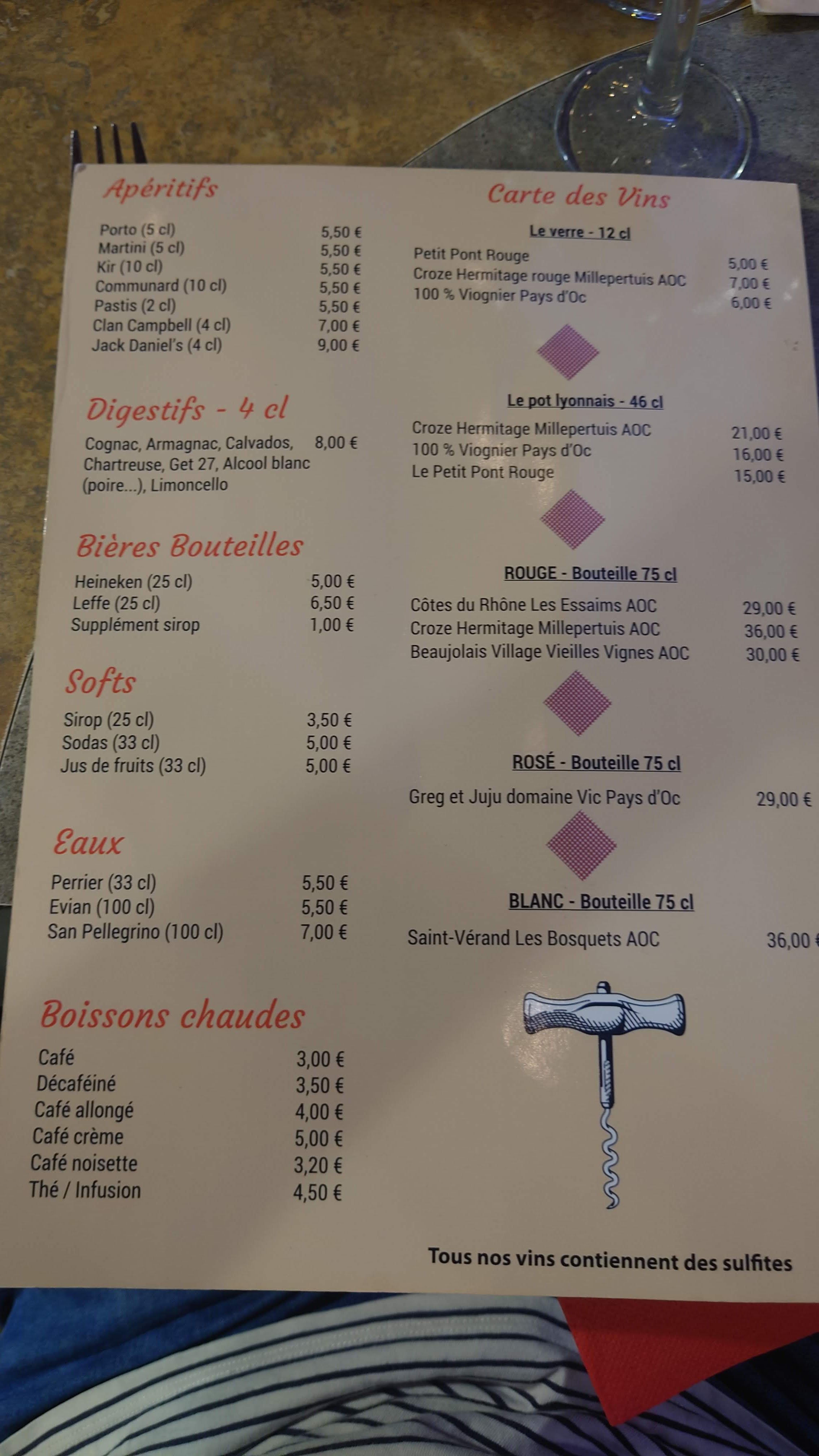 Accueillant à l'entrée, il le vend...et il le faut, pour la fête des lumières, j'y suis allé un peu au hasard, la déco est sympa, mais les plats rien de merveilleux, j'ai pris un menu et j'ai découvert que le plat, quenelle sauce nantua (rien d'extraordinaire, toute simple) est en supplément en voyant le ticket, pas inscrit sur la carte dans la formule, sans doute je n'aurai pas pris l'option, j'aurai eu que les courgettes et les champignons allons savoir, et le café, l'expresso à presque trois euros, le pompon. Je ne recommande pas ce piège à touriste.
