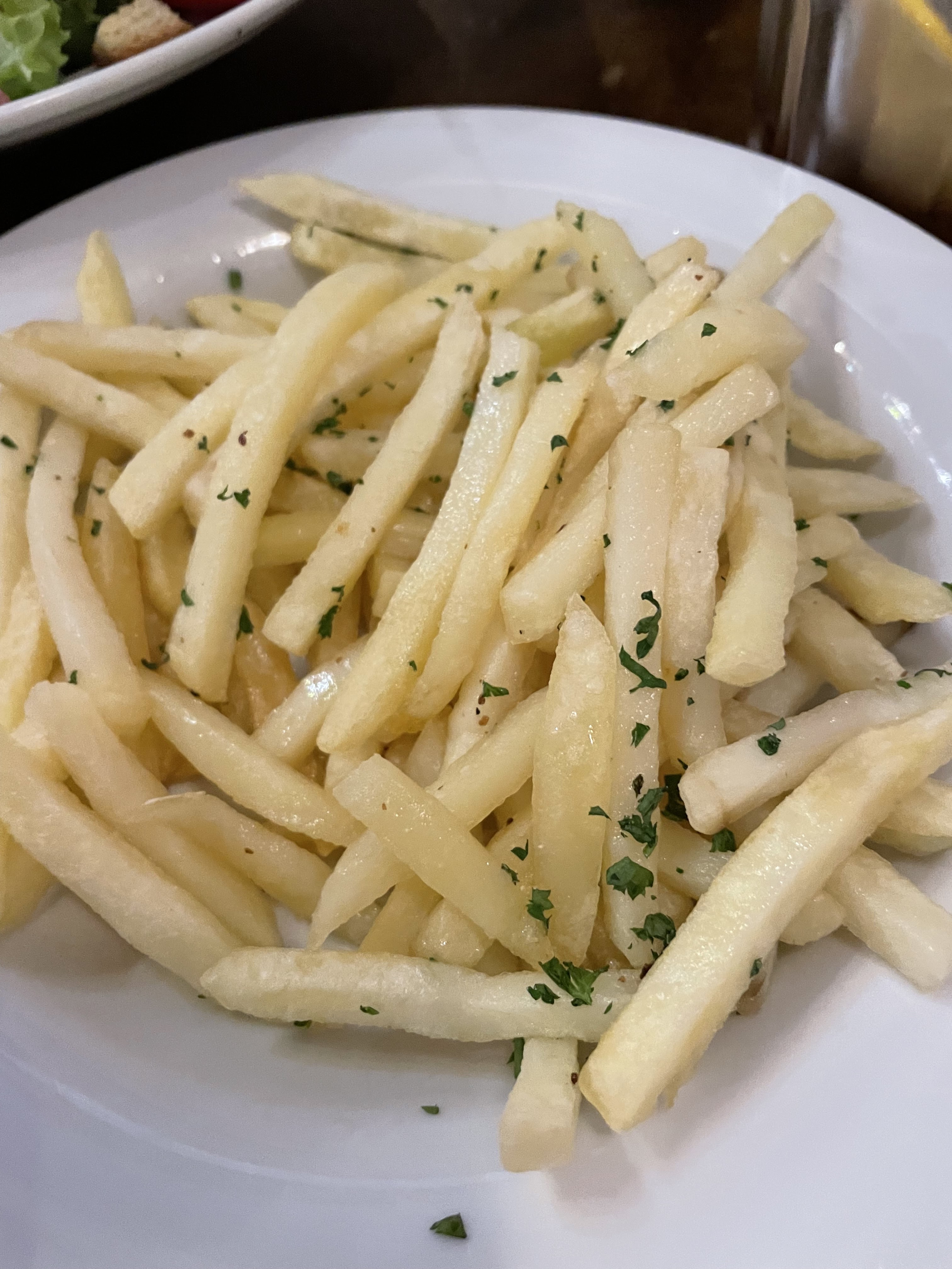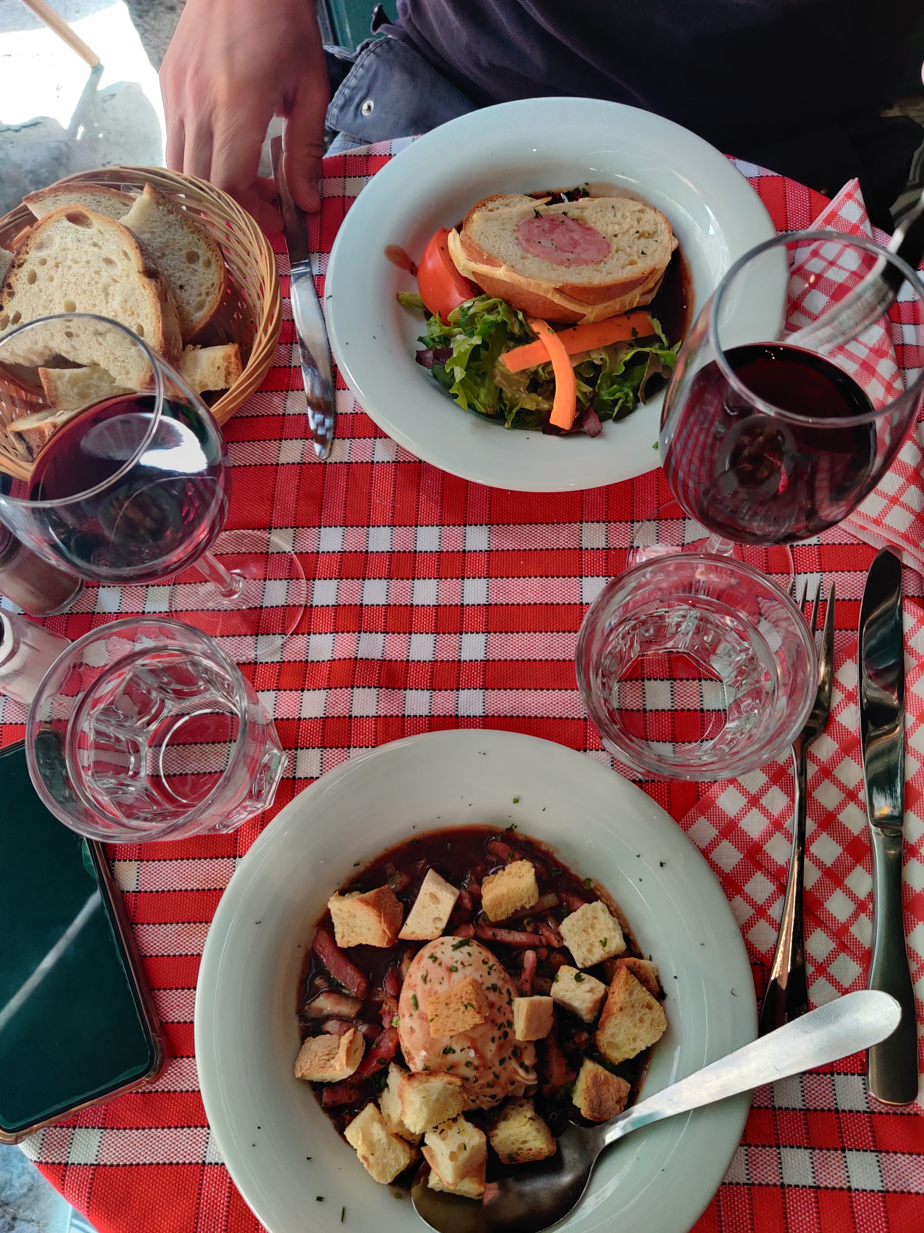 J'en ai mangé des frites pas terribles, mais alors des si mauvaises, franchement, rarement. Des sortes d'allumettes blanches, pas du tout colorées, imbibées d'huile avec du persil par-dessus en guise de cache misère. Je ne vois pas comment une personne ayant un minimum de base en cuisine laisserait une assiette être servie comme ça. Ça annonce la couleur pour le reste du repas. Le saucisson brioché était correct bien que trop salé. Et la salade lyonnaise servie avec les lardons cramés, les croûtons pas croquants du pain de la veille, un œuf sur deux dur plutôt que mollets... je suis presque impressionnée de réussir à rater un chose aussi simple qu'une salade.