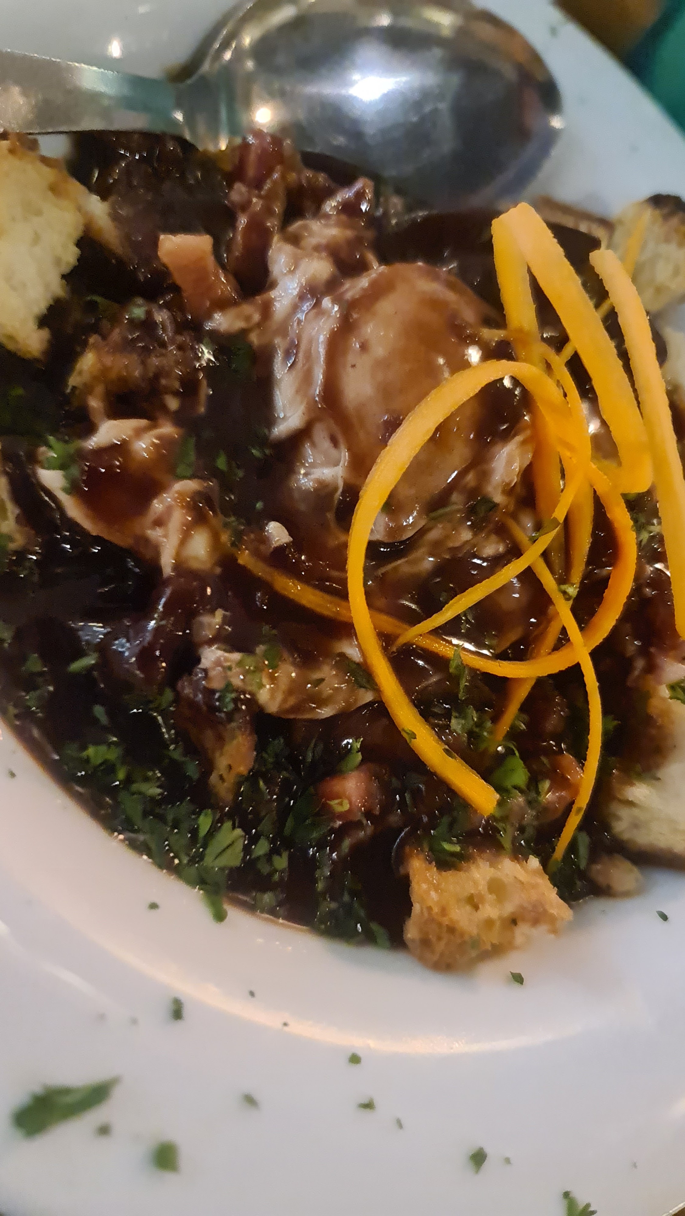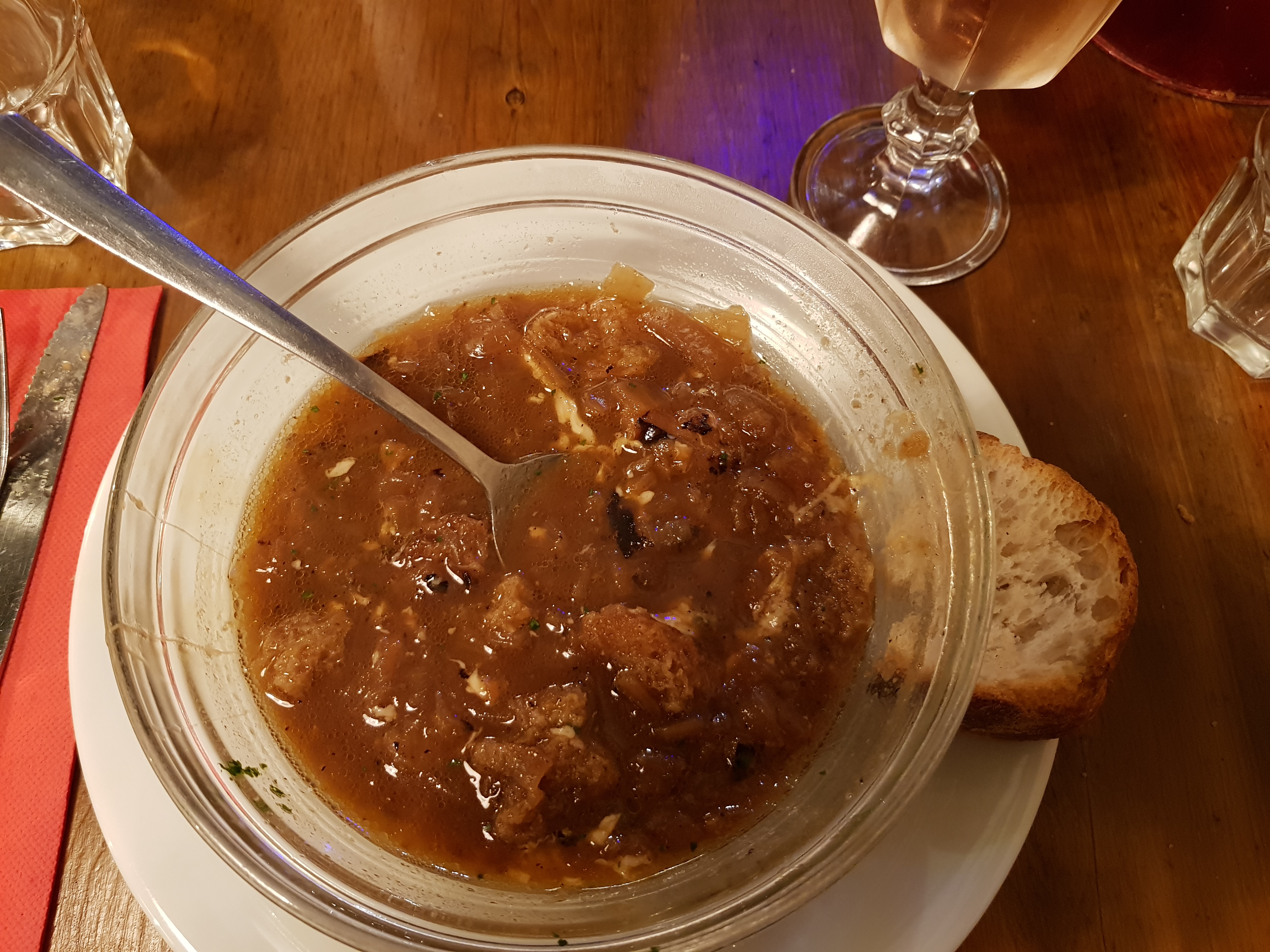 N'Y ALLEZ PAS ! (The menu's translation is not accurate so if you don't speak french you could be surprise on what your ordered) Cocktail promis et offert par la maison. Doggy bag possible selon le serveur mais pas possible. Soupe à l'oignon immangeable (trop de vin notamment) Viande trop cuite (demandée bleu reçue saignante), petits légumes et gratins bons. (avec une sauce au vin) Panacotta caoutchouteuse et beaucoup trop sucrée, le coulis était très bon. Conclusion : Gaspillage (entrée et dessert) pour 17€ on nous vend du fait-maison alors que la serveuse découpait la tarte aux pralines depuis un plat métallique (probablement acheté en super-marché), d'ailleurs lorsque j'ai choisi mon dessert j'ai demandé du melon sans sirop (ayant aperçu le-dit melon sur la table voisine) et apparemment ce n'était pas possible... (sinon avec une passoire c'était largement faisable).