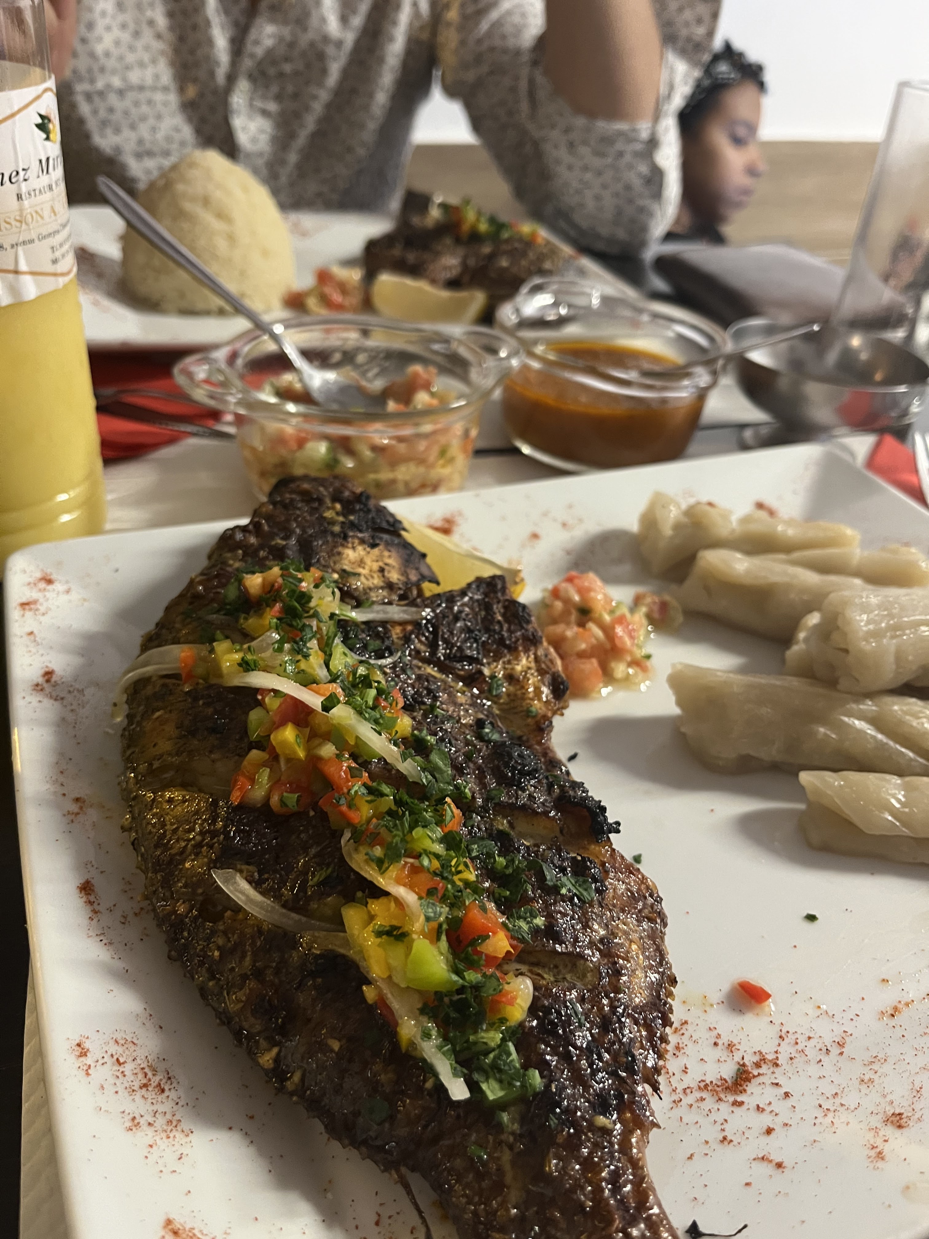 Bonjour, Nous avons passé un excellent moment Chez Marie Ange. Le poisson (tilapia), les Allocos ainsi que l’atieké étaient tous extrêmement délicieux, que dire ? La quantité était parfaite (copieuse), tout était savoureux! On vous le recommande fortement 🥰 14 ✨ sans hésitations 👍🏾