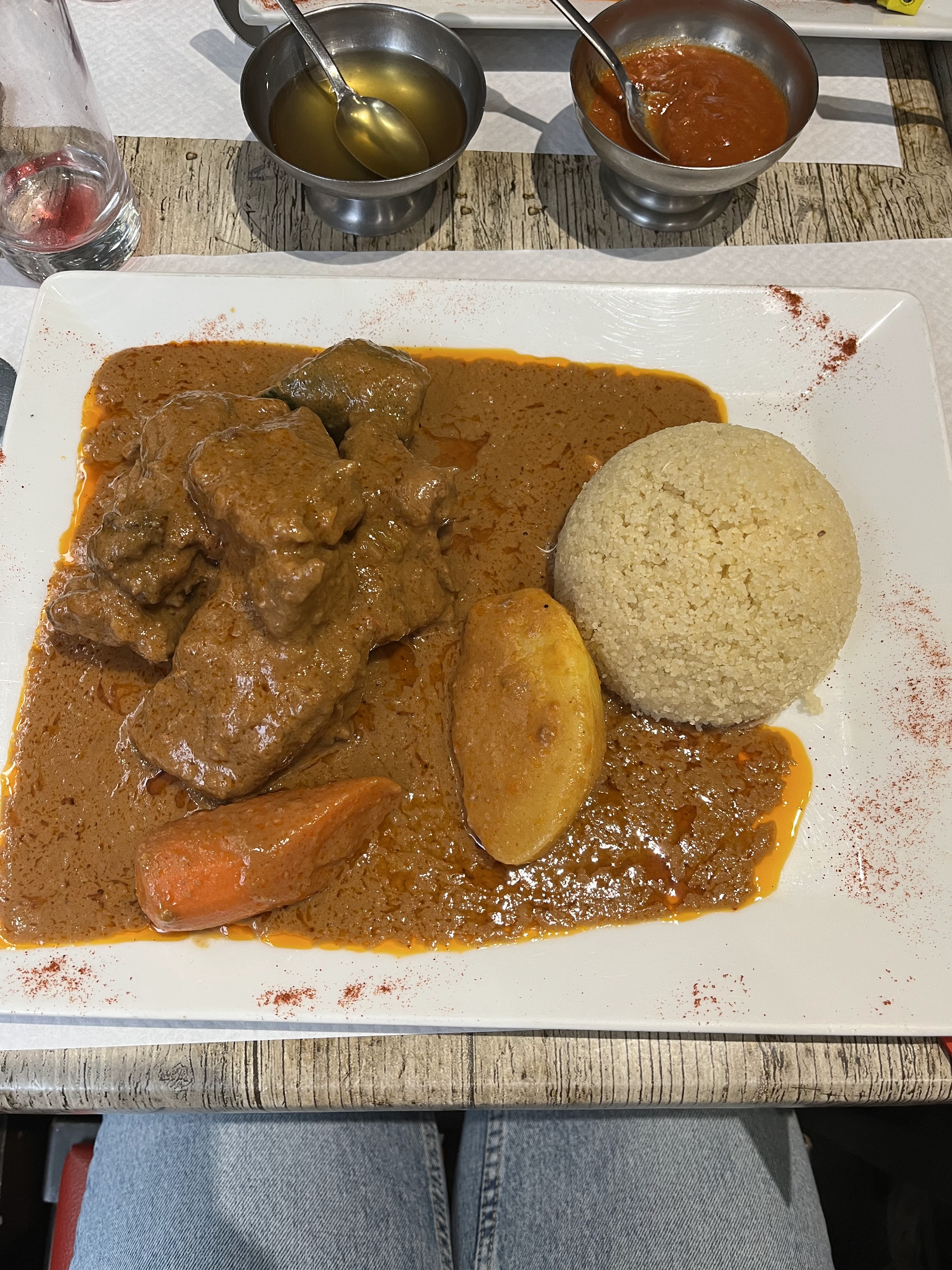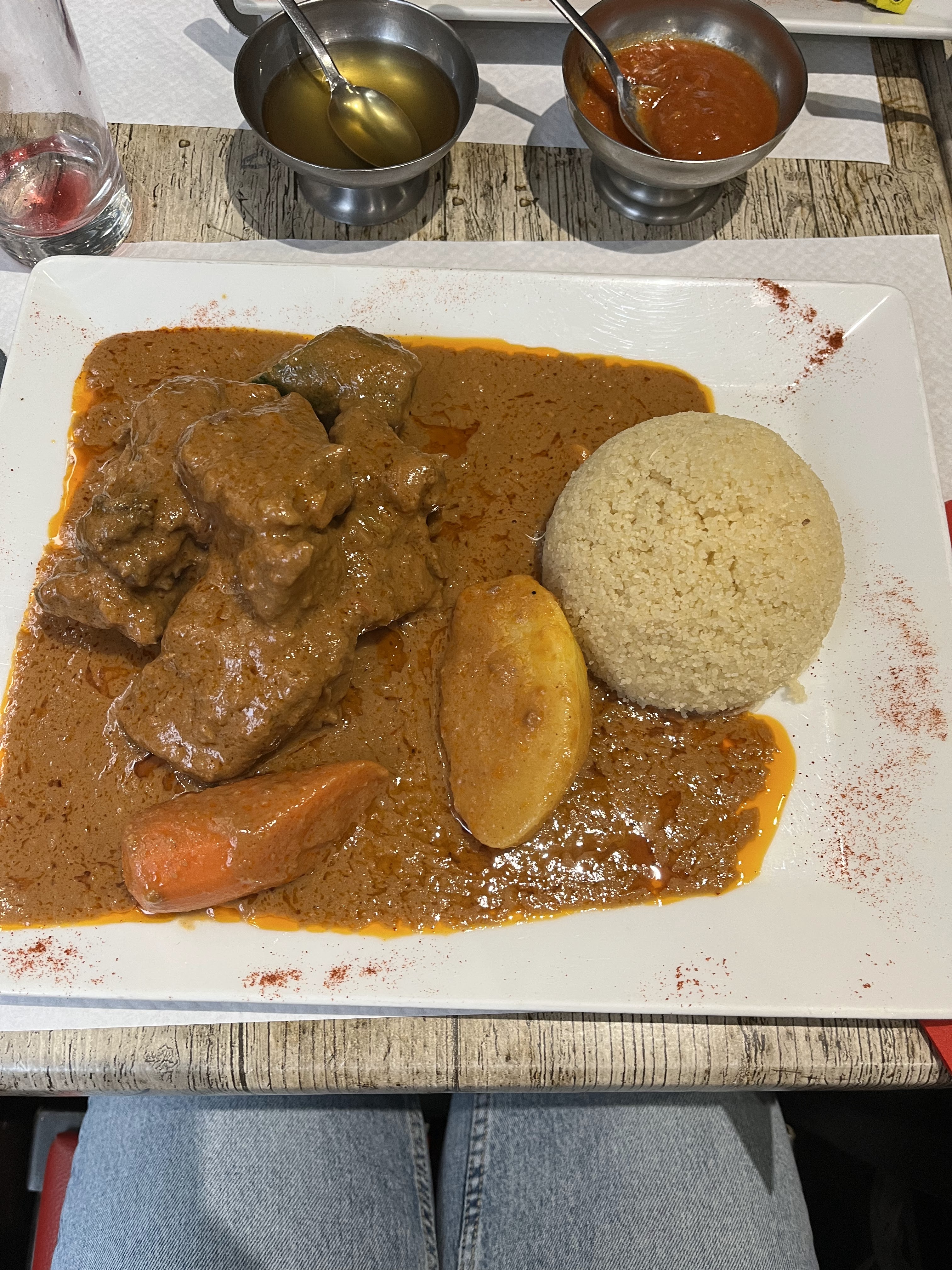 je rêvais d'un Mafé depuis 20 ans, mais quelle déception! Pas de gombo, pas de patate douce mais une pauvre demi-carotte, une courgette et une mini pomme de terre !! le poulet était correct et le dôme de riz, copieux. Bref, très déçue. Le personnel est aimable, ce qui est d'autant plus dommage!