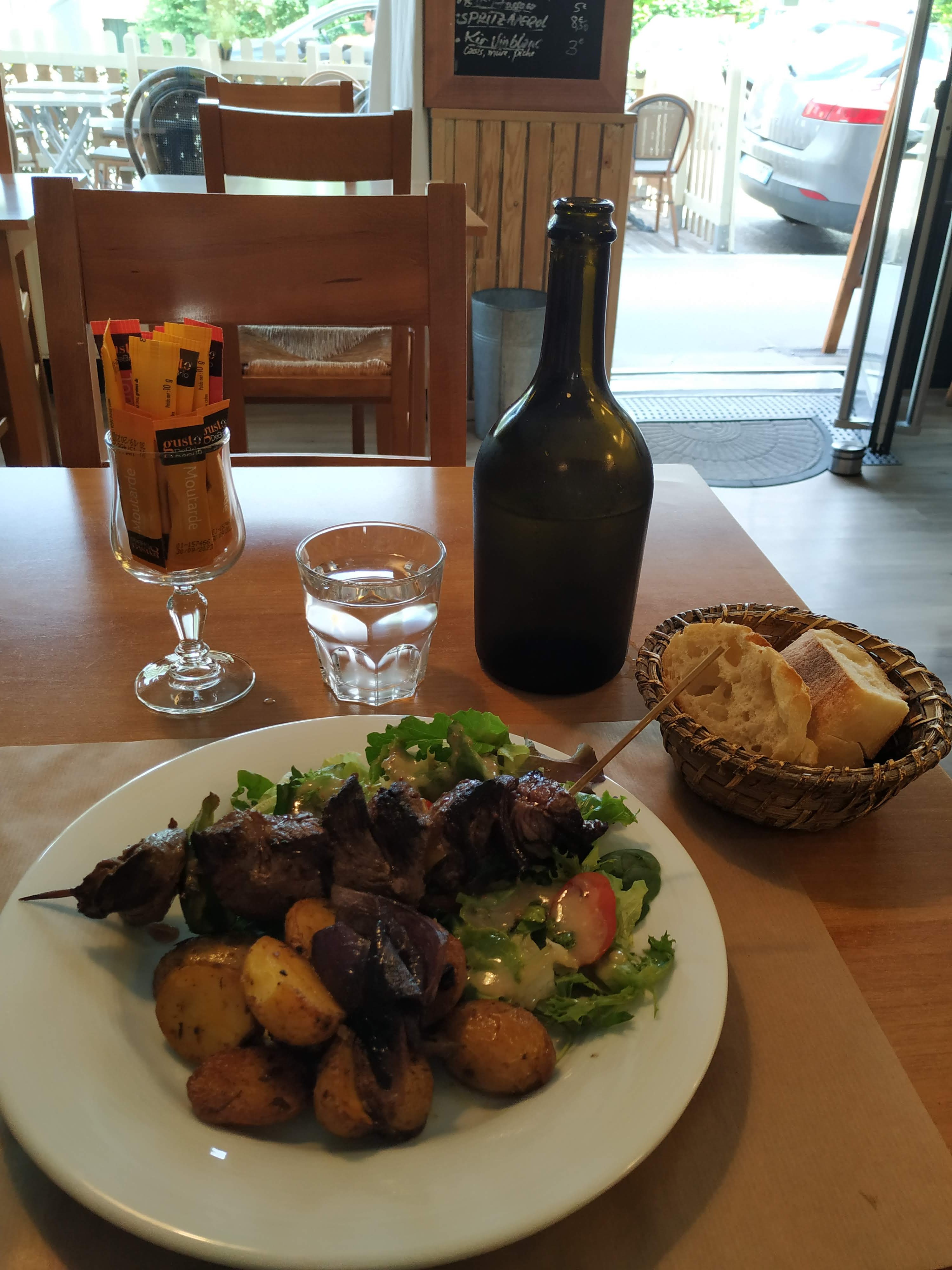 Je suis arrivé à 15h00, en dehors de l'heure du déjeuner, mais sans problème. Bonne brochette de bœuf Plat du Jour à 12 € avec pommes de terre en accompagnement et salade verte.