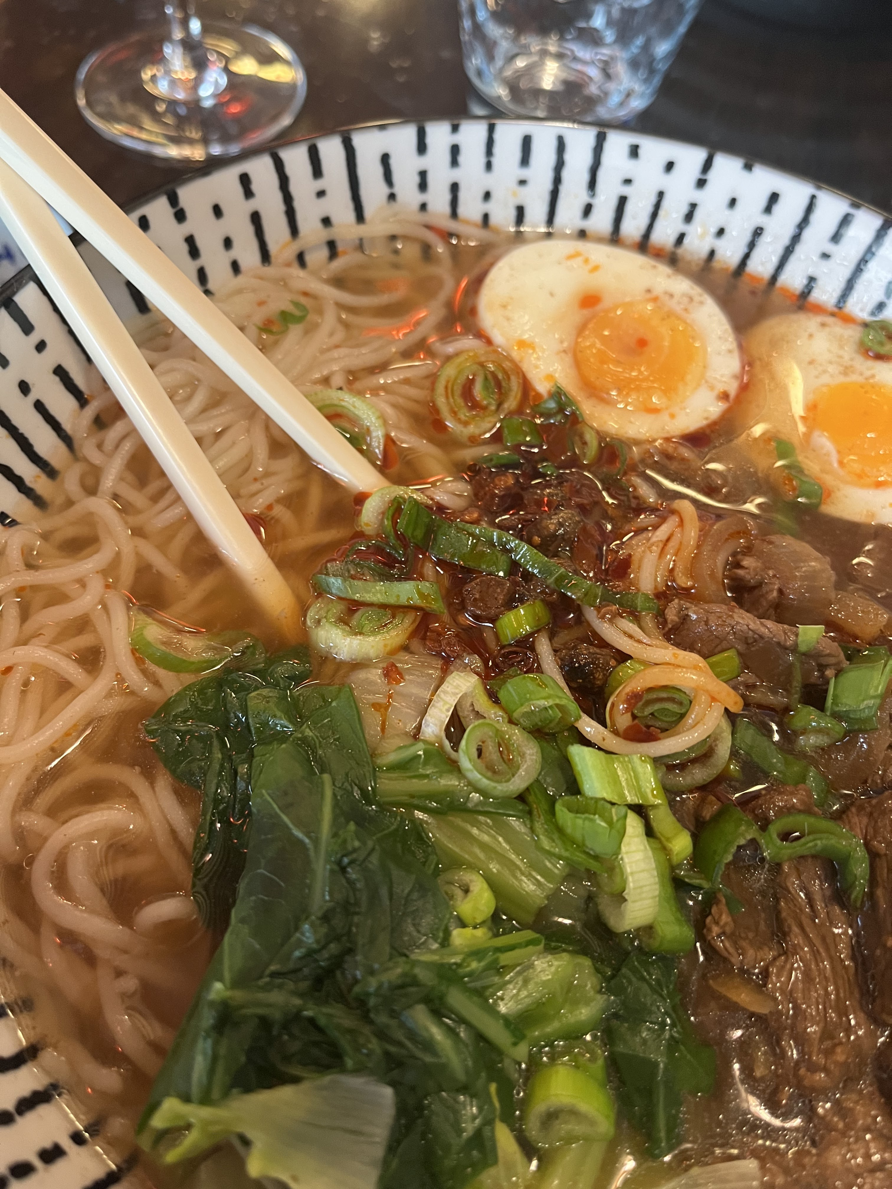 Délicieux ! Nous avons mangé en entrée des gyosas au poulet avec des nems, puis des ramens au bœuf, goûté les dimsum (une très belle découverte) et on a fini par une crêpe en dessert tout cela pour un prix très raisonnable, un service top dans un beau petit resto. Félicitations à la cheffe 😊
