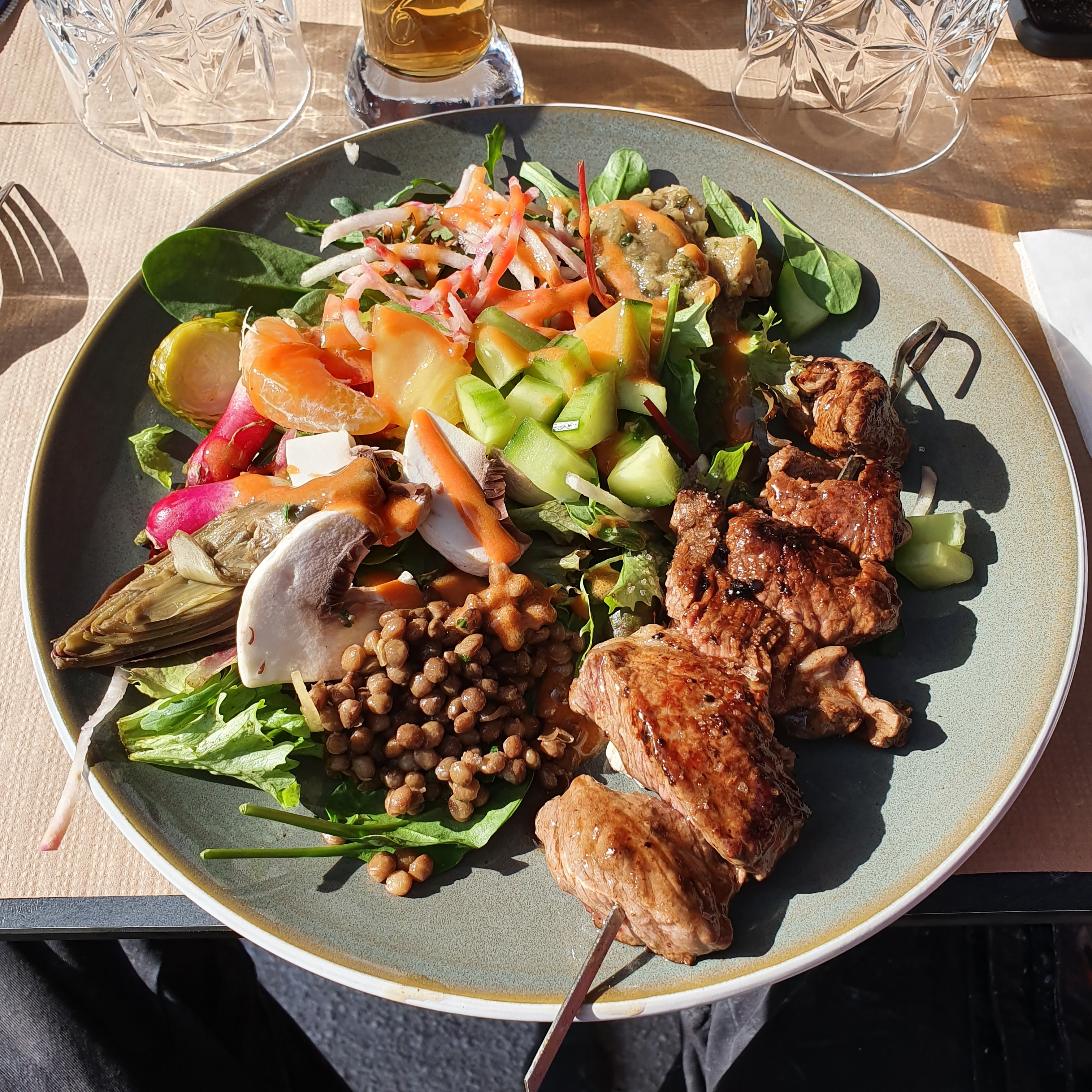 Salades et viande délicieuses, plat copieux, service nickel et joli décor, le tout pour un prix raisonnable!! Ne changez rien, on recommande les yeux fermés!!!