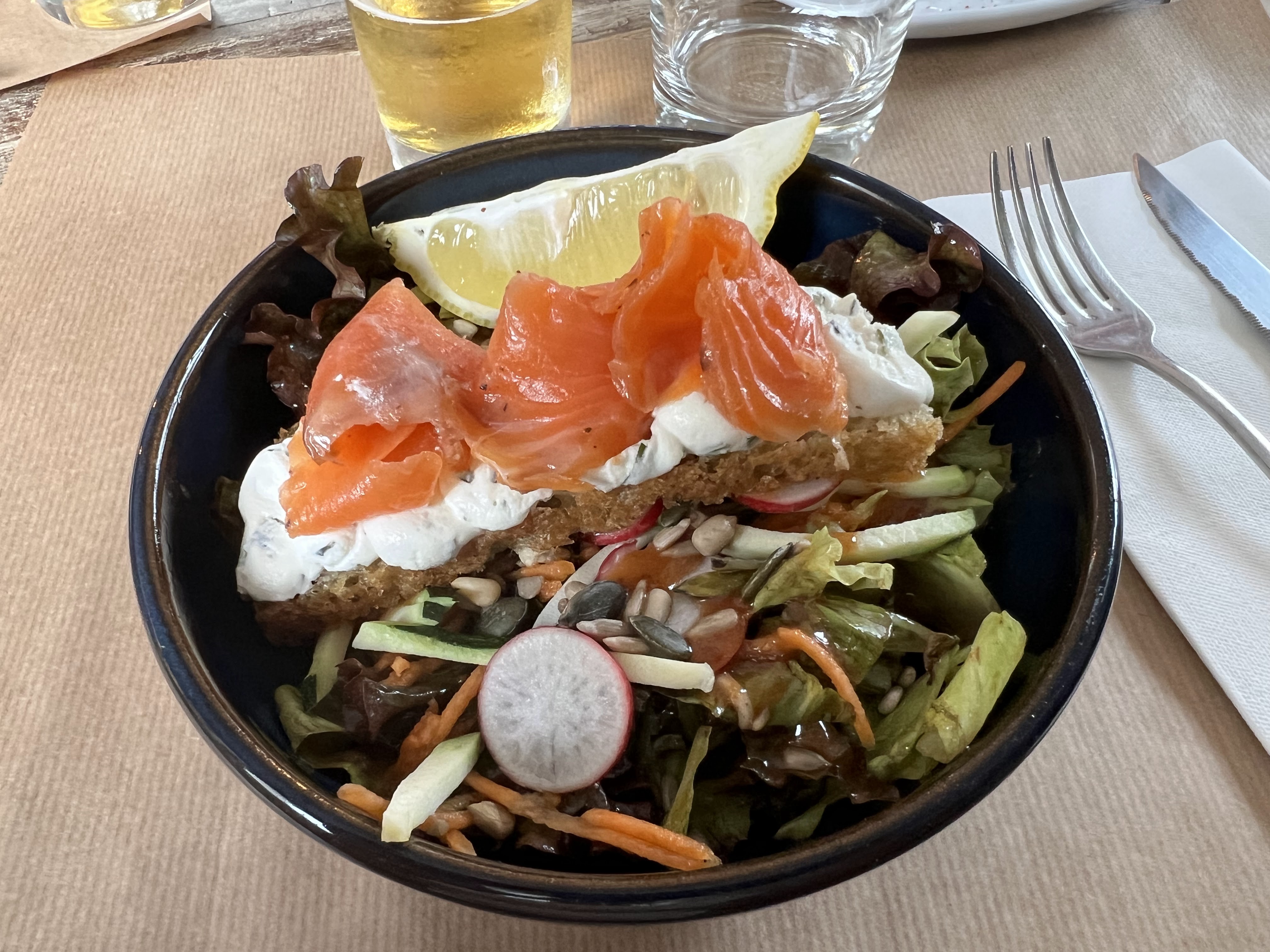 Nous avons déjeuné en famille avec 2 enfants de 9 et 11 ans. Les plats frais et de très bonne qualité. Le service impeccable. Je recommande.