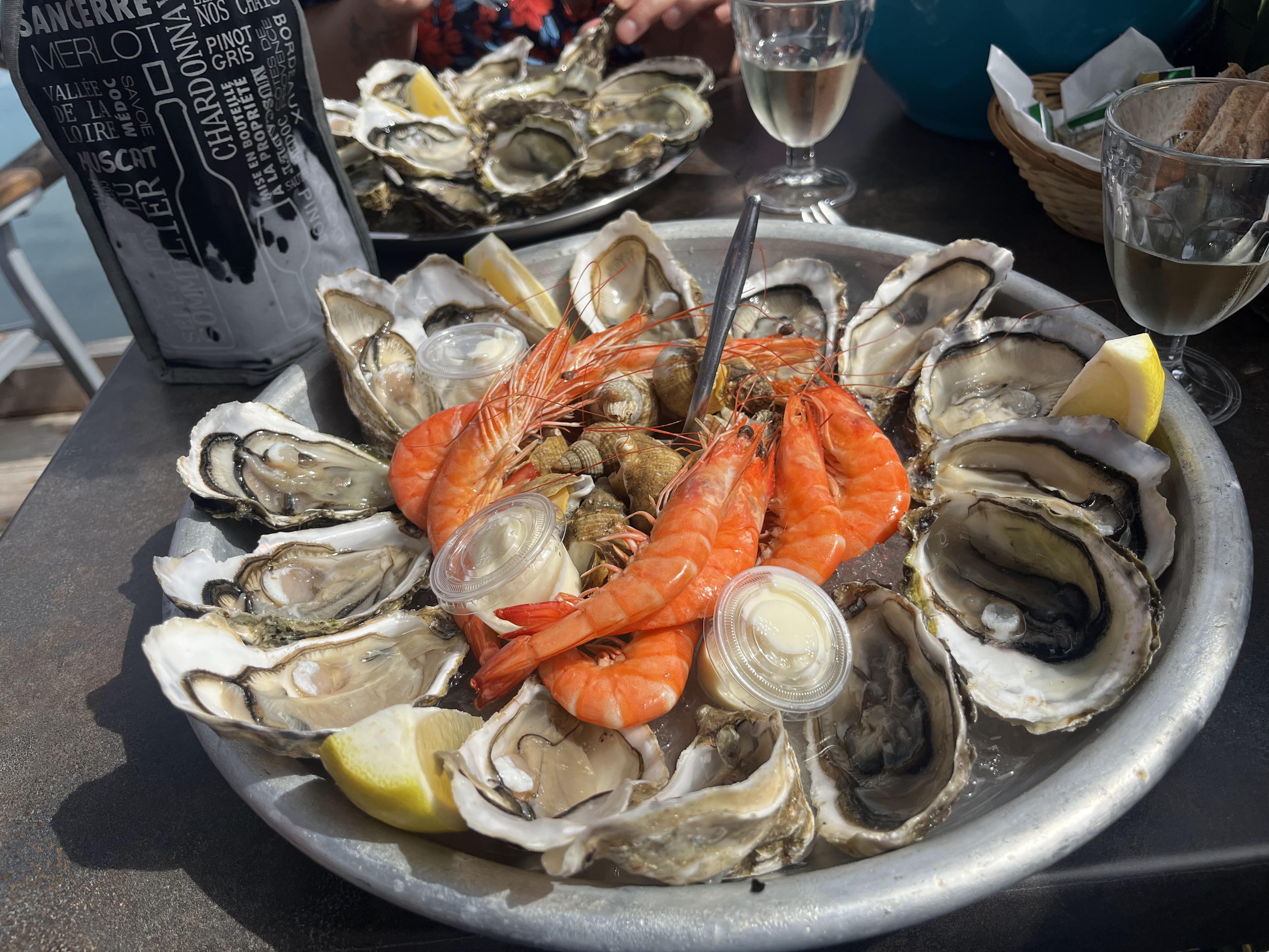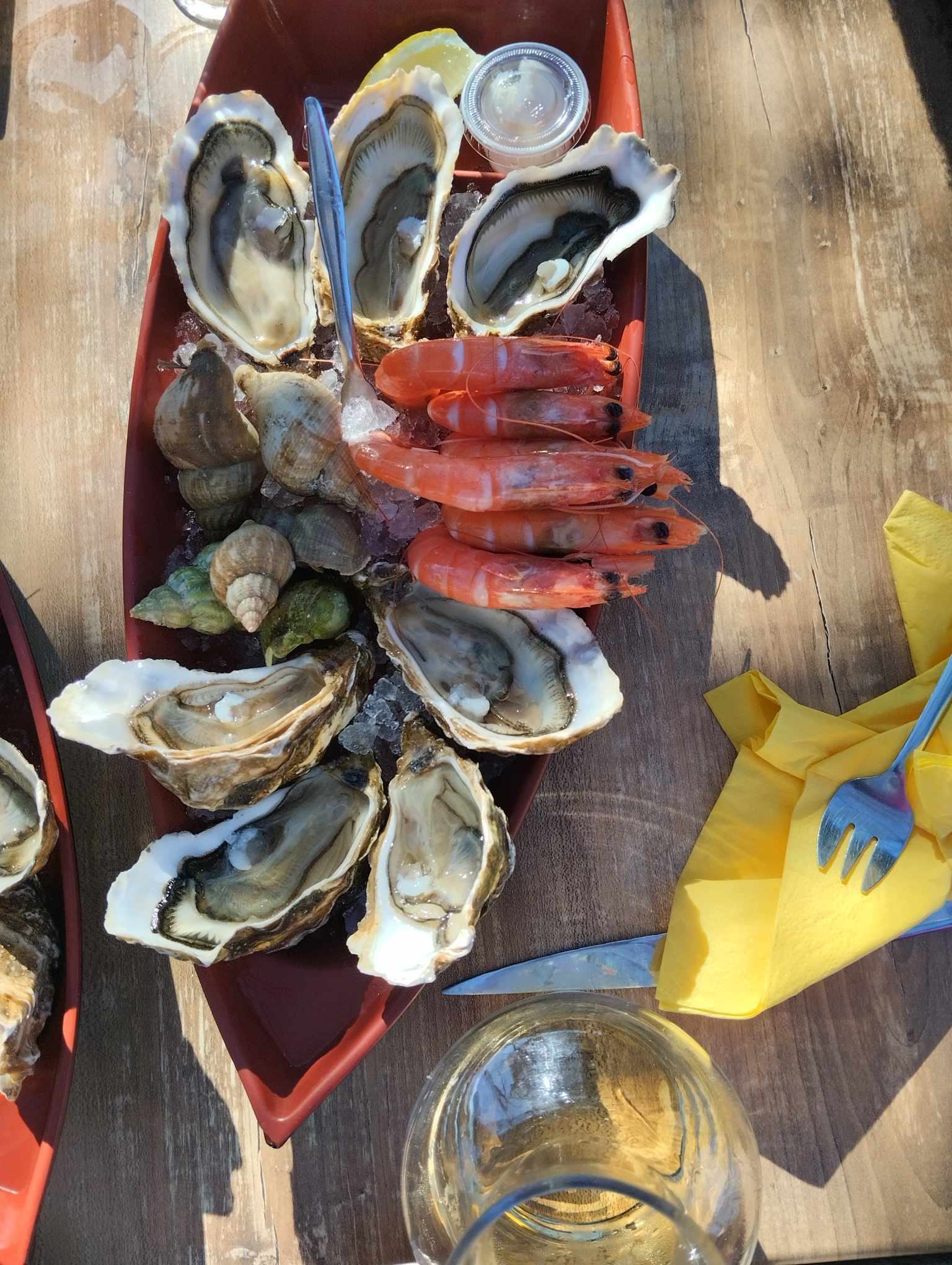 Le soleil se couche... Huîtres et crevettes arrosées d'un bon picpoul ... C'est ça le bonheur !