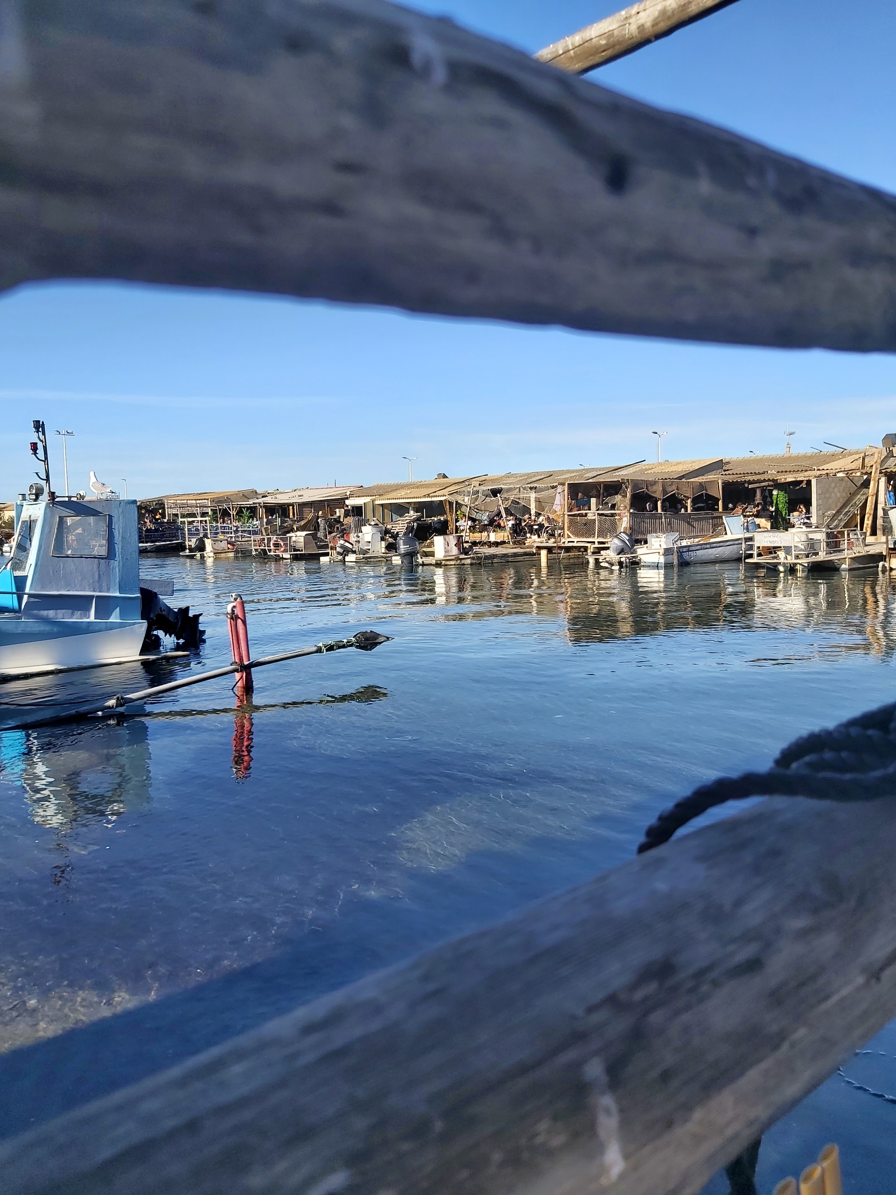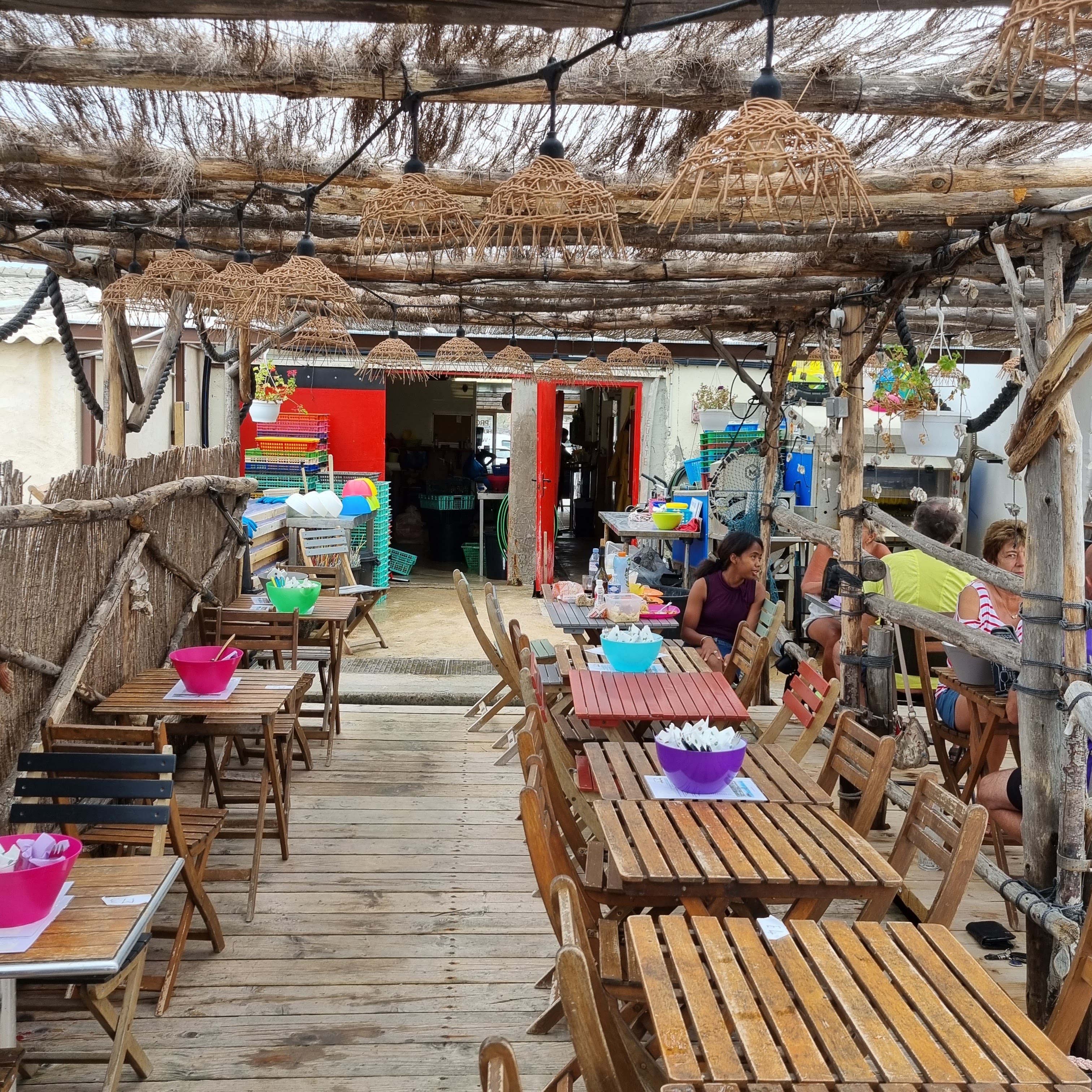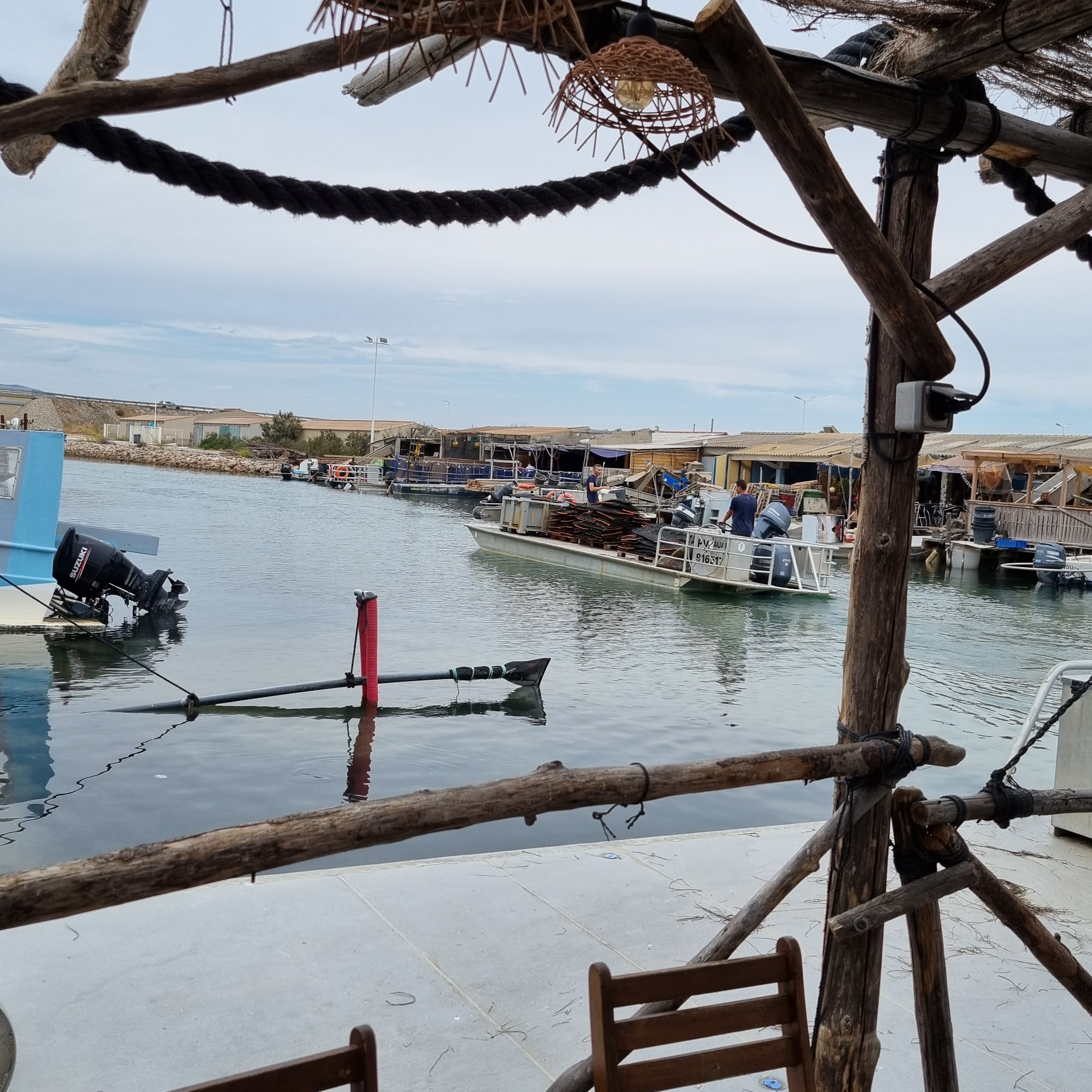 Terrasse sympa au bord du Grau de Leucate. Parfait pour une dégustation d'huitres.