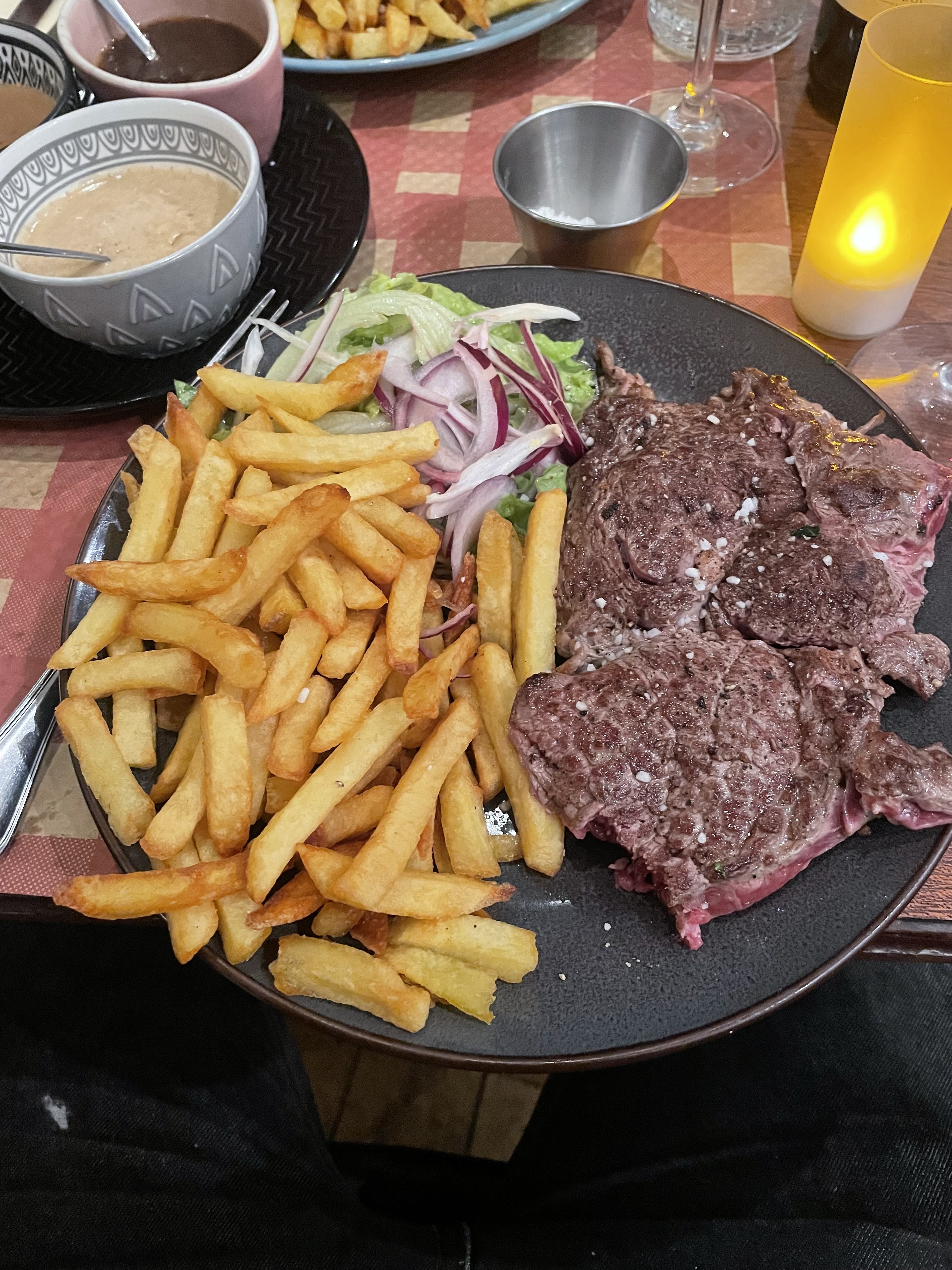 Nous étions ici avec un groupe de touristes EF pendant une semaine et nous n'avons pas eu l'occasion d'essayer cela avant la dernière nuit où nous étions ici… et je n'arrive pas à décider si c'est bien, donc je ne comparerais pas tous les autres restaurants avec celui-ci et je serais déçu… OU si j'avais raté mon coup en ne mangeant plus ici ! C'était absolument la meilleure nourriture que nous ayons eue pendant tout notre voyage ! Délicieux steak, frites croustillantes et la MEILLEURE crème brûlée. Sans parler de loin du meilleur service que j’ai connu dans n’importe quel restaurant (ici, aux États-Unis, etc.) depuis des années. Nous avons même reçu une excellente recommandation du propriétaire pour les accords mets et vins. Merci beaucoup, Chez Maurice !!