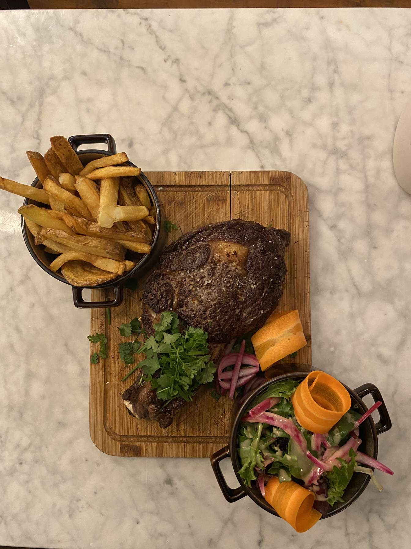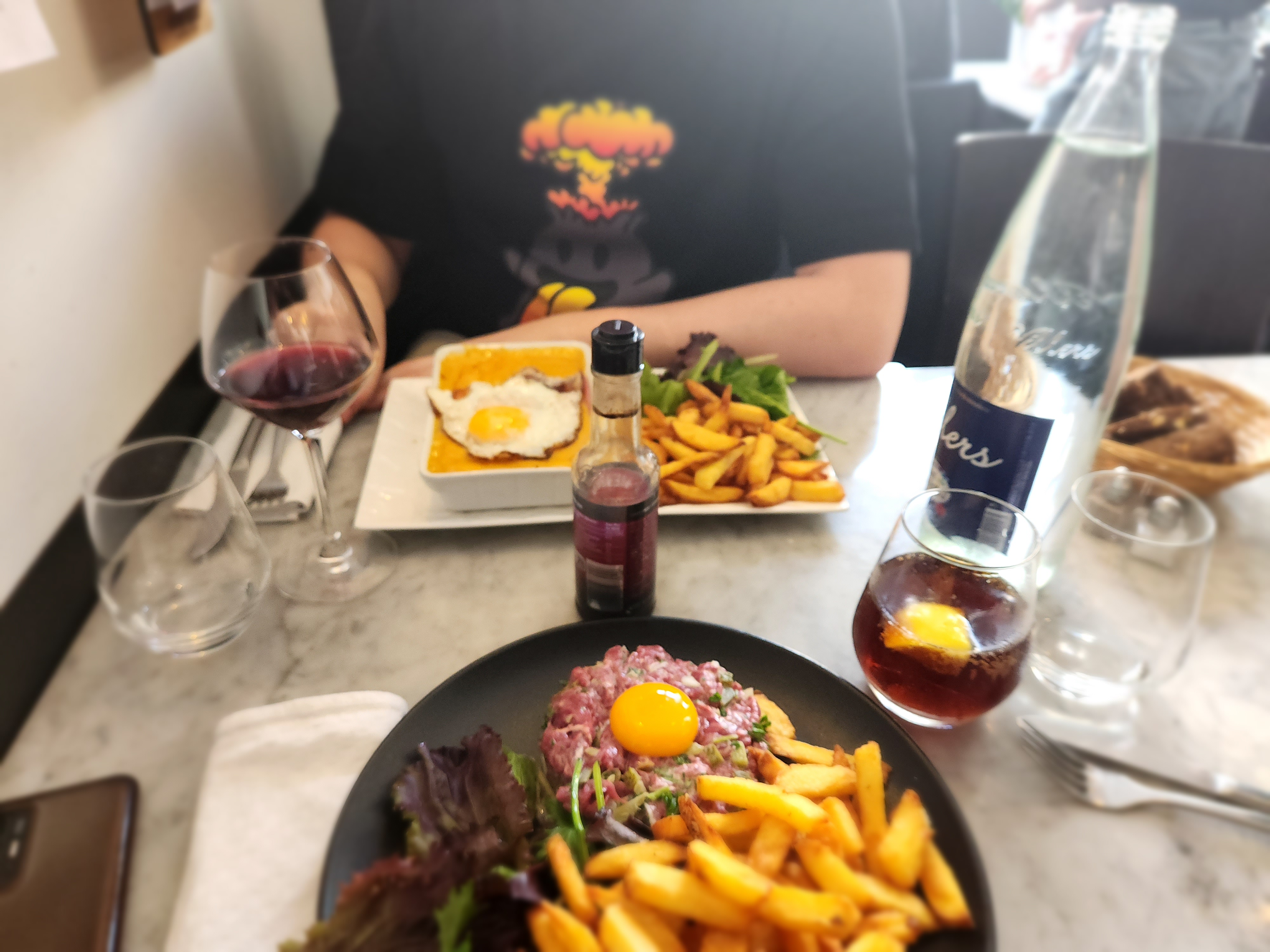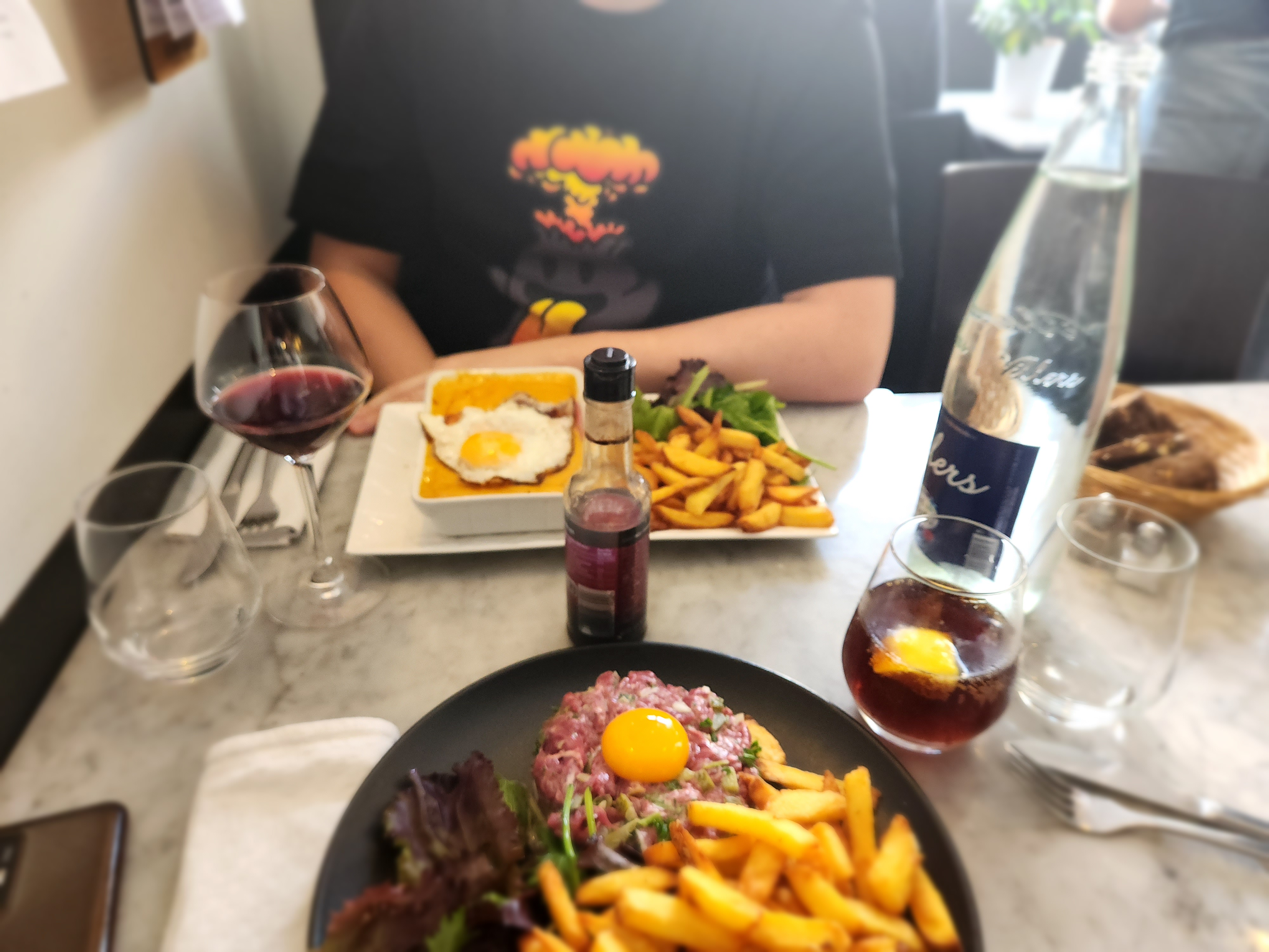 Bonjour. Belle qualité des plats. La côte à l'os à partager, très gouteuse, aurait justifié d'avoir ...3 assiettes. La restriction, pour 2, semble inappropriée. Belle soirée cependant dans ce bistrot.