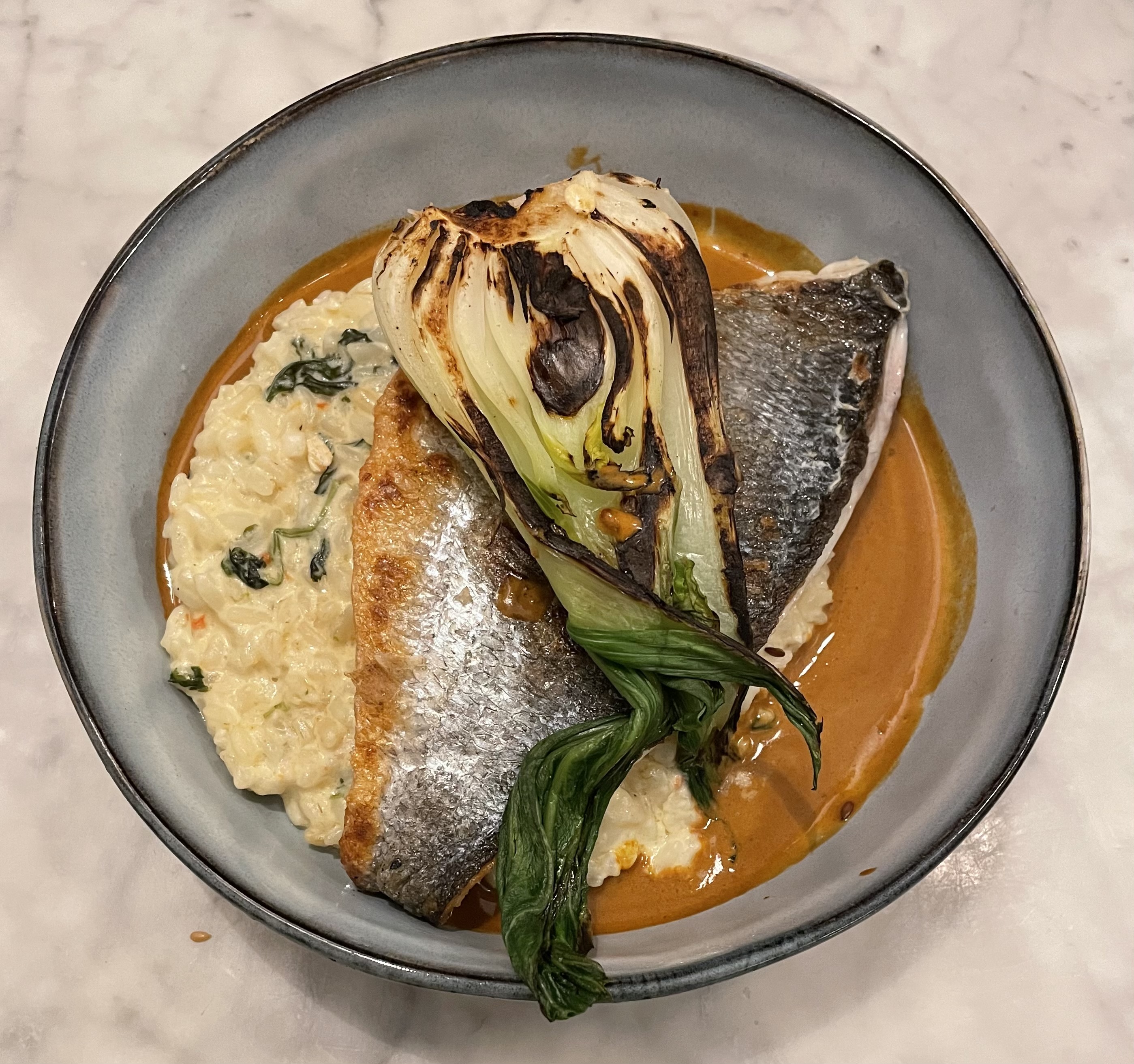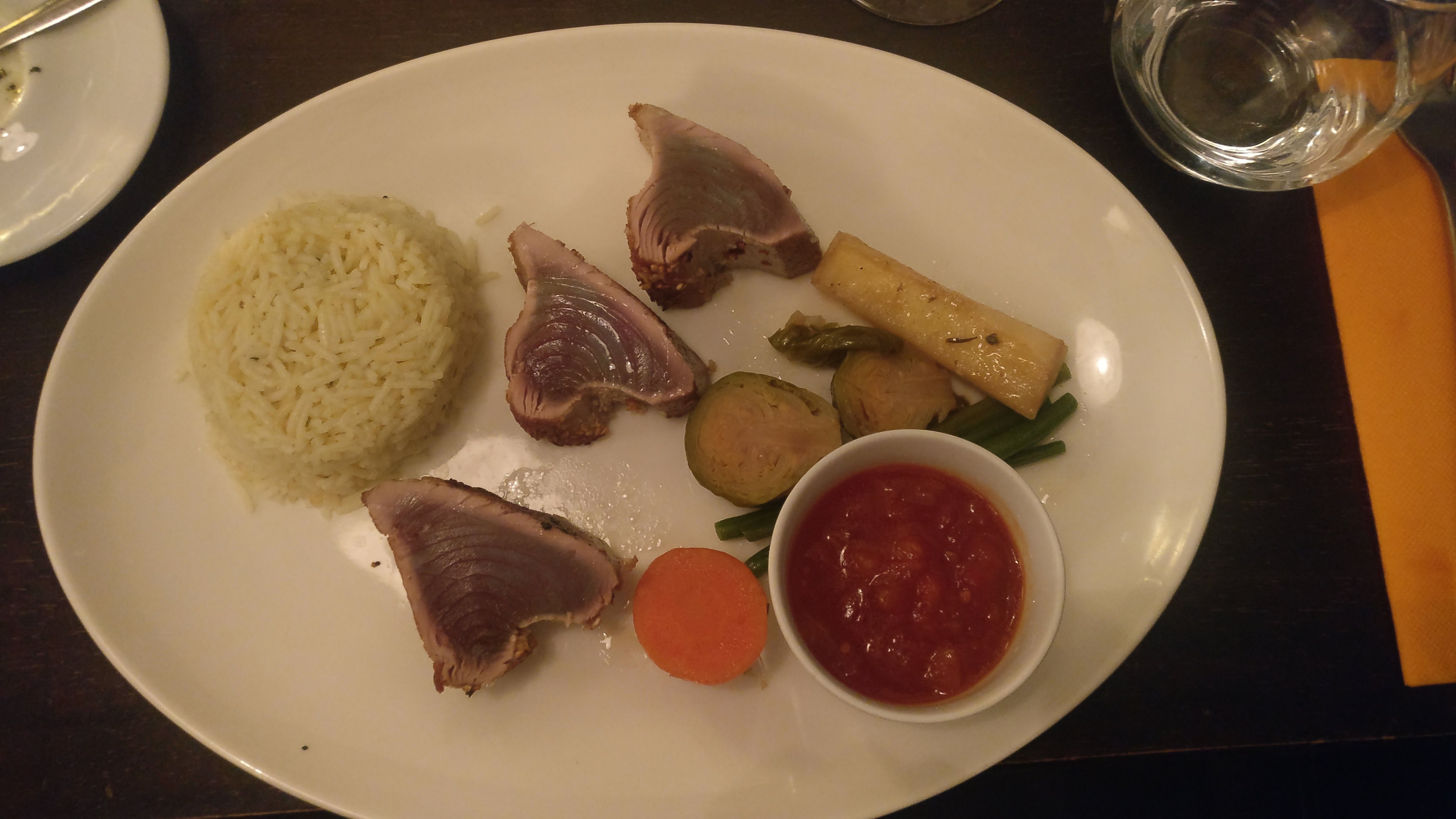 Espadon mi cuit super bon et cuisson parfaite, par contre la sauce et les légumes étaient état froids, quel dommage Dessert gourmand super décevant (baba au rhum vraiment pas bon)