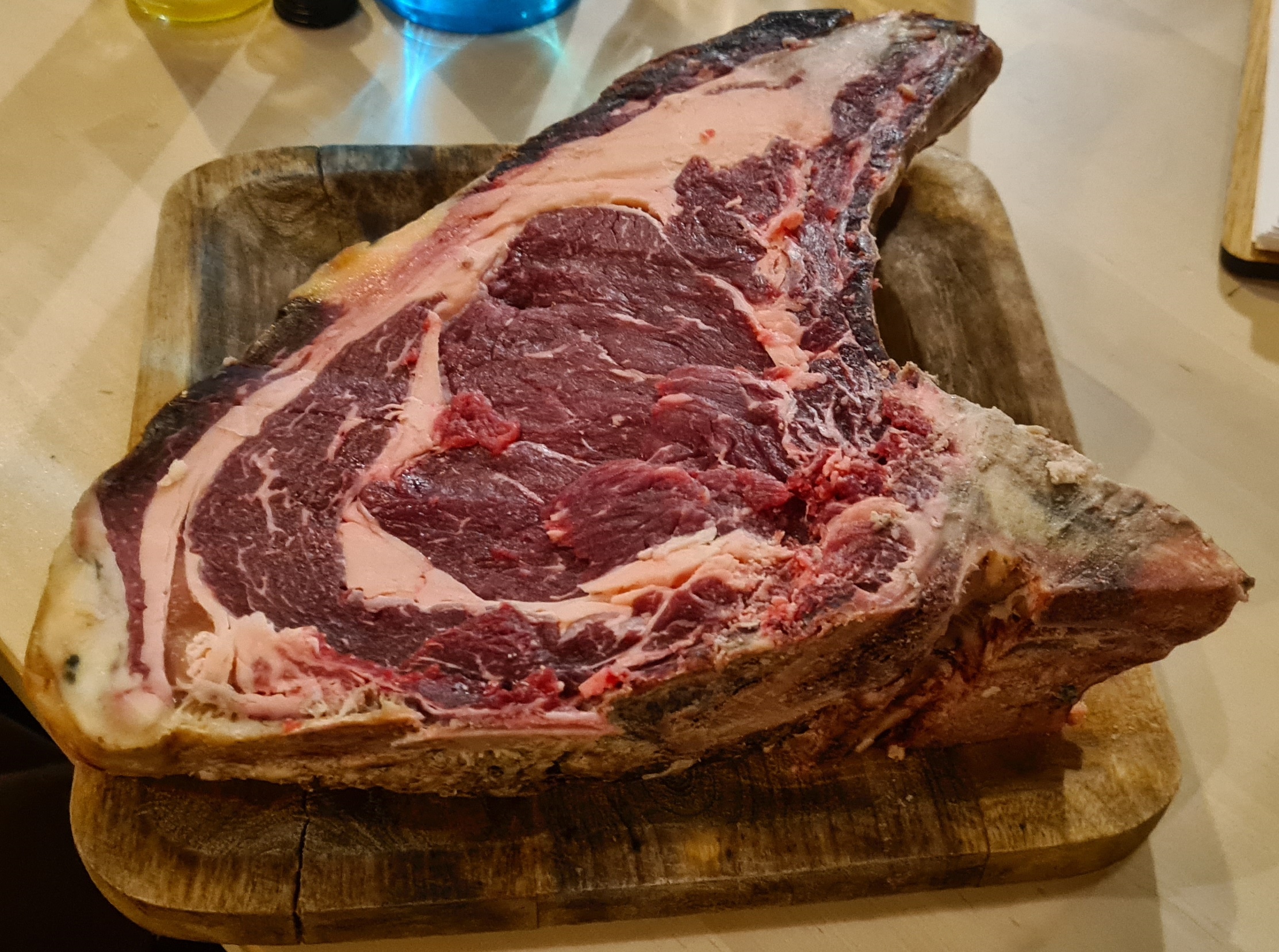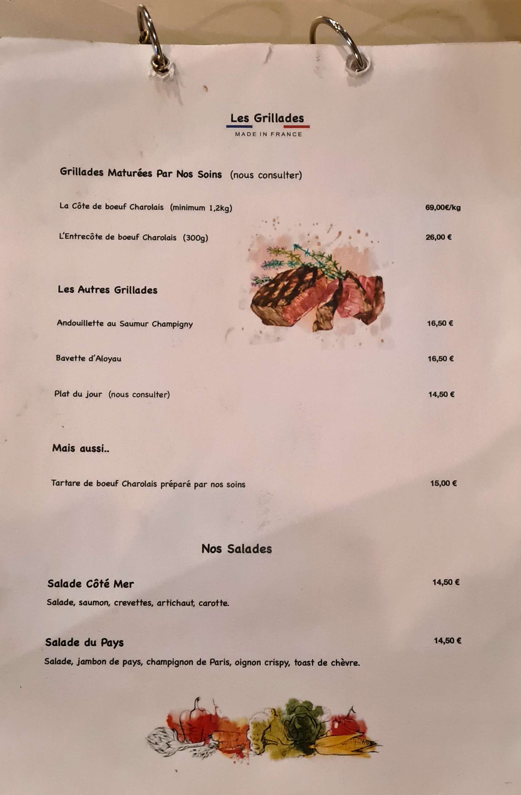 Cadre agréable. Une fois de plus, nous avons porté notre dévolu sur une côte de bœuf maturée...à presque 4 mois = un régal pour nous amateurs : grillée à l'extérieure, bleue à l'intérieure... nous en salivons encore . Accompagnement parfait : frites maison à la graisse bœuf + salade sympathique. Le patron nous l'a présentée avant cuisson. Sans quoi il y a plein de petits tapas à la française qui sont alléchants. Bravo et continuez ainsi ! Service très agréable. Nous reviendrons bien entendu à notre prochain séjour.