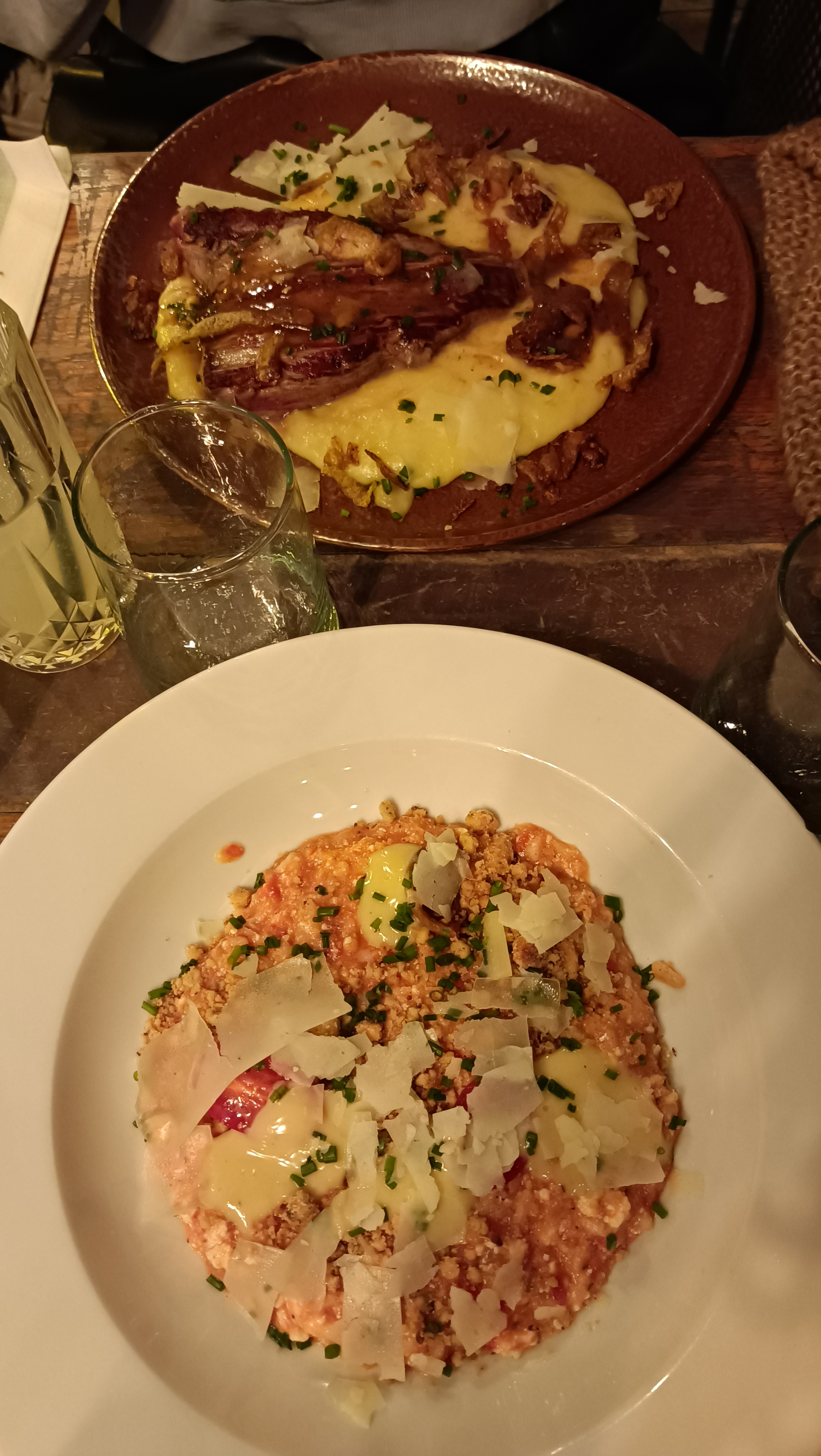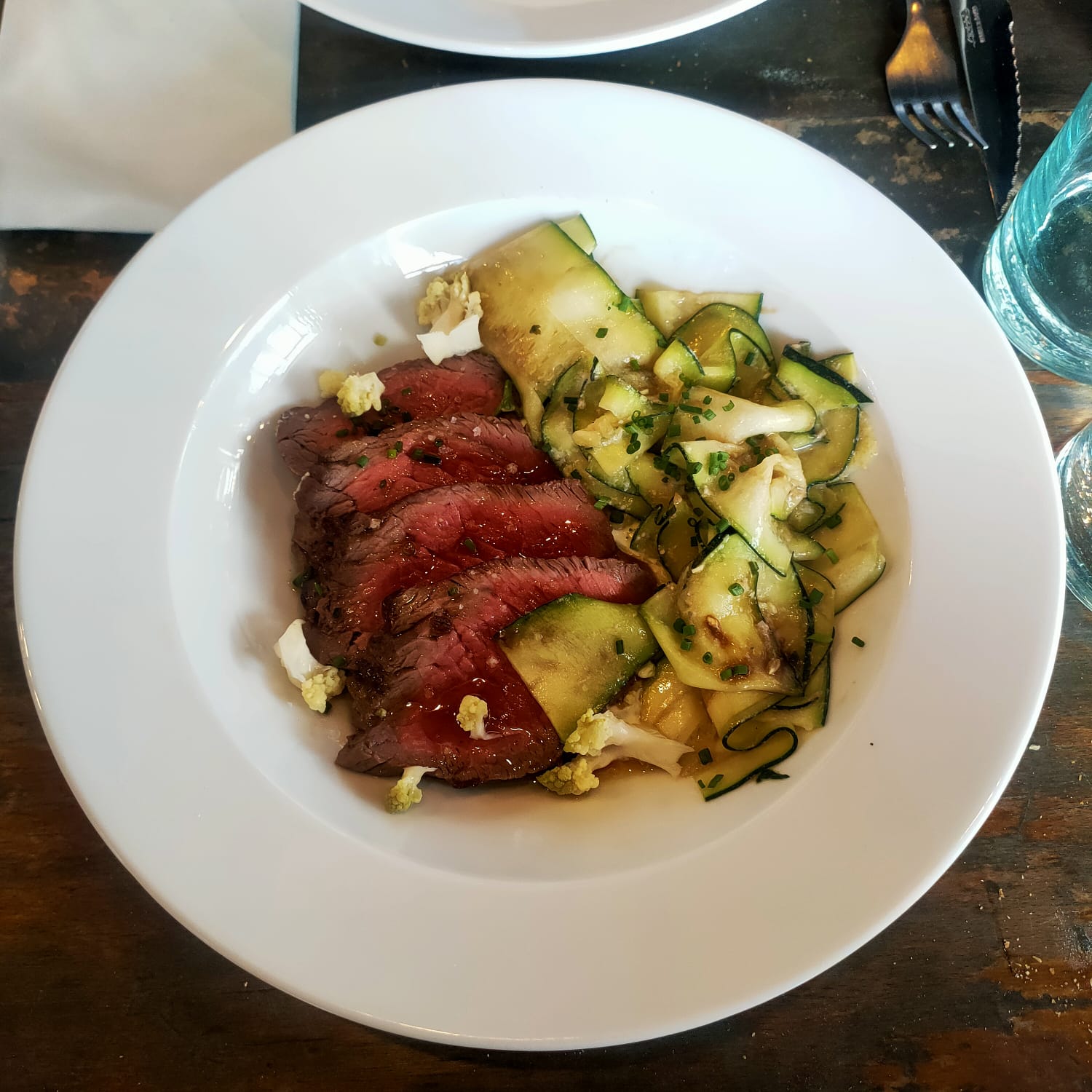 Délicieux ! Beignets courgette très bons Tagliata boeuf et Risotto veggie partagés à 2 (risotto peut être triste tout seul) Vin rouge pas à notre goût mais pas mauvais. Service excellent, serveuse et barman très agréables.