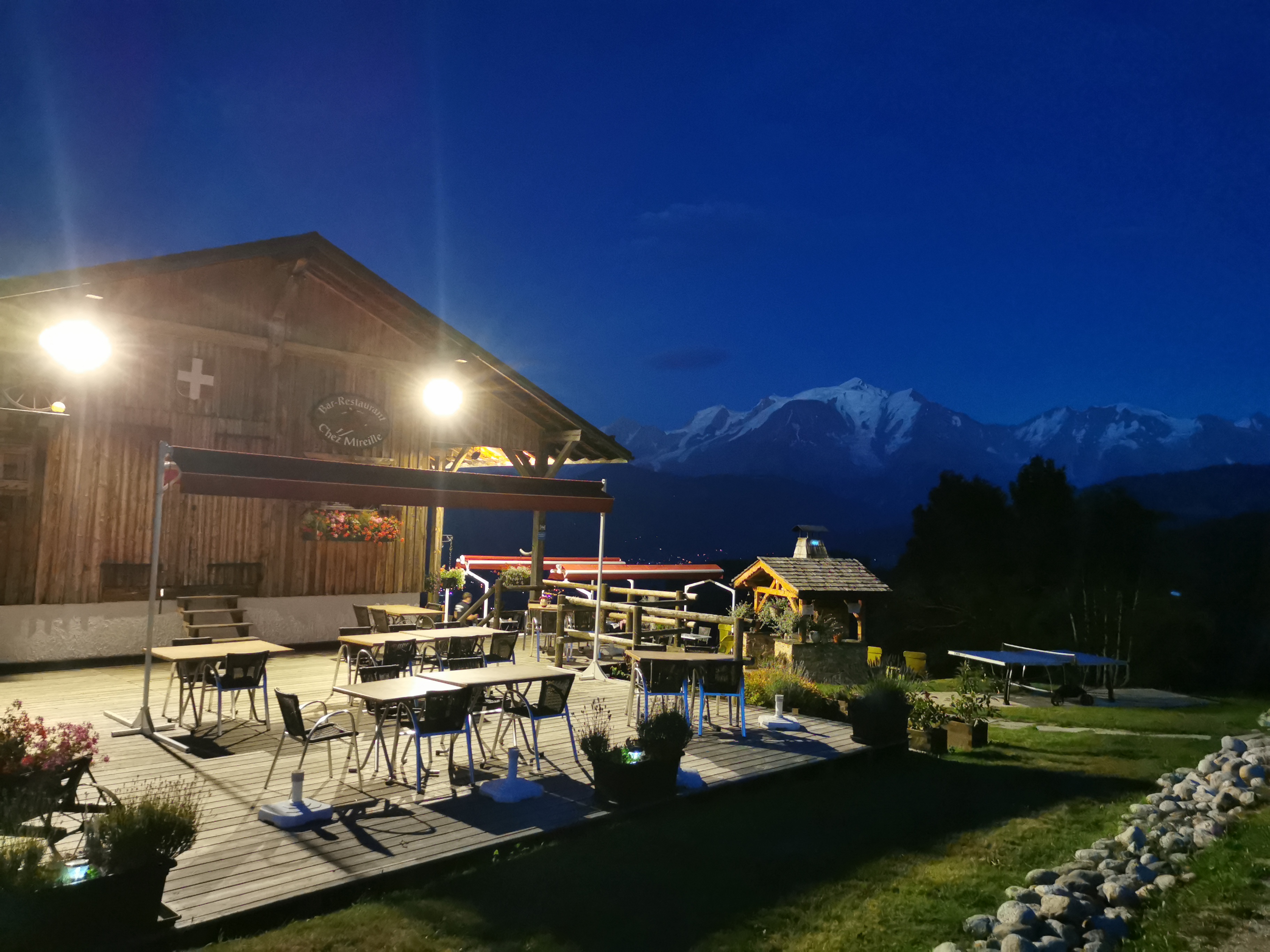 Super resto avec super vue sur le Mont Blanc. Un vrai régale pour les papilles et pour les yeux. Petit terrain aménagé avec jeu pour les enfants (balançoire, toboggan, petit maisonnette en bois). Le plus le petit terrain de boules avec les boules a dispo pour la digestion entre amis 👍. Adresse a refaire et conserver pour les prochaines vacances