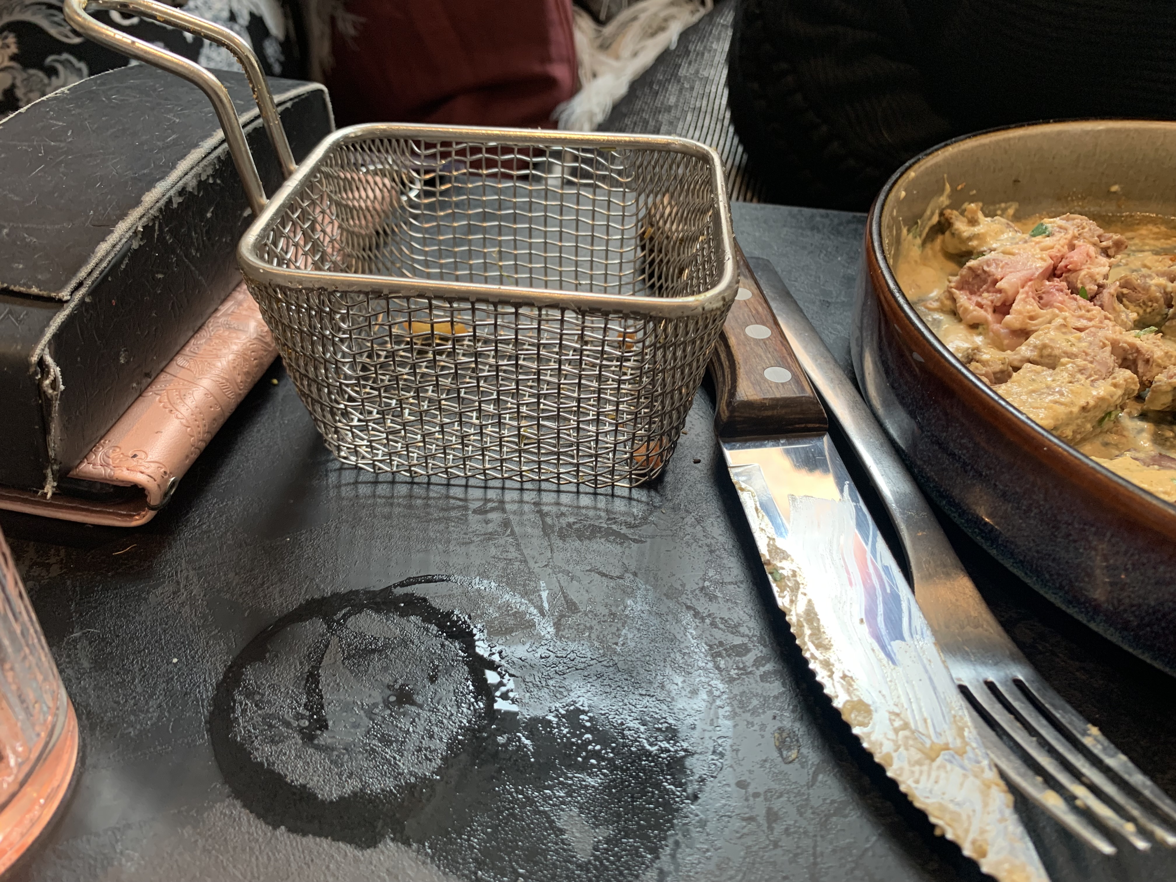 Le cordon bleu était bon. Le fromage bien fondant à l'intérieur. La panure à l'extérieur était croustillante. Bonne sauce au champignon. Les frites ont une forme particulière. On a pas le côté mâche de la pomme de terre. Elles sont surtout croustillantes ~18€. La tarte tatin était bonne mais trop sucrée. Le nom des plats est bien trouvé et original.