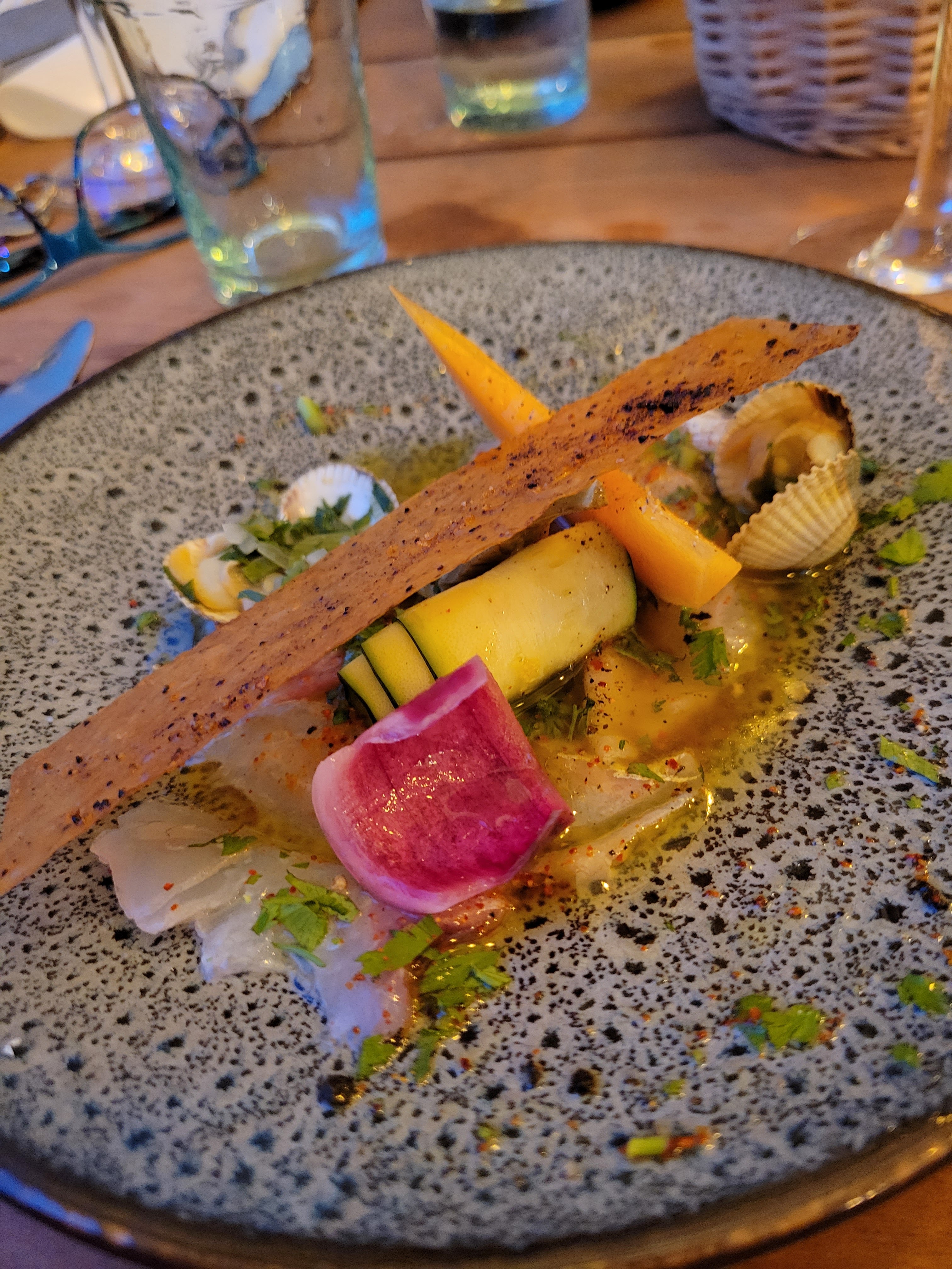 Nous avons passé un agreable moment, la cuisine est très bien travaillée, de beaux assemblages de saveurs et un visuel très accrocheur. Les mets présentés sont très frais et très bons. Le seul bémol et non des moindres est le prix et l'addition final, certains plats proposés à l'apéritif sont justes exorbitants (12 euros pour 2 crevettes panées....) et seulement un menu à 45 euros, ou a la carte entre 19 et 30 euros... Mais je vous recommande d'y aller, on passe vraiment un bon moment gustatif.
