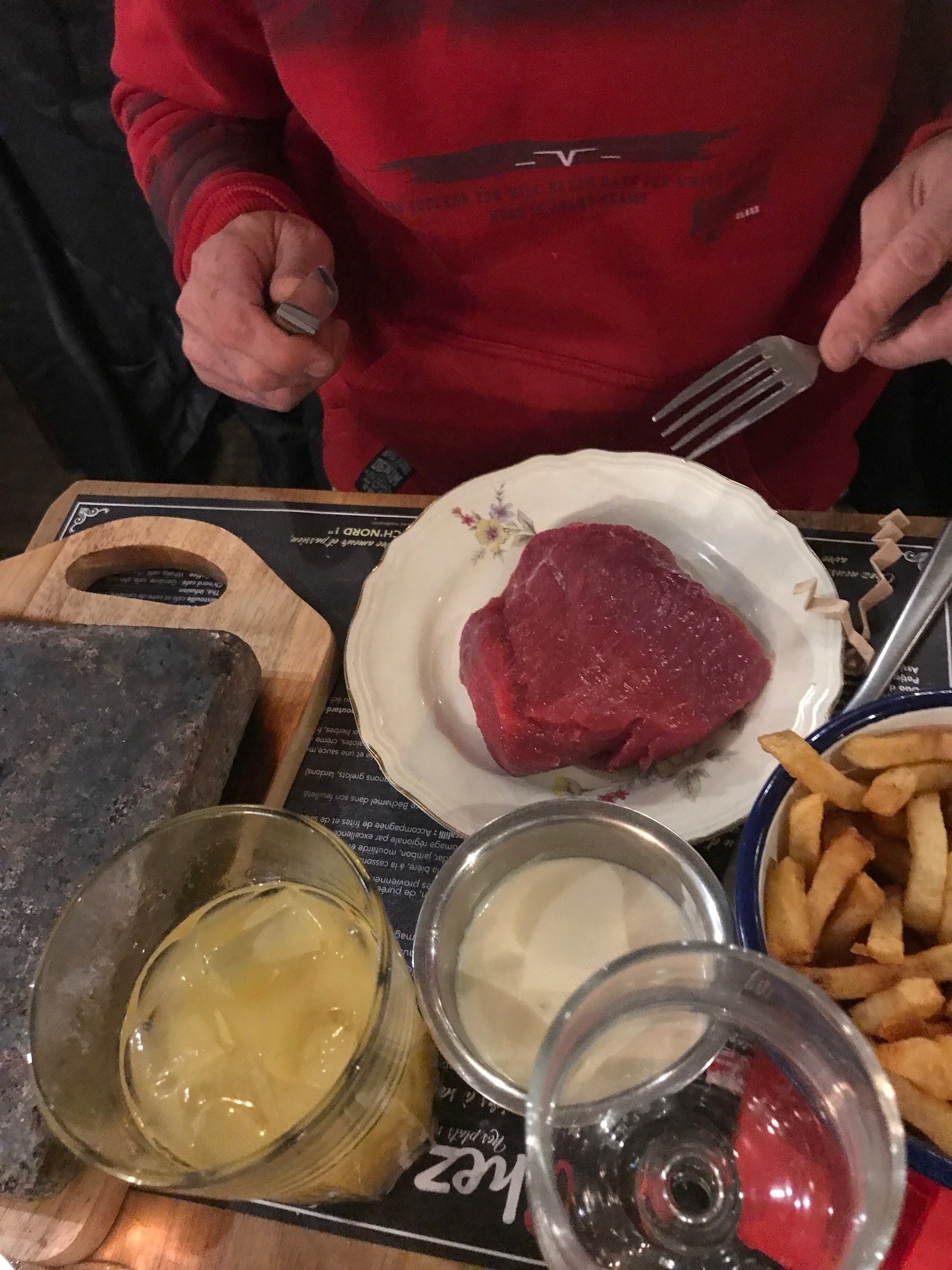 Attirés par les très bons avis ce restaurant, nous nous décidons avec mon compagnon d'aller y manger un morceau. Lorsque nous sommes arrivés, nous nous sommes aperçu d'un manque de personnel car les serveurs avaient l'air débordés ( personne nous a accompagnés à notre table). Le service était moyen car malgré la sympathie des serveurs, on a oublié de décapsuler notre boisson, aucun couteau à viande nous a été donné et le fait de cuire notre steak nous même sur une pierre chaude nous a grandement étonnée voir même déçu. Les plats étaient médiocres, sans saveurs, sauf les frites qui étaient excellentes. Bref.... restaurant avec un gros potentiel mais qui manquent cruellement de personnel qualifiés que ce soient en service ou en cuisine.
