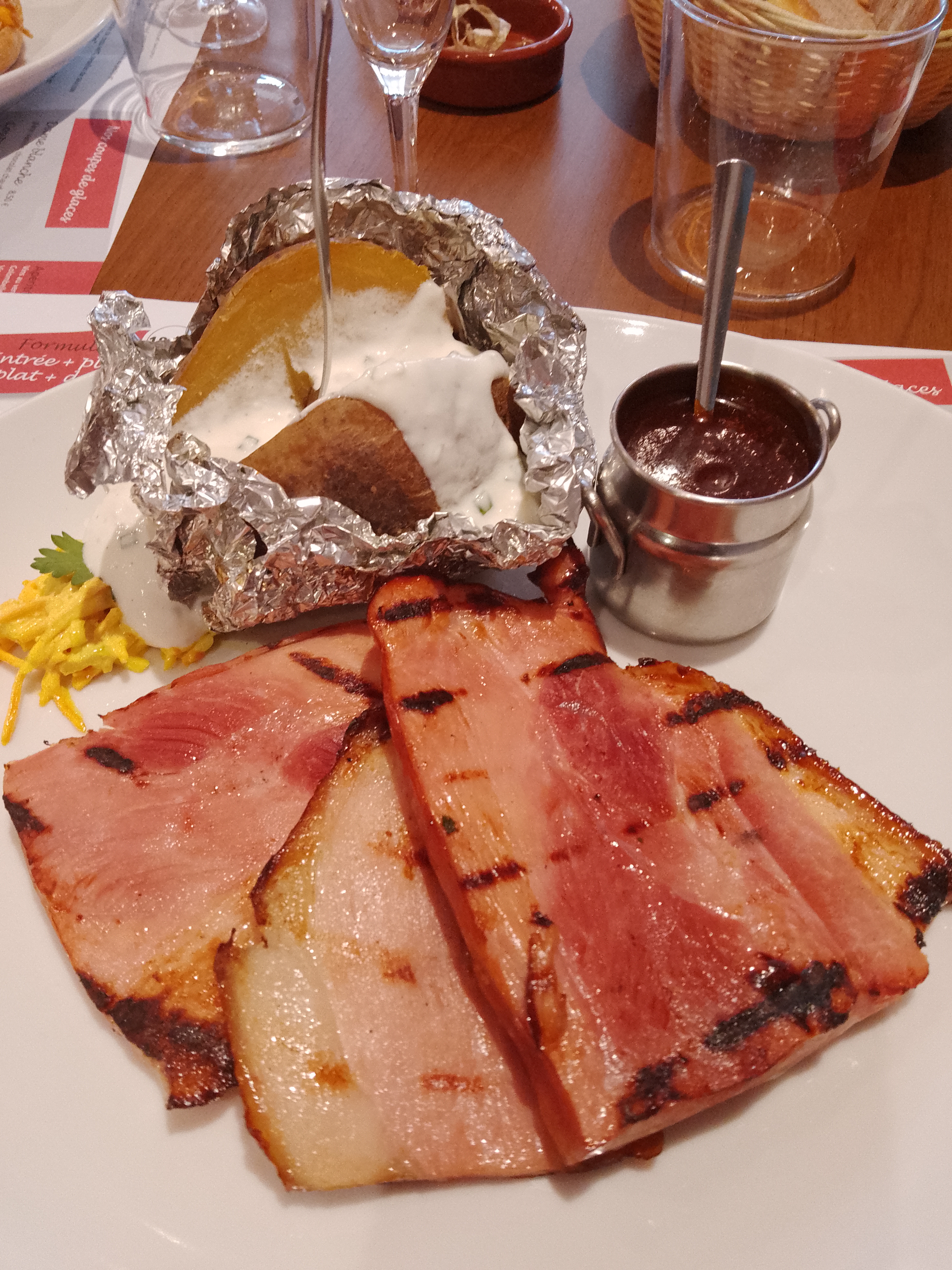 Très déçu par ce repas. Pour mon amie, patate à la braise servie presque froide et datant de plusieurs jours, pour moi très peu de haricots accompagnant le jarret braisé et en dessert mon baba au rhum n'avait pas du tout de rhum même s'il en avait la couleur par contre avait un léger goût de café d'où très certainement cette couleur ambrée. Après remarque auprès de la serveuse n'a pas semblé étonnée... Et bien sûr aucun geste commercial...