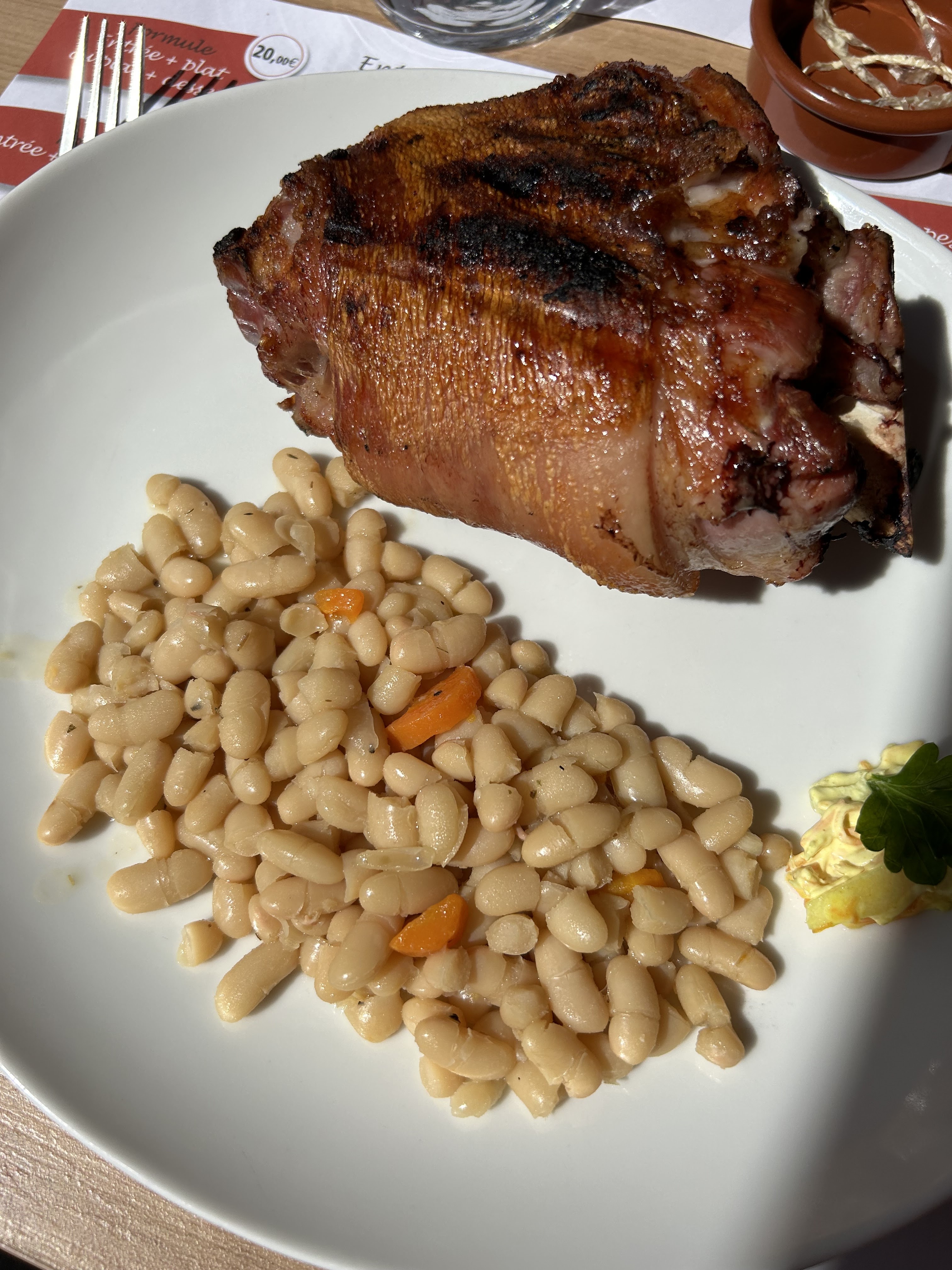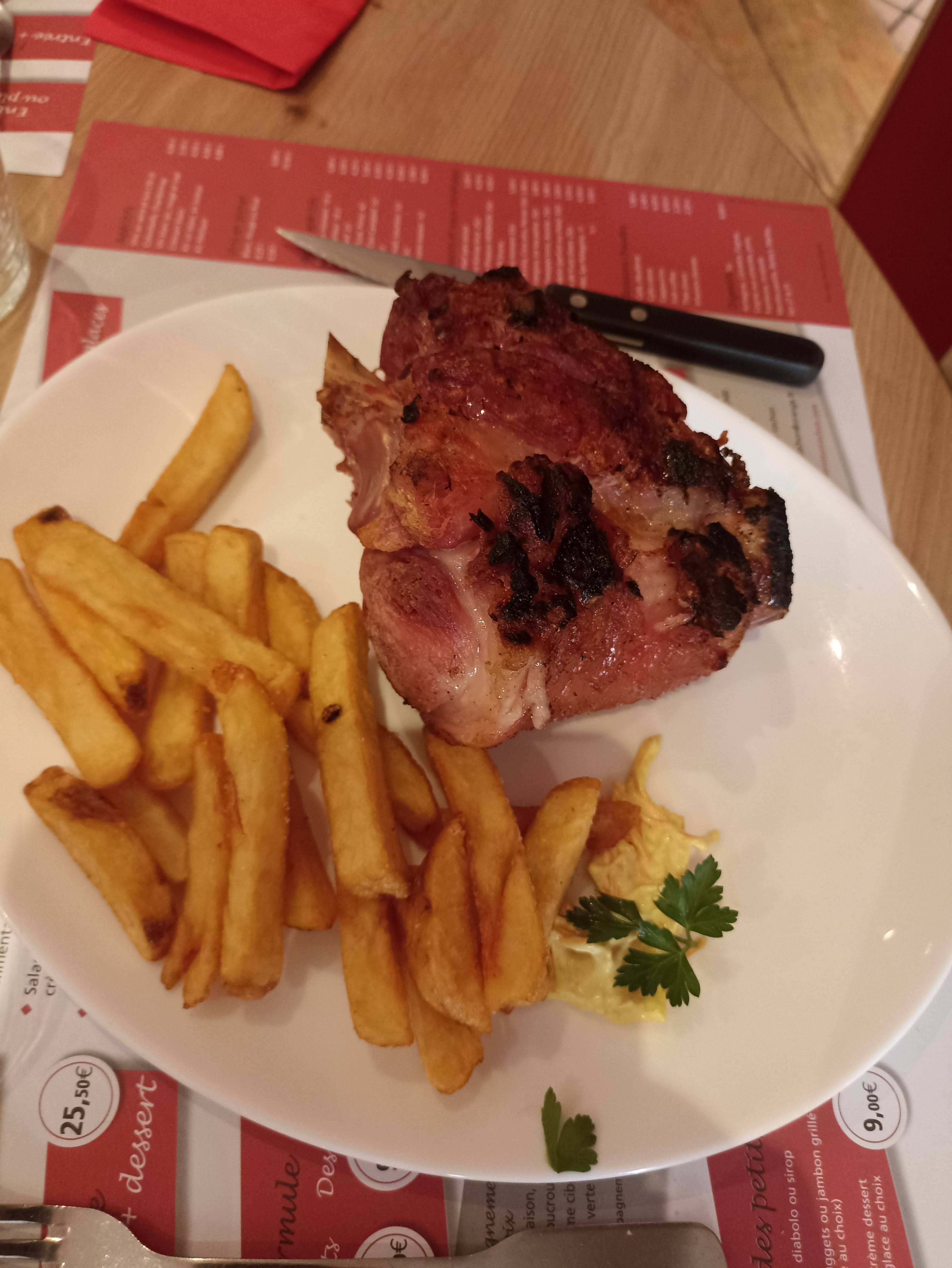 Bof...jarret de cochon bof mais copieux. Frites sèches et dessert cheese cake étouffe chrétien. Plat + dessert pour 24€.