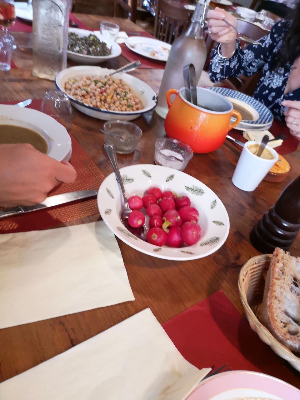 une table d hotes comme chez un hote table unique avec les entrees posees dessus vous vous changez les assietes ....on se sert du plat principal on se coupe le pain COMME A LA MAISON