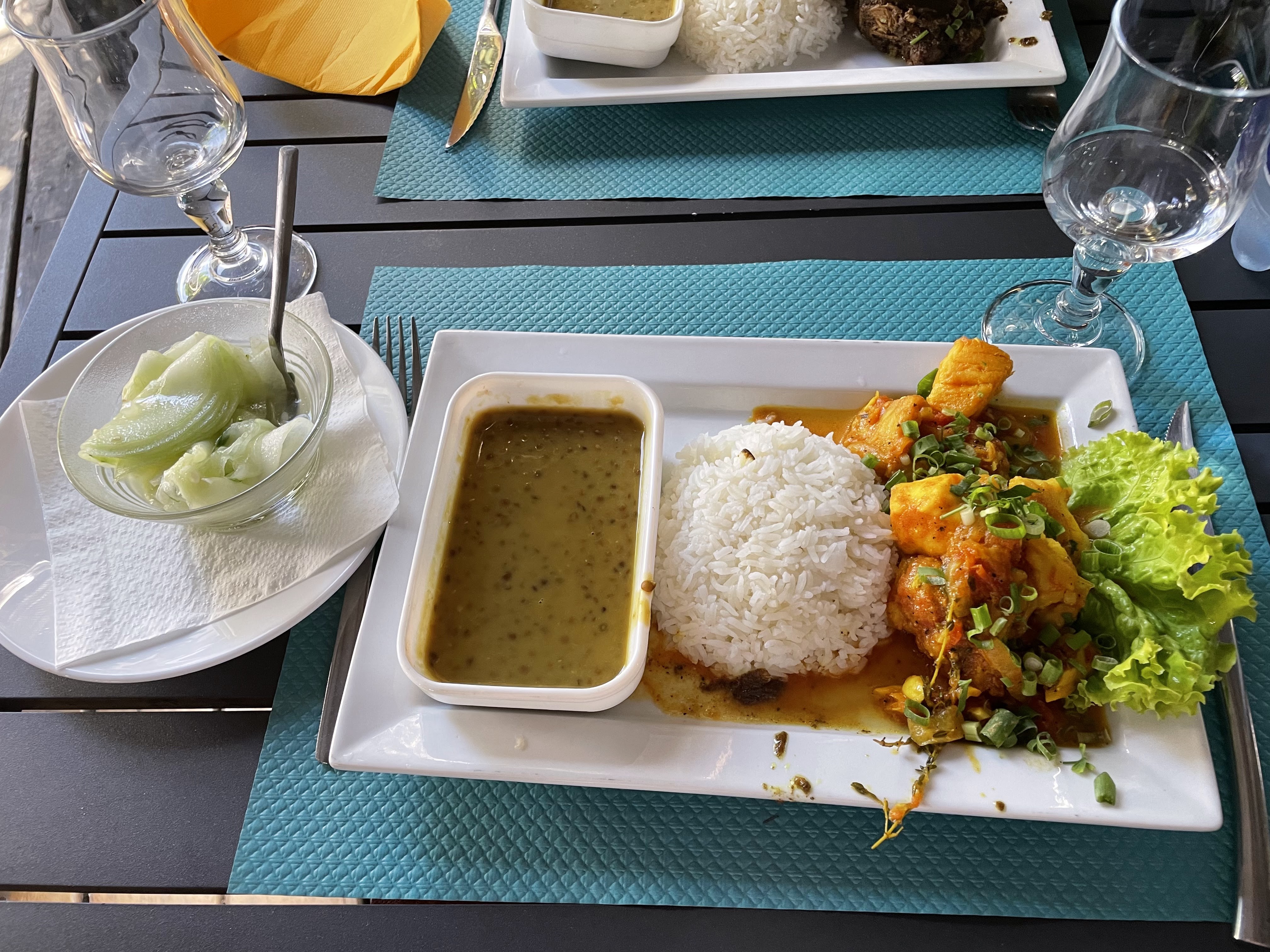 On etait 3 sur 4 à pas manger de viande, on avait pas le choix, un seul plat de poisson, un carry poisson sans plus. Entrée servi en même temps que le plat c'est quoi cette histoire... riz pas cuit, service froid et expéditif.. Le gratin palmiste était bon.