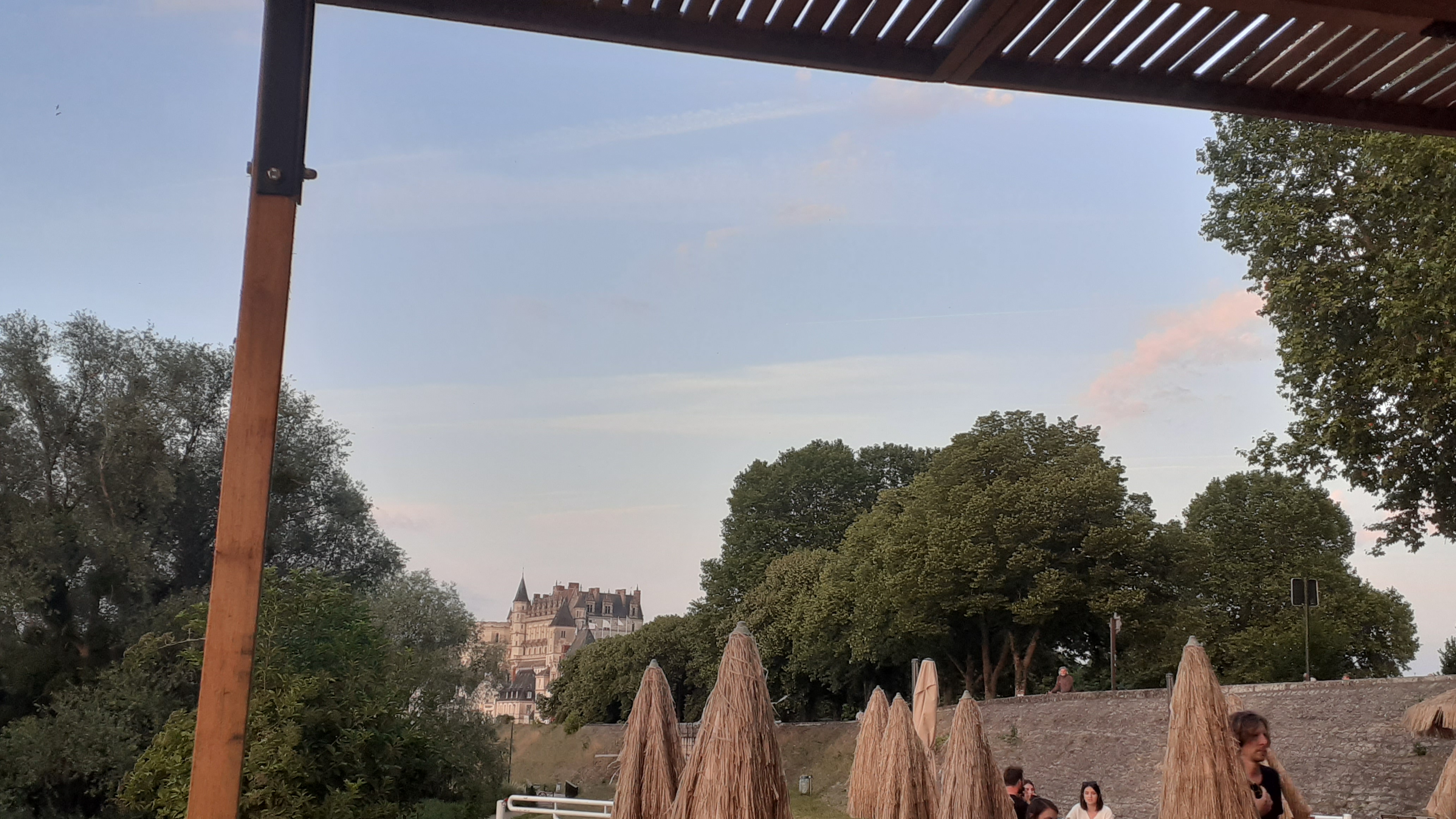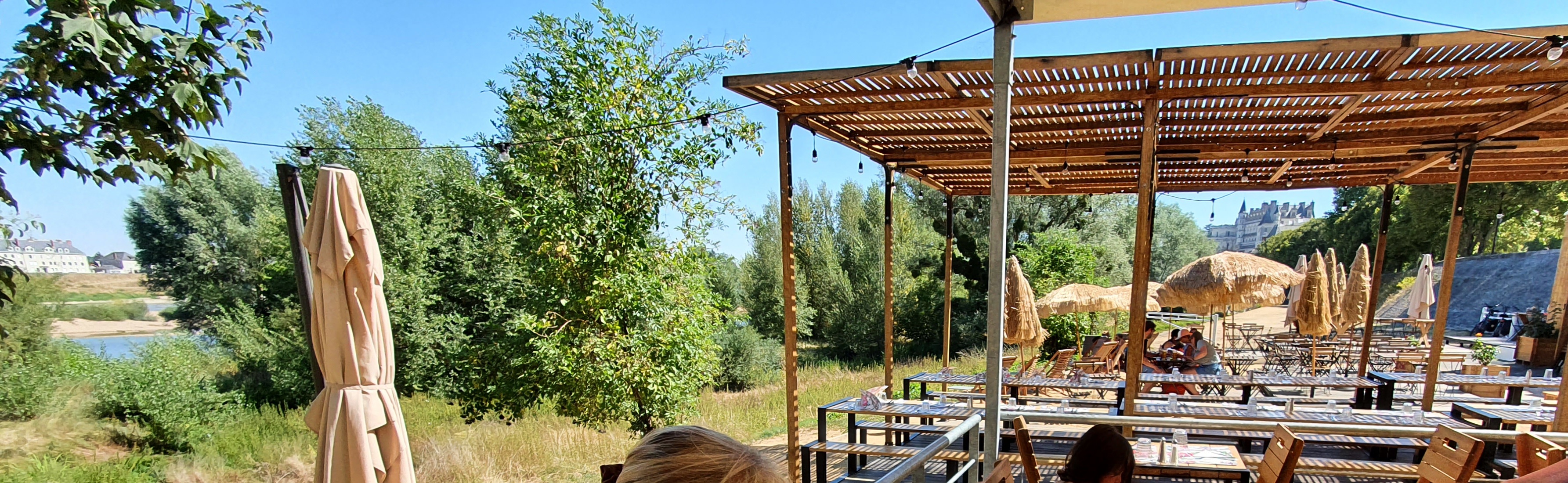 On a trouvé par hasard à l entree du parking, la déco vous emporte en vacances avec des parasols en paille, du sable sous les pieds, une belle vue sur le château d amboise et les montgolfières qu ils s envolent juste de l autre cote de la rive